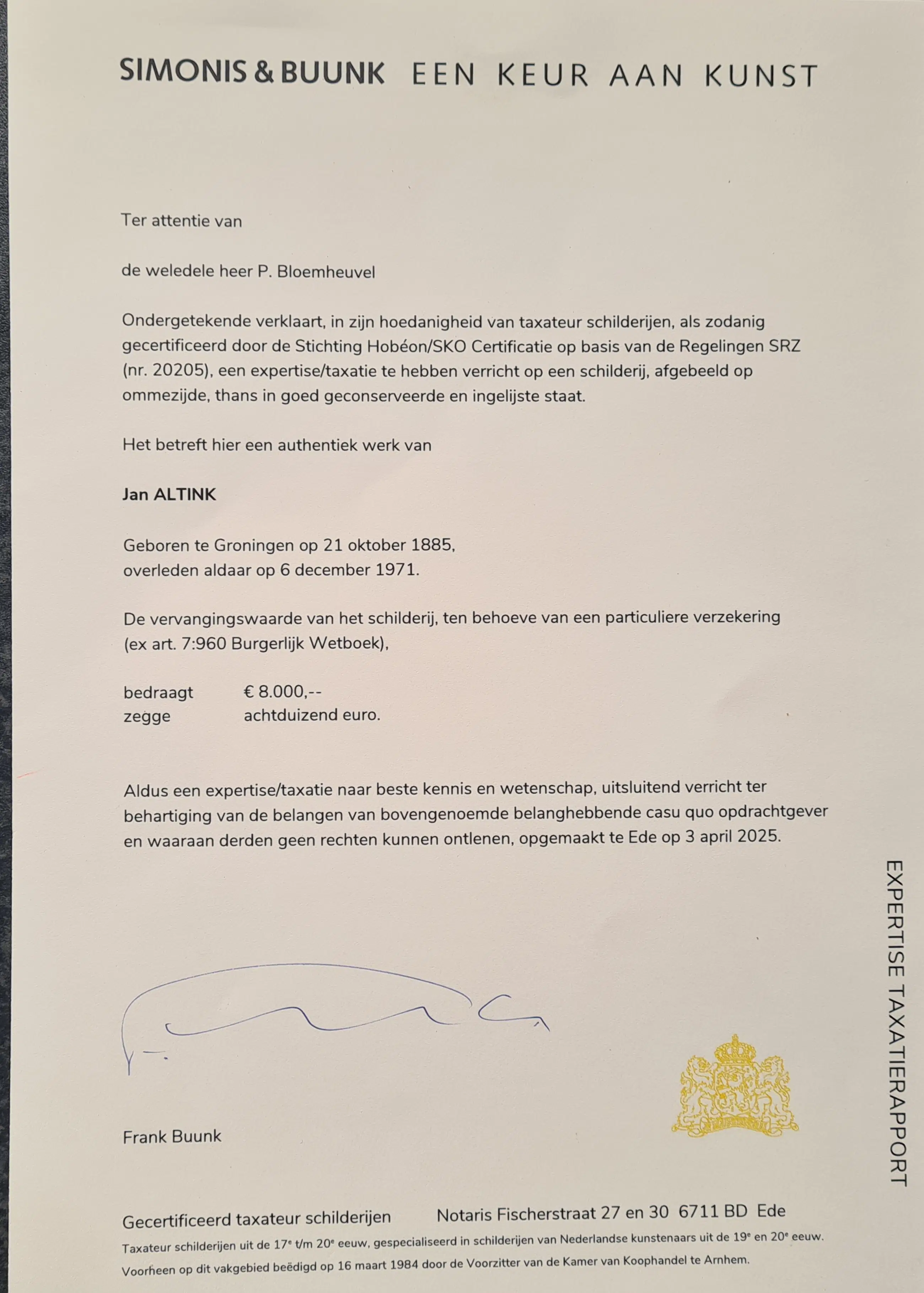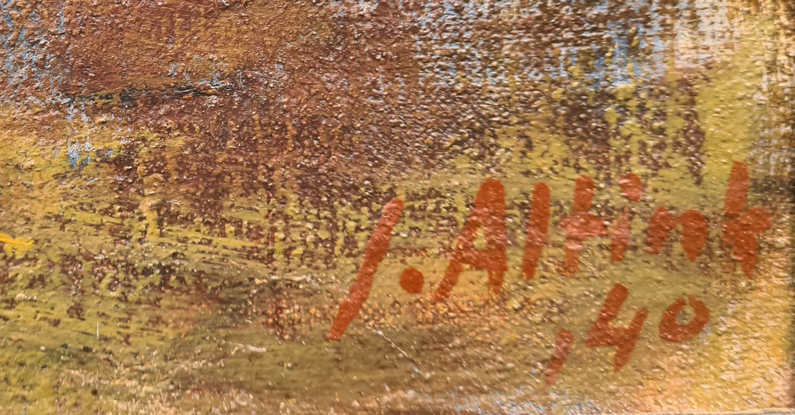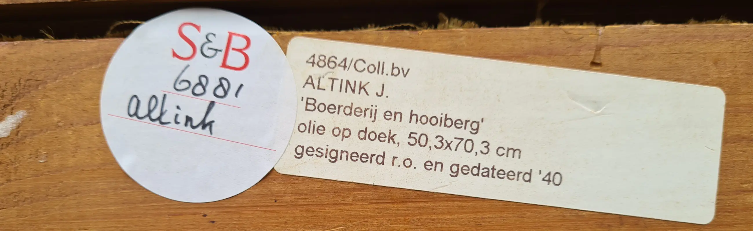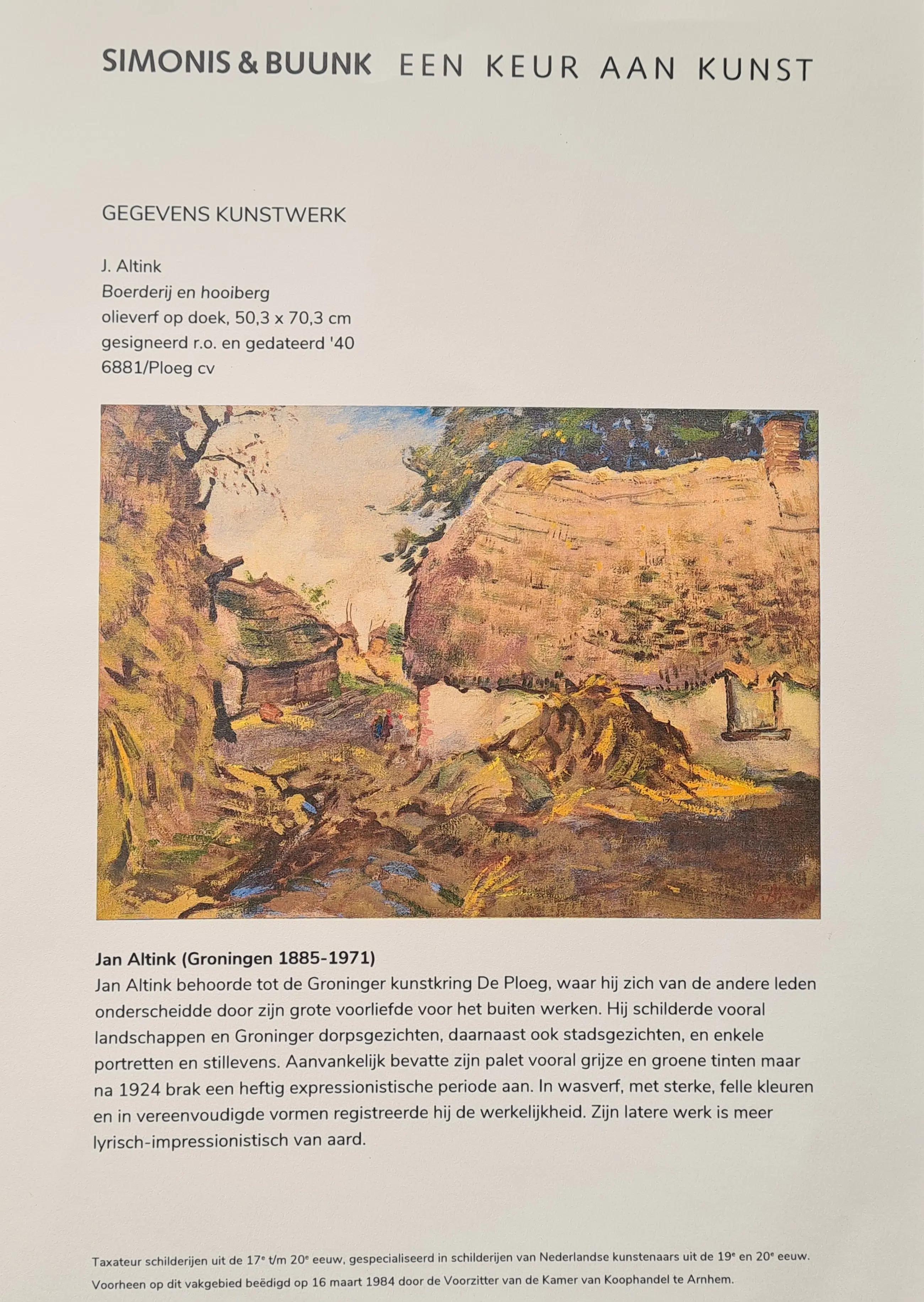 Schilderij van Jan Altink van een boerderij en schuur en 2 hooischuren ( steltenberg) op de achtergrond. Er werd/wordt wel eens gesuggereerd dat hij hier misschien wel geboren is. Essen is in de loop der jaren ondergegaan in de stad Groningen. De provenance van het werk is S&B = Simonis & Buunk en is voorzien van een taxatierapport van hun. Het werk komt het best tot zijn recht in een lichte omgeving of met een spotlight er op. Rechtsonder gesigneerd en gedateerd zit in een kostbare PGL = Paul Gehring lijst. Qua leeftijd is het werk in prima staat inmiddels 85 jaar oud.