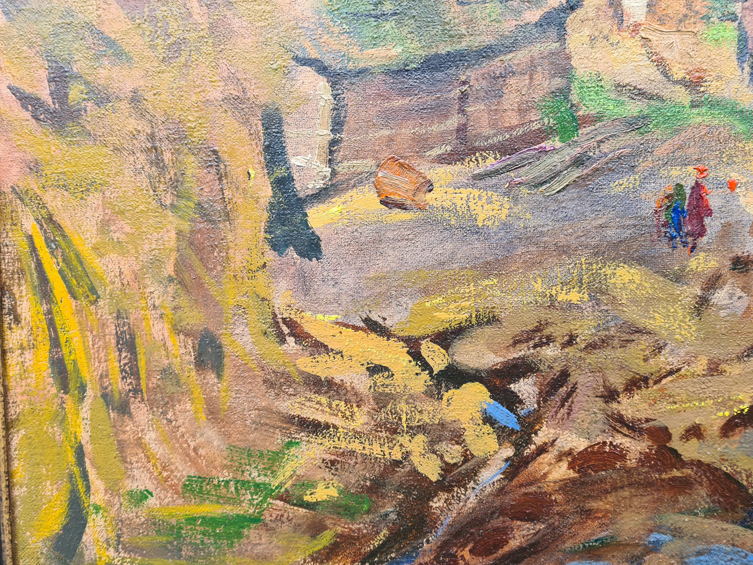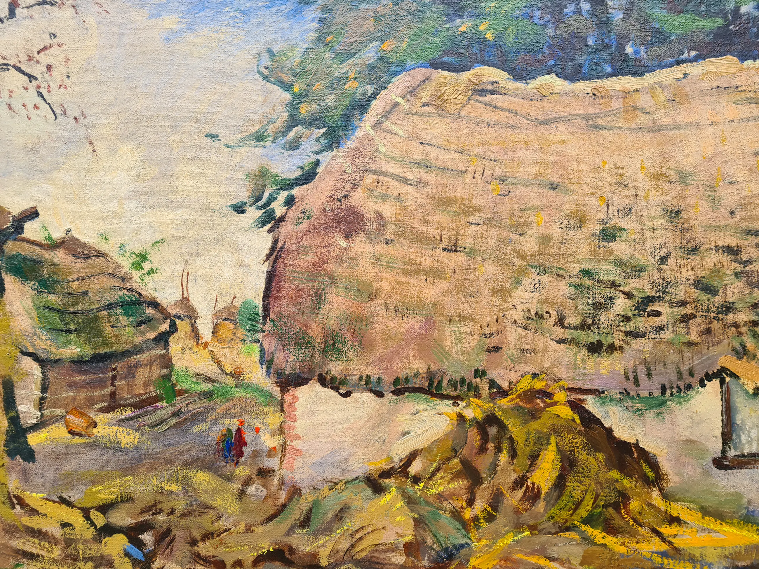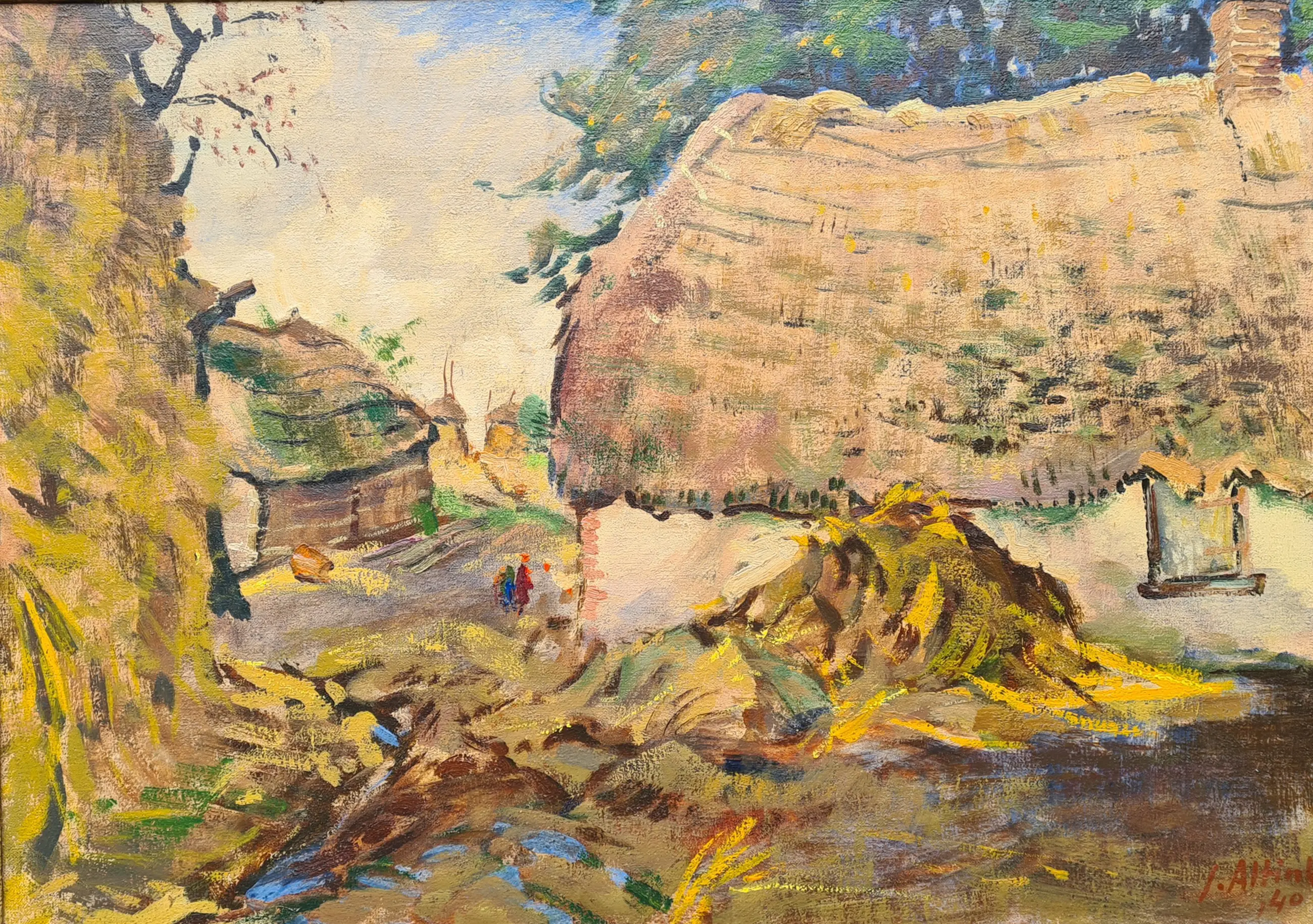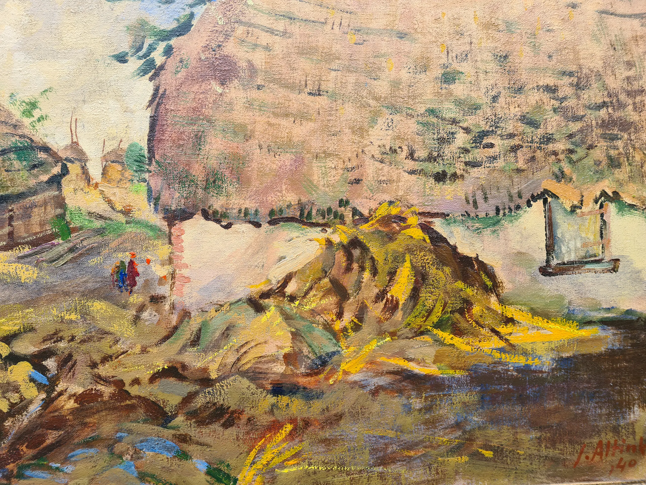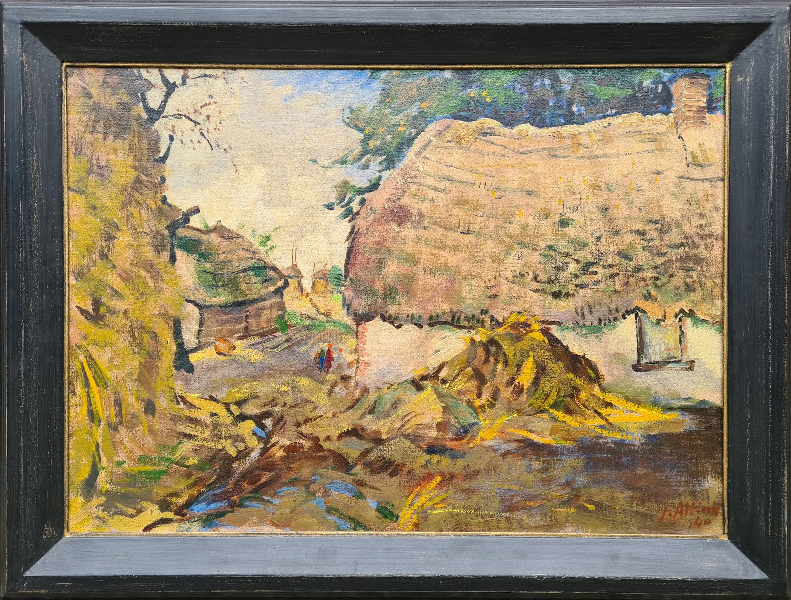 Schilderij van Jan Altink van een boerderij en schuur en 2 hooischuren ( steltenberg) op de achtergrond. Er werd/wordt wel eens gesuggereerd dat hij hier misschien wel geboren is. Essen is in de loop der jaren ondergegaan in de stad Groningen. De provenance van het werk is S&B = Simonis & Buunk en is voorzien van een taxatierapport van hun. Het werk komt het best tot zijn recht in een lichte omgeving of met een spotlight er op. Rechtsonder gesigneerd en gedateerd zit in een kostbare PGL = Paul Gehring lijst. Qua leeftijd is het werk in prima staat inmiddels 85 jaar oud.