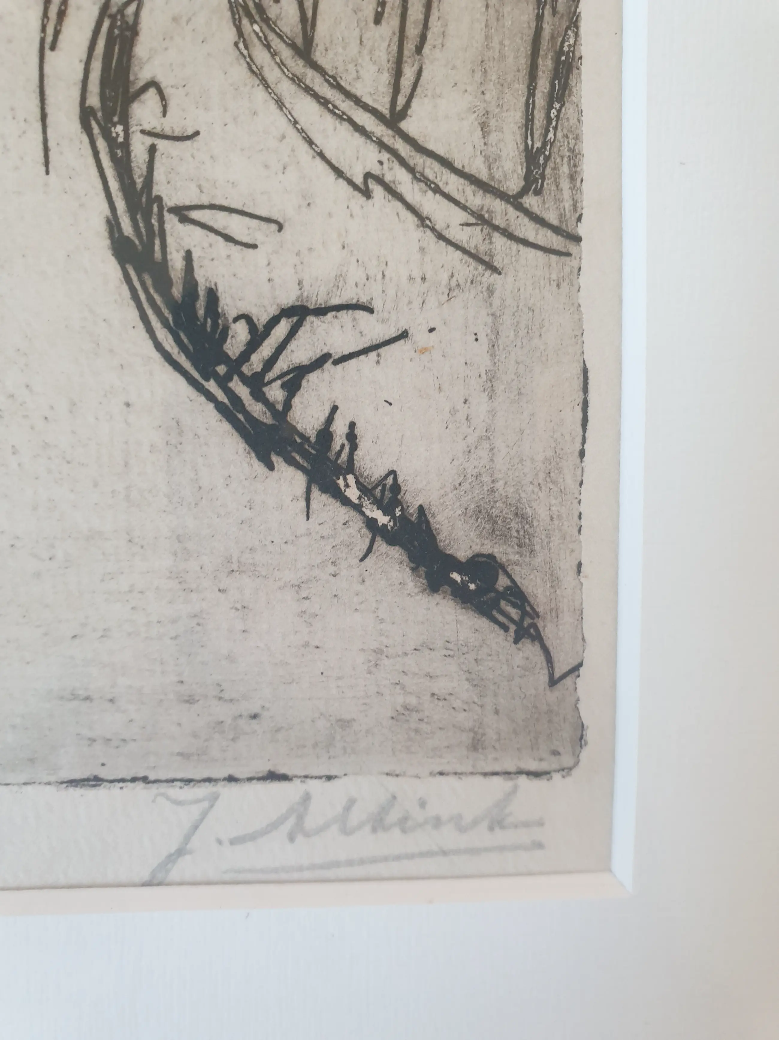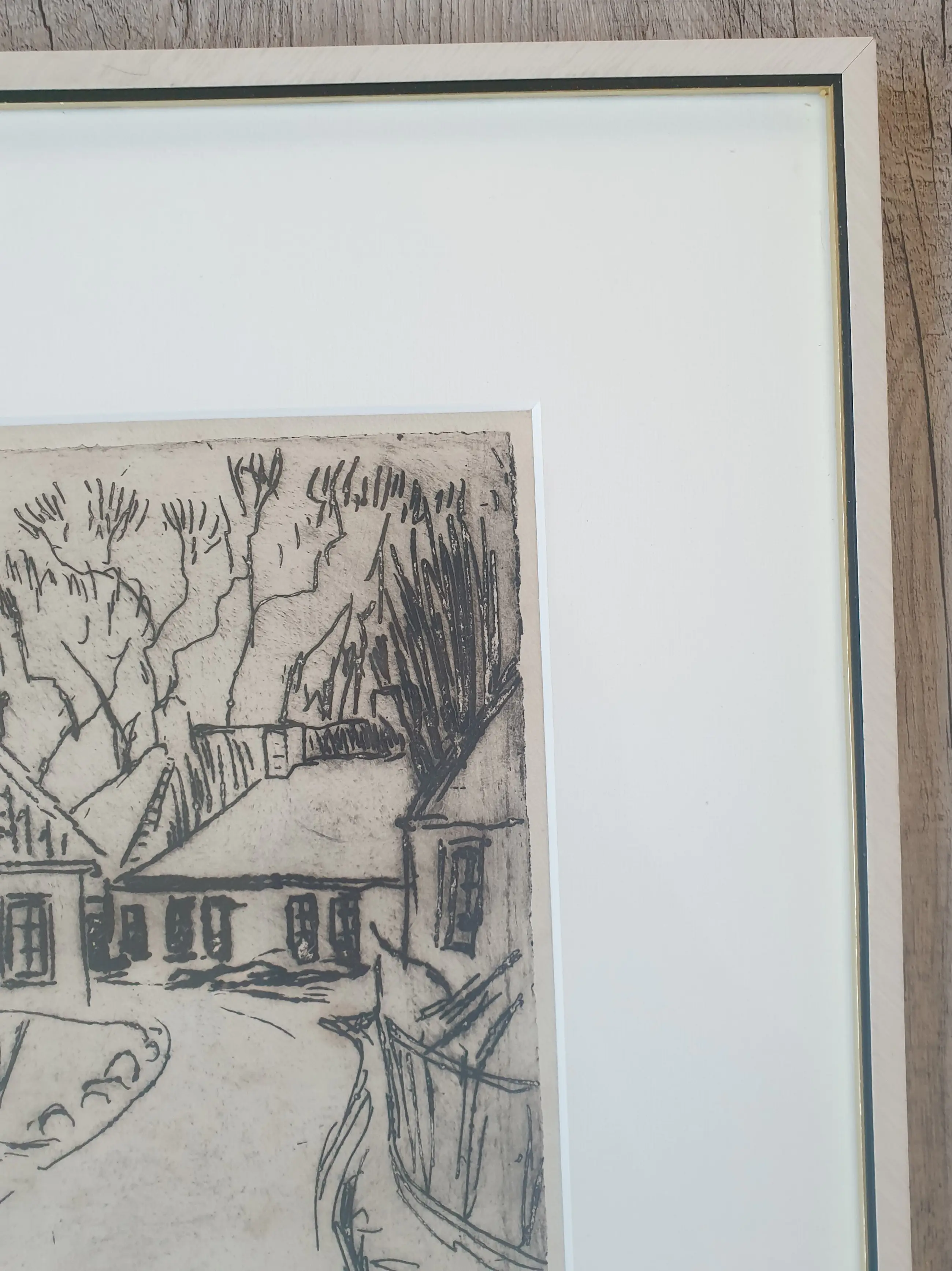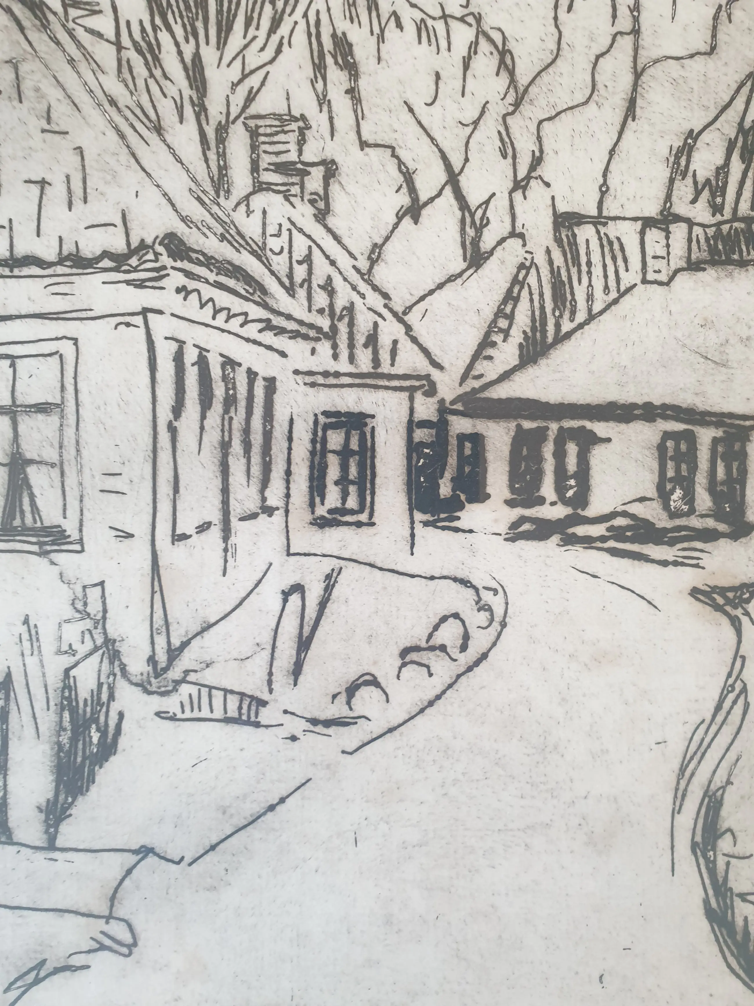 Jan Altink (1885-1971) Een straatje in "Aduard" Gesigneerd in potlood 'J. Altink' (rechtsonder) Ets en droge naald op papier, Afmeting lijst : met lijst: 43x36 cm Afmeting beeld : 27x21 cm