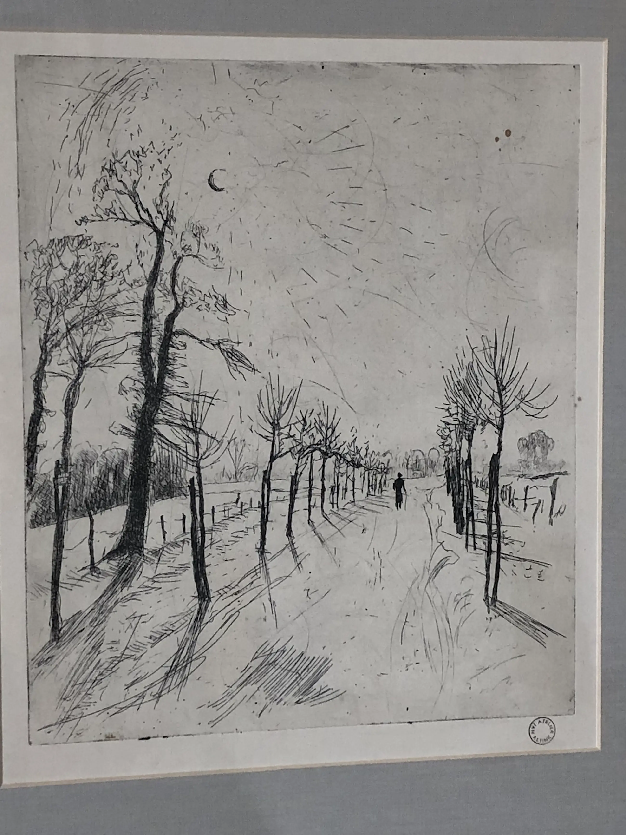Prachtige ets van Jan Altink "Laantje met wandelaar"