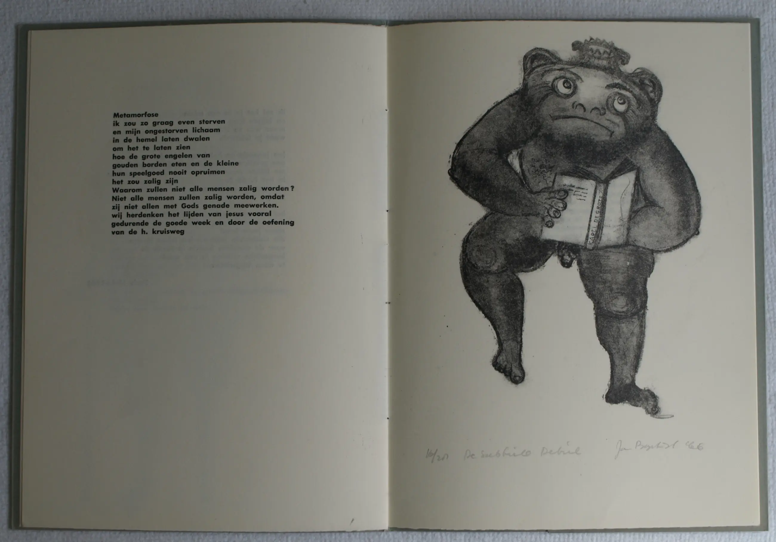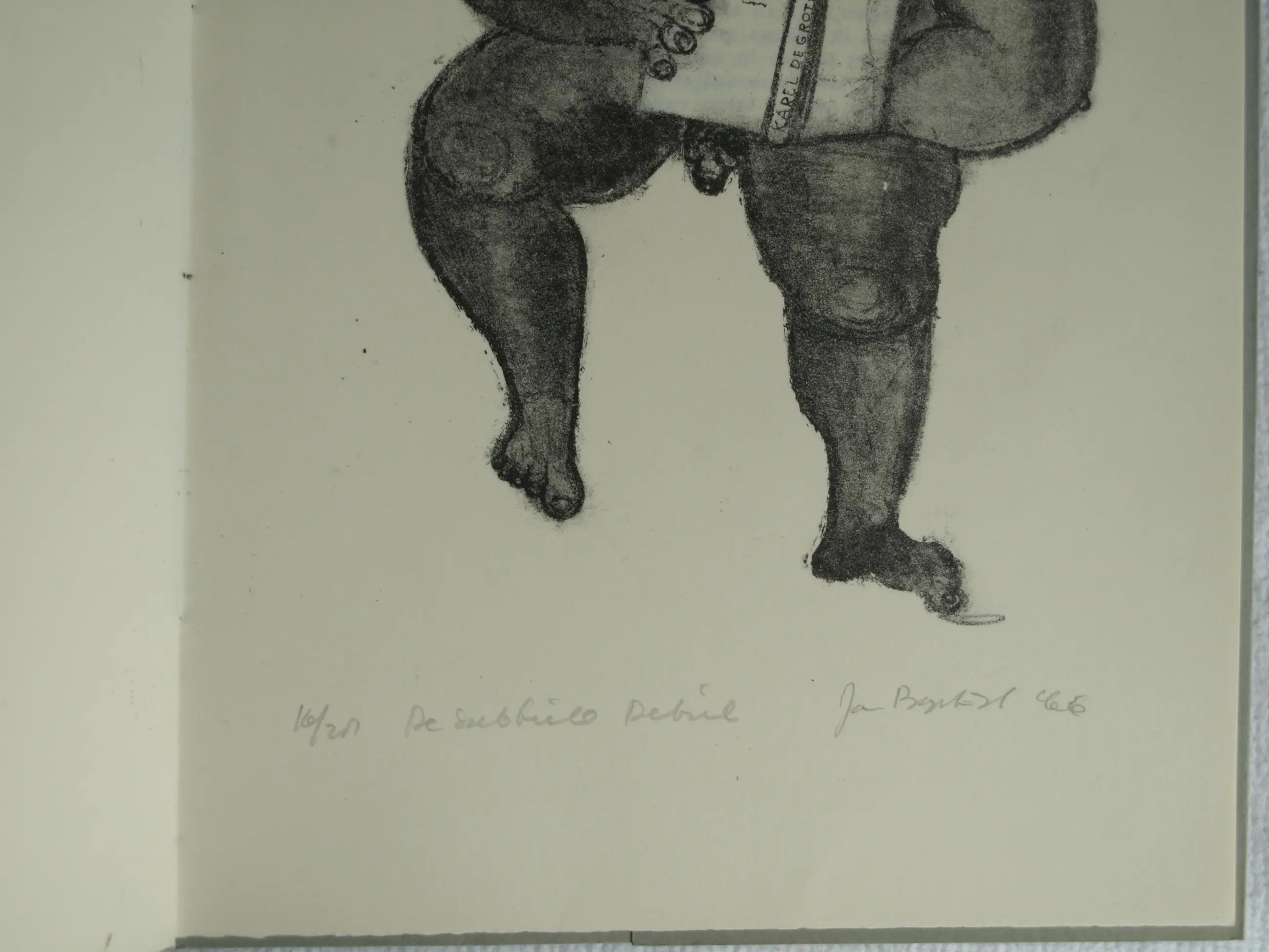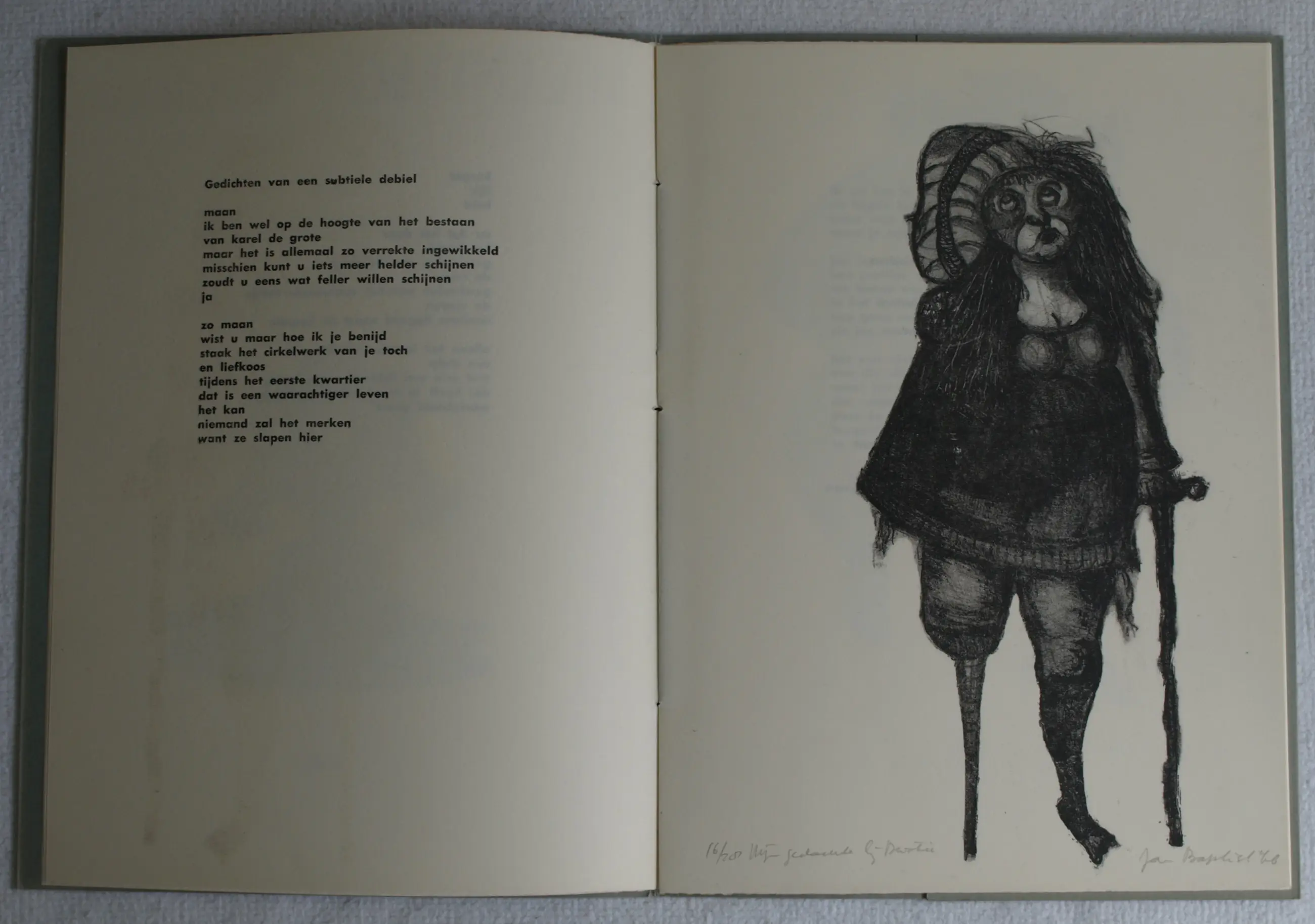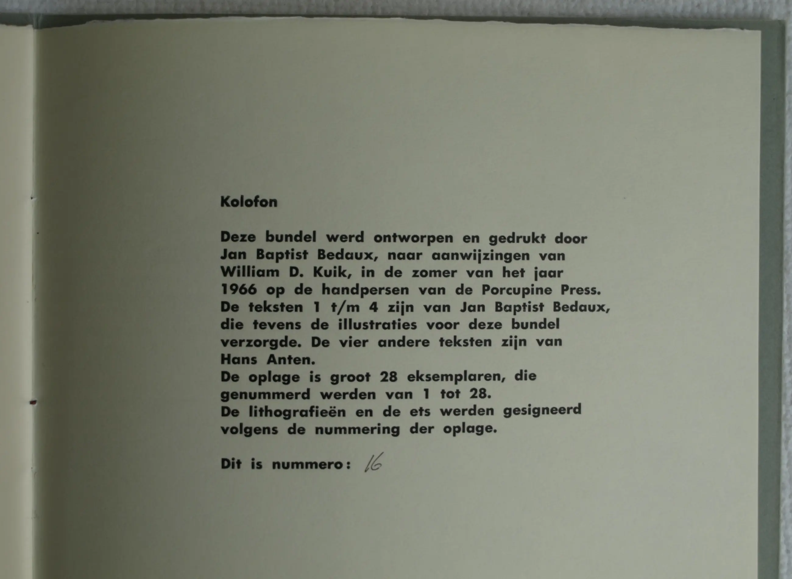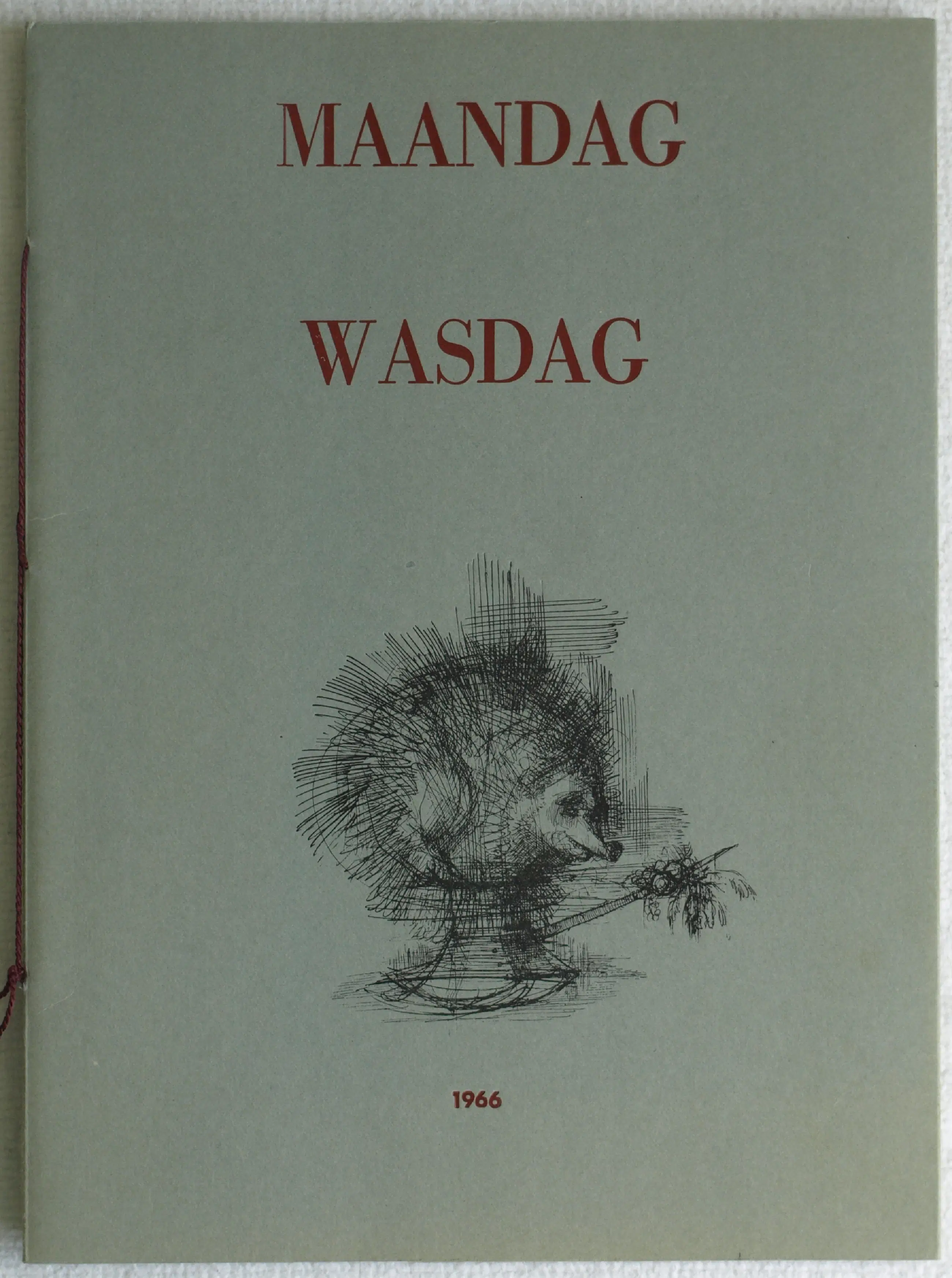 Deze poëziebundel "Maandag Wasdag" uit 1966 is een bibliofiele uitgave waarvan slechts 28 exemplaren gedrukt zijn op de persen van het Grafisch Gezelschap De Luis. Dit is nr. 16. -In de bundel staan 3 lithografiëen en 1 ets, gemaakt door de Nederlandse kunsthistoricus, conservator, grafisch ontwerper, kunstexpert, kunstverzamelaar en galeriehouder Jan Baptist Bedaux (1947), gesigneerd en genummerd met potlood. -Op het omslag staat een clichédruk van de pentekening ‘Egeltje’ van Dirkje Kuik (1929-2008). Deze tekening staat ook vermeld in het boek “Grafisch Gezelschap De Luis 1960-1980: individualisten in clubverband”, uit 2008 (ISBN 978-90-809025-4-1). -In de bundel staan 4 gedichten van Jan Baptist Bedaux en 4 gedichten van de Nederlandse literatuurtheoreticus en dichter Hans Anten. -Afmetingen poëziebundel: 32½ x 24 cm. -Aantal bladzijden: 20. -De 5 illustraties zijn respectievelijk 13 x 12½ cm, 4 x 3½ cm, 28½ x 13½ cm, 24 x 16 cm en 13 x 12½ cm. -Conditie: de Poëziebundel is in zeer goede staat. Zie ook de foto’s.