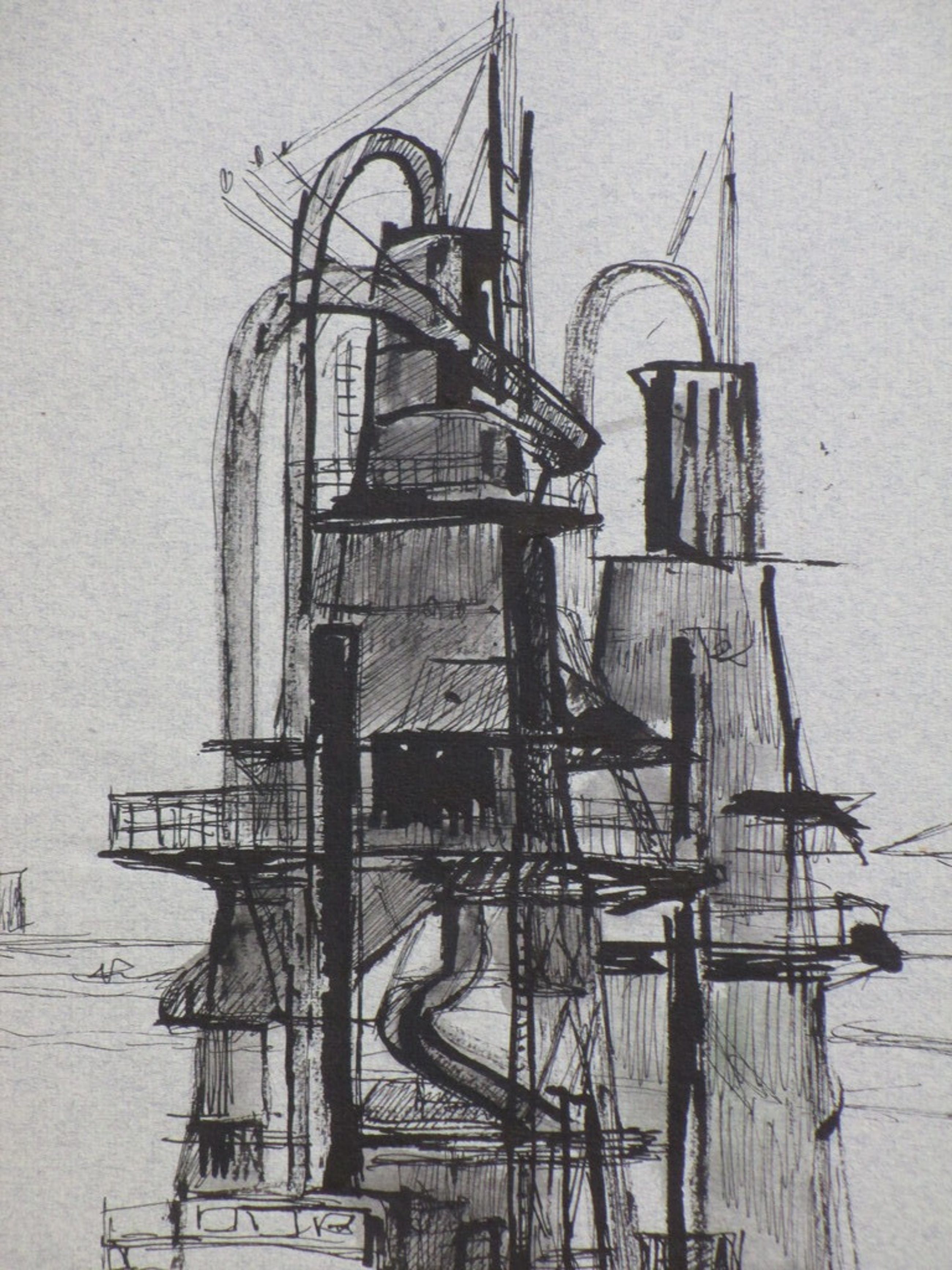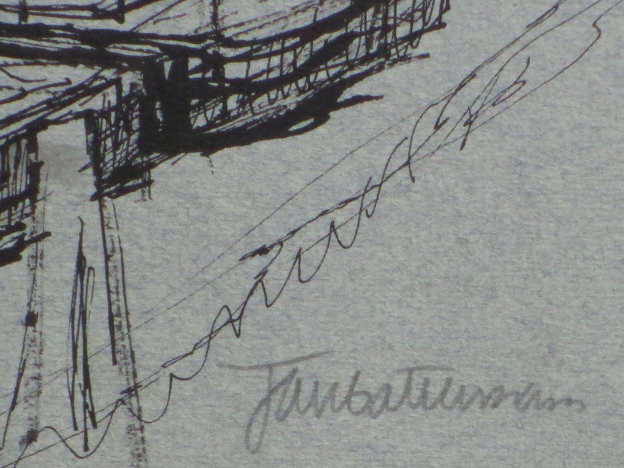 Inkttekening van havenbedrijvigheid door Jan Battermann