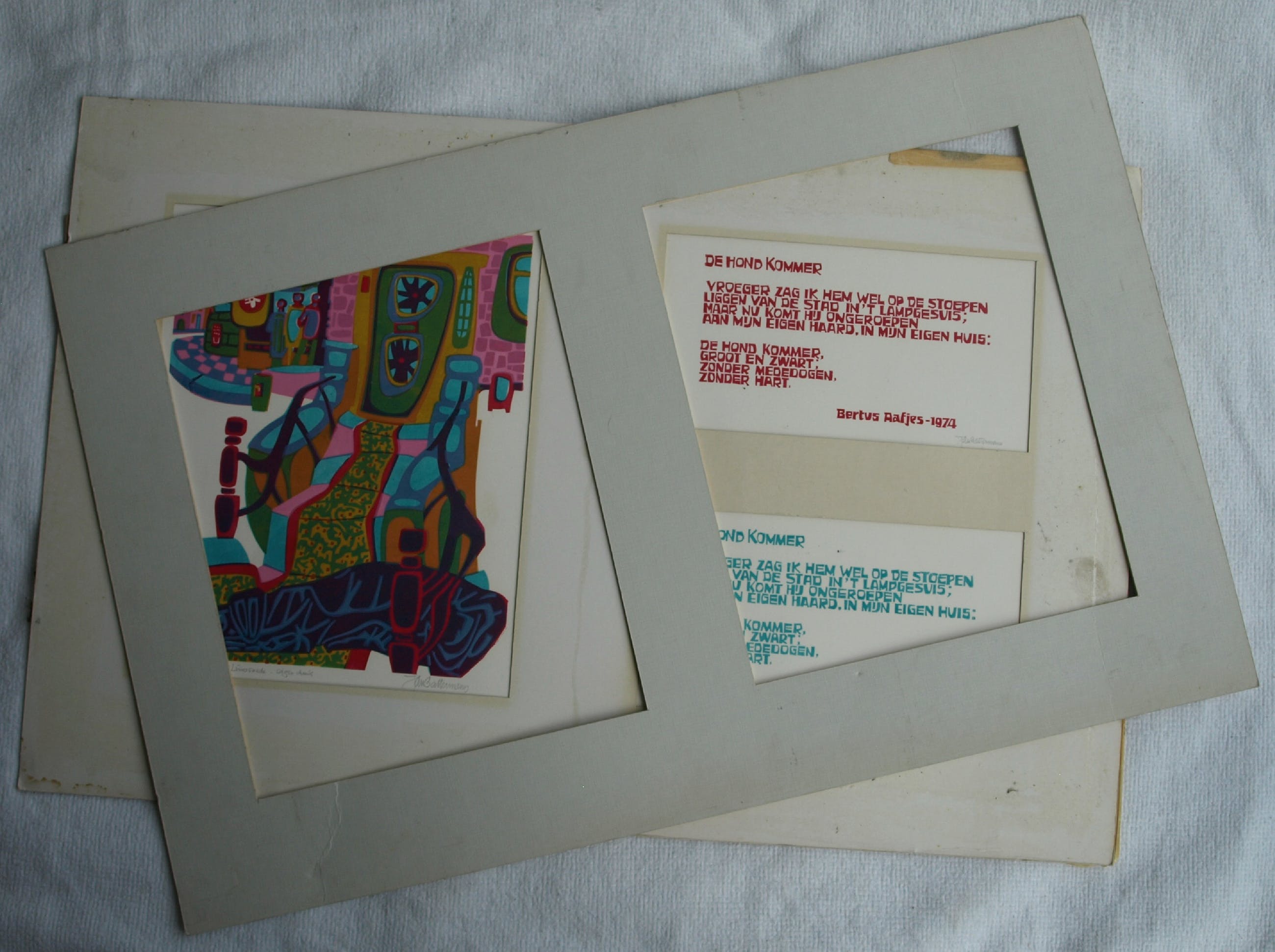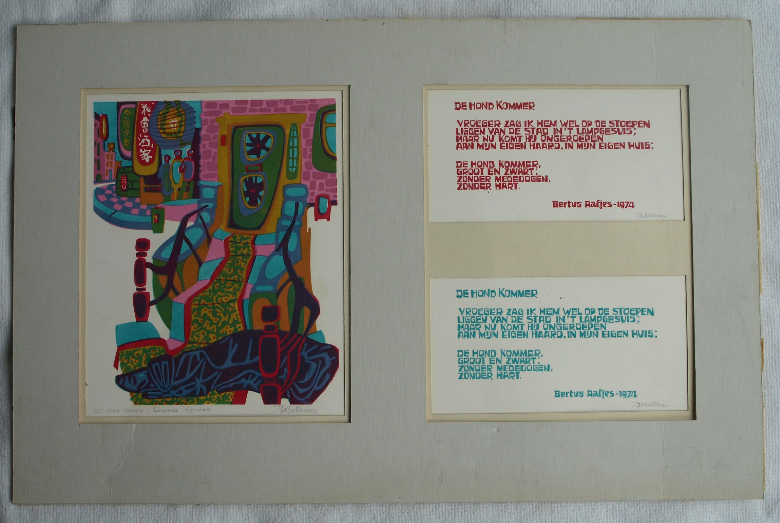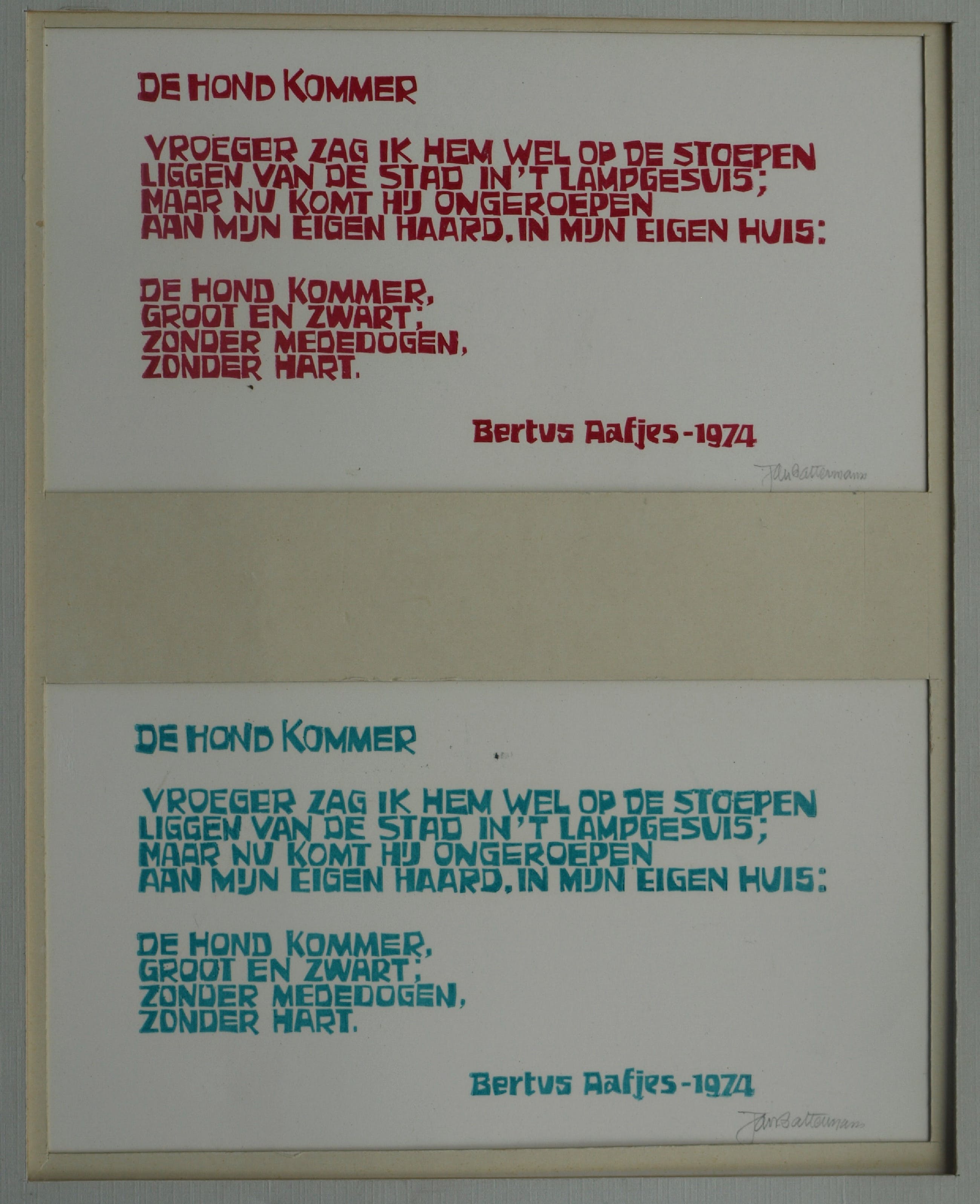 Een linosnede uit 1974 van de Nederlandse kunstenaar Jan Battermann (1909-1999), met een gedicht van de Nederlandse schrijver en dichter Bertus Aafjes (1914-1993), getiteld 'De hond Kommer’.