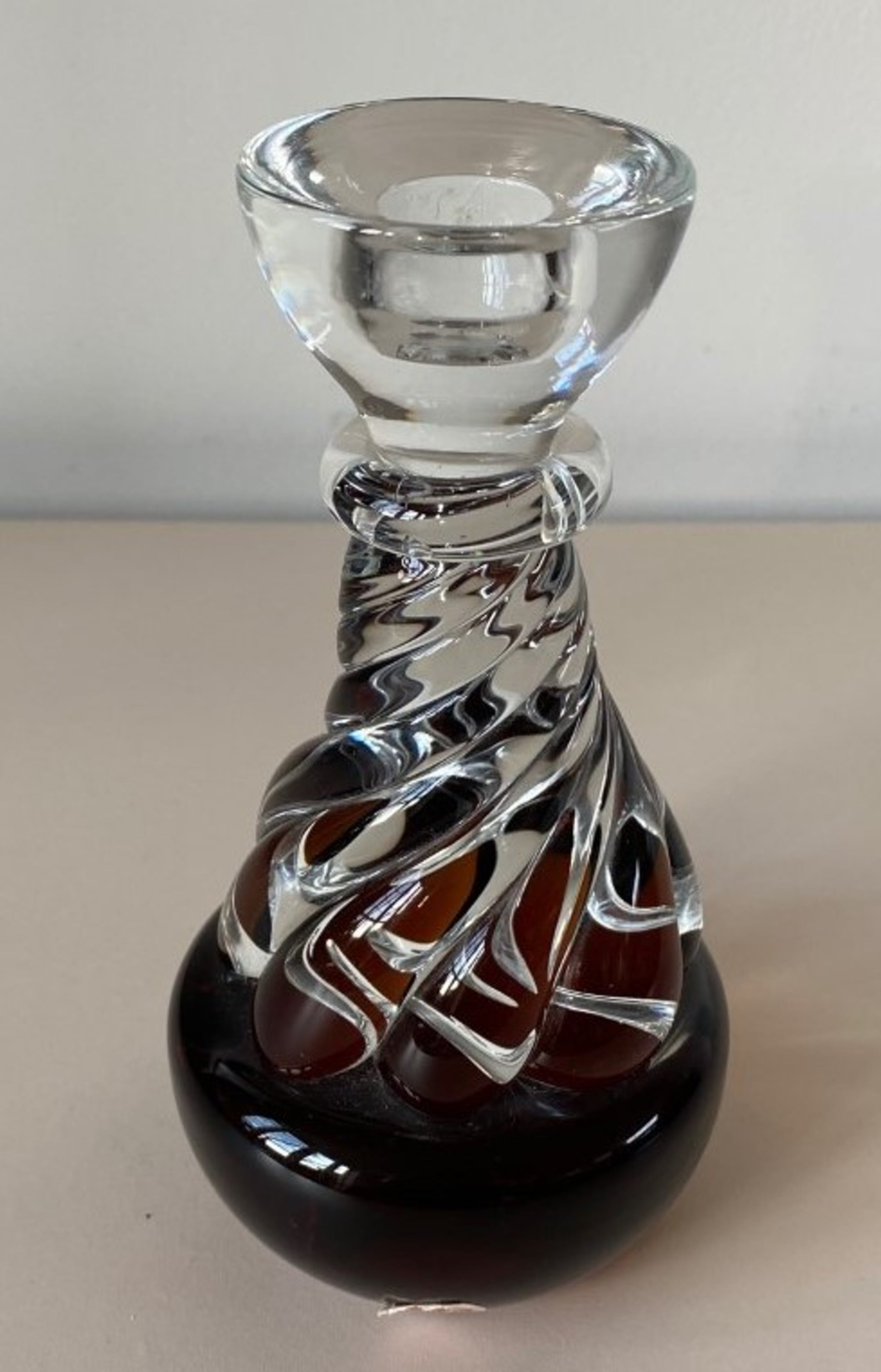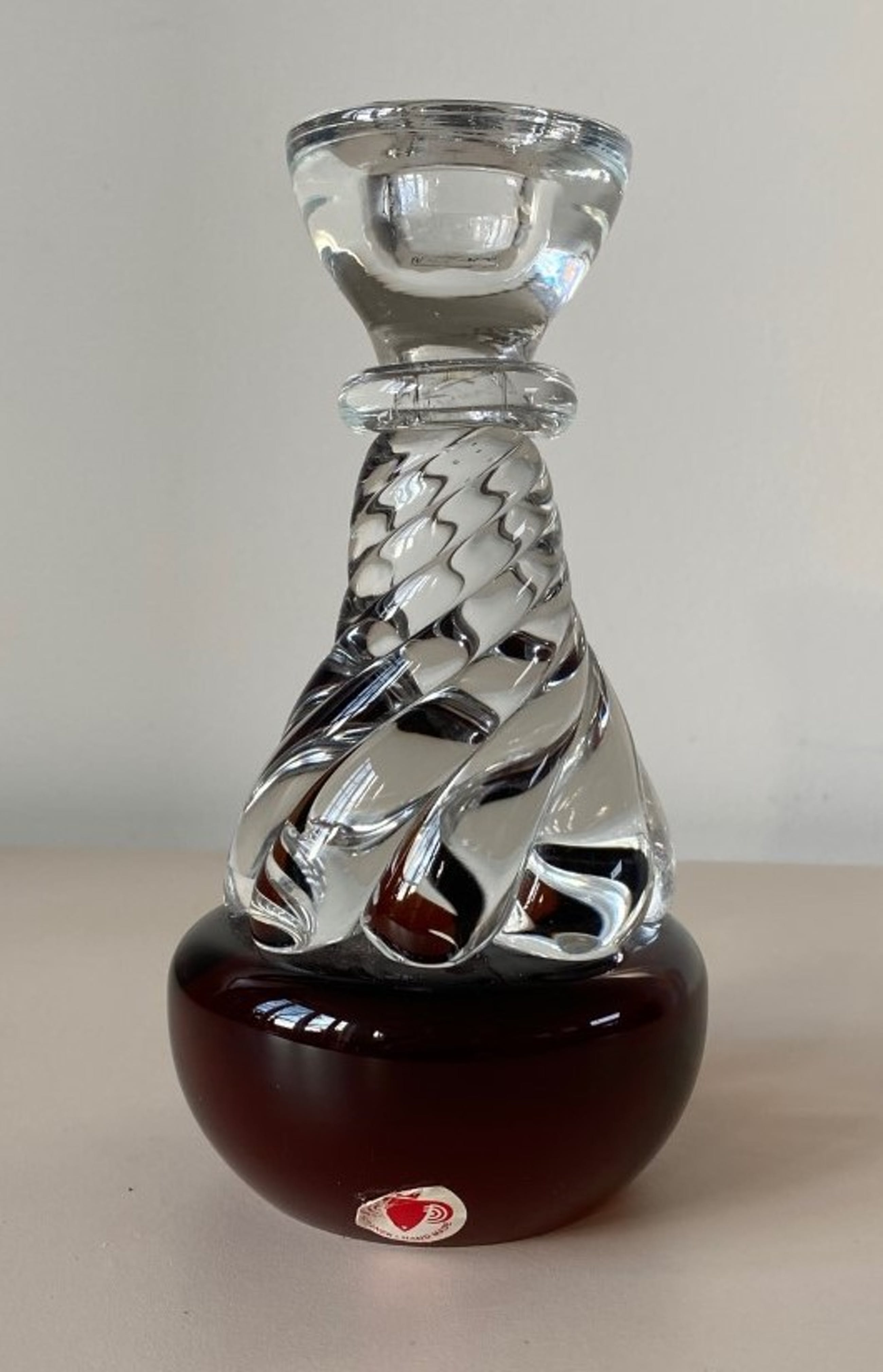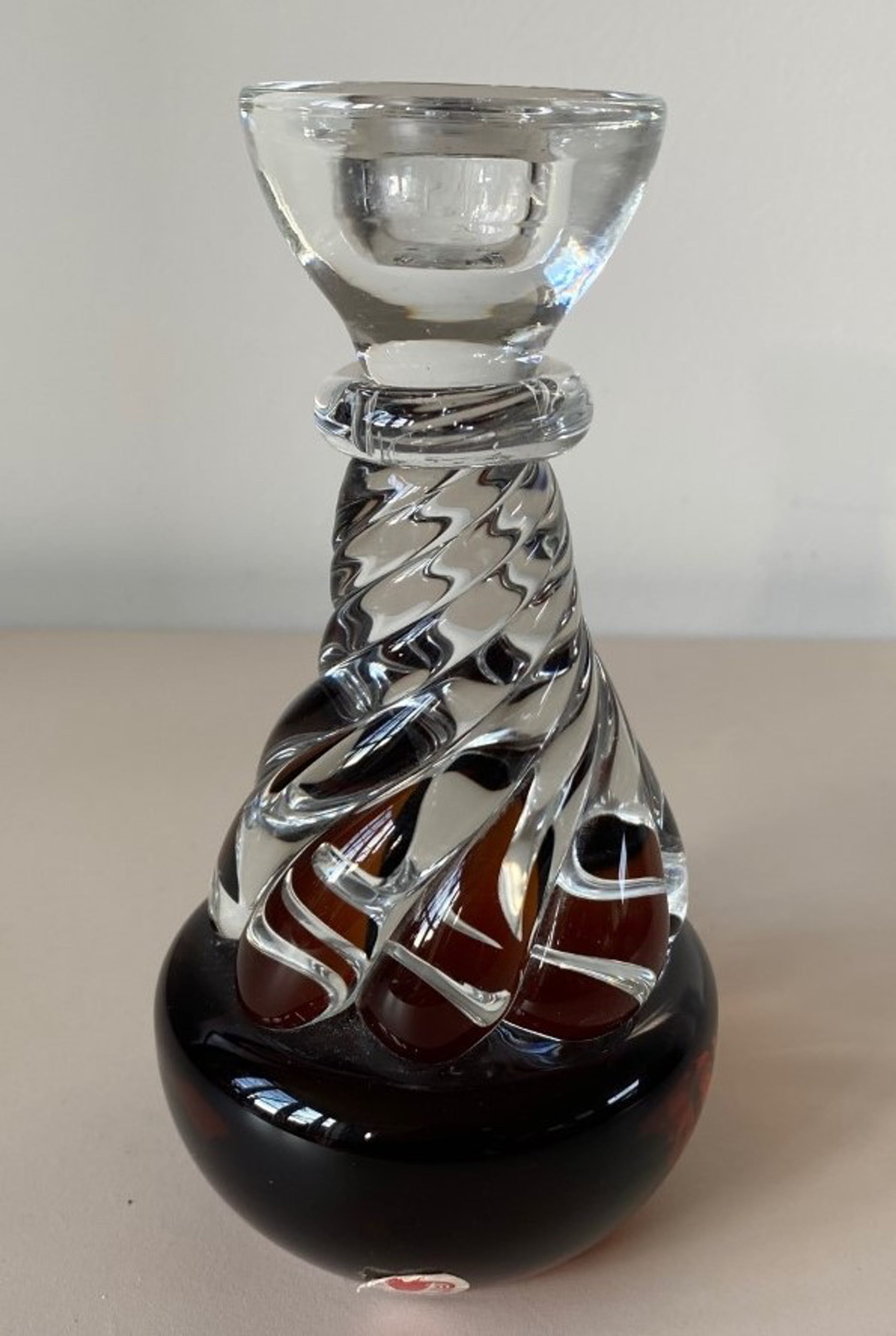 Studio glazen kandelaar met getordeerde blank glazen bovenzijde en massief bruin glazen voet uitgevoerd bij de glasstudio van Jan Beranek uit Skdlovice in Tsjechie. In prima onbeschadigde conditie en gemerkt met een papieren sticker.