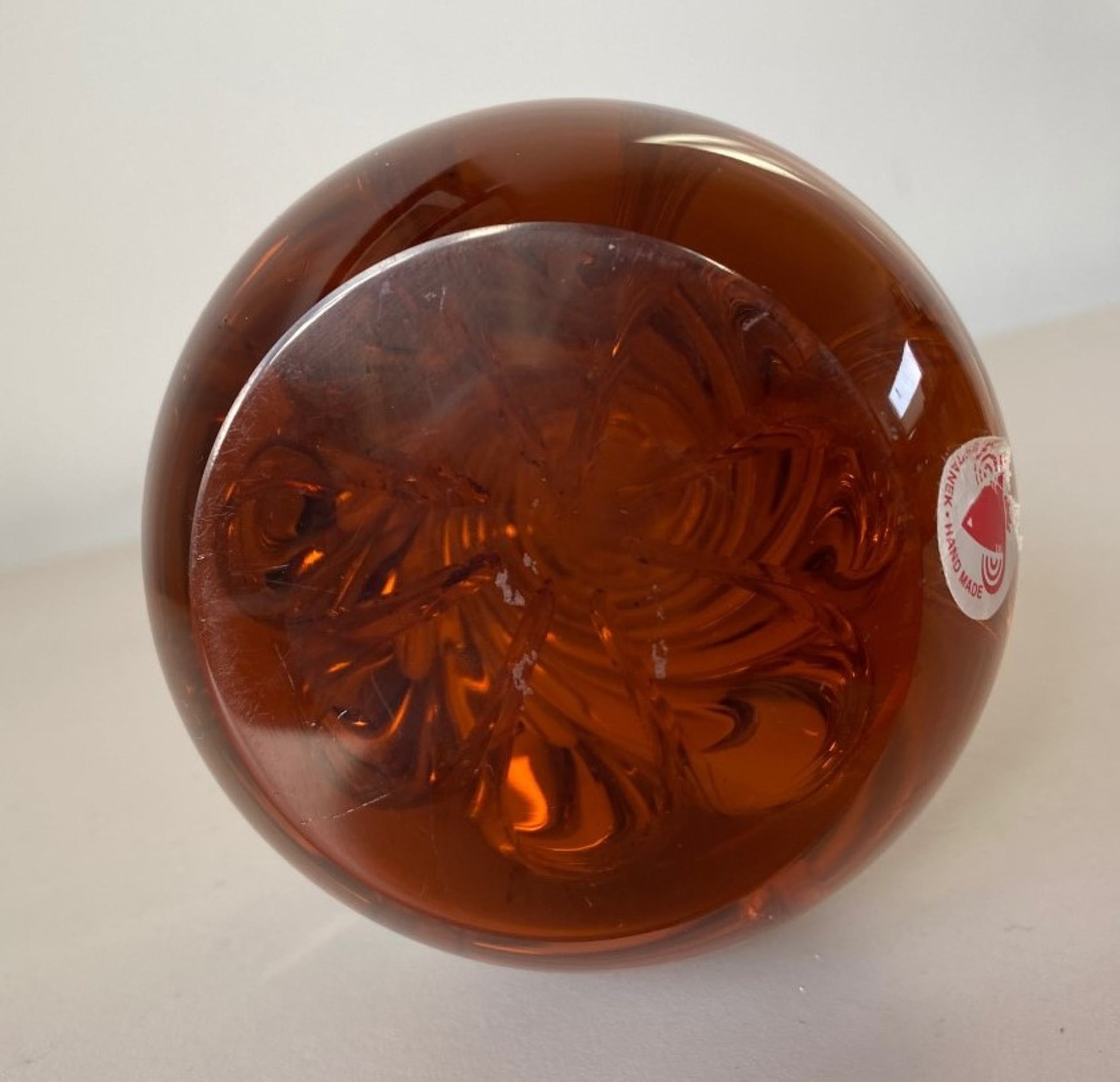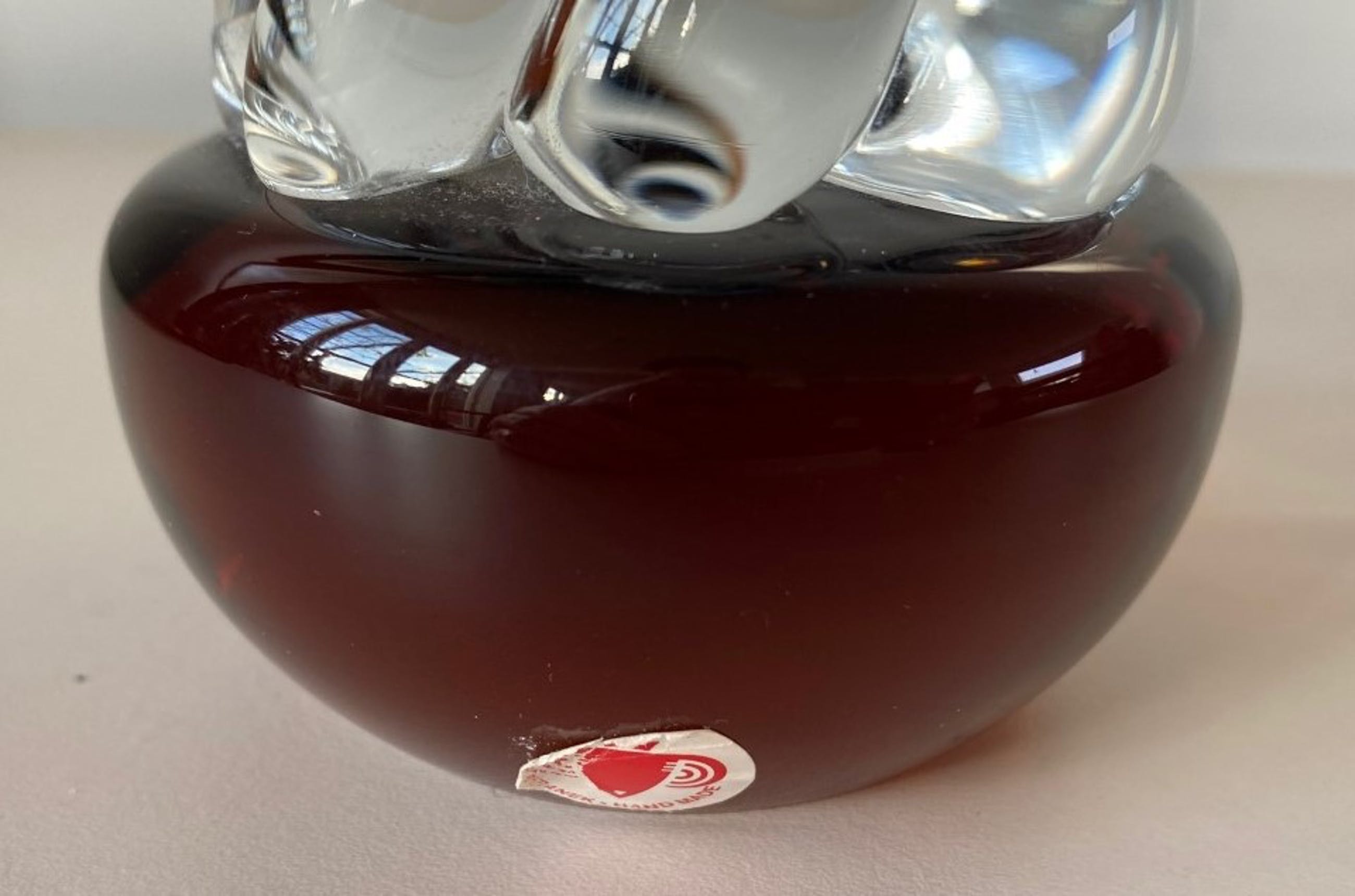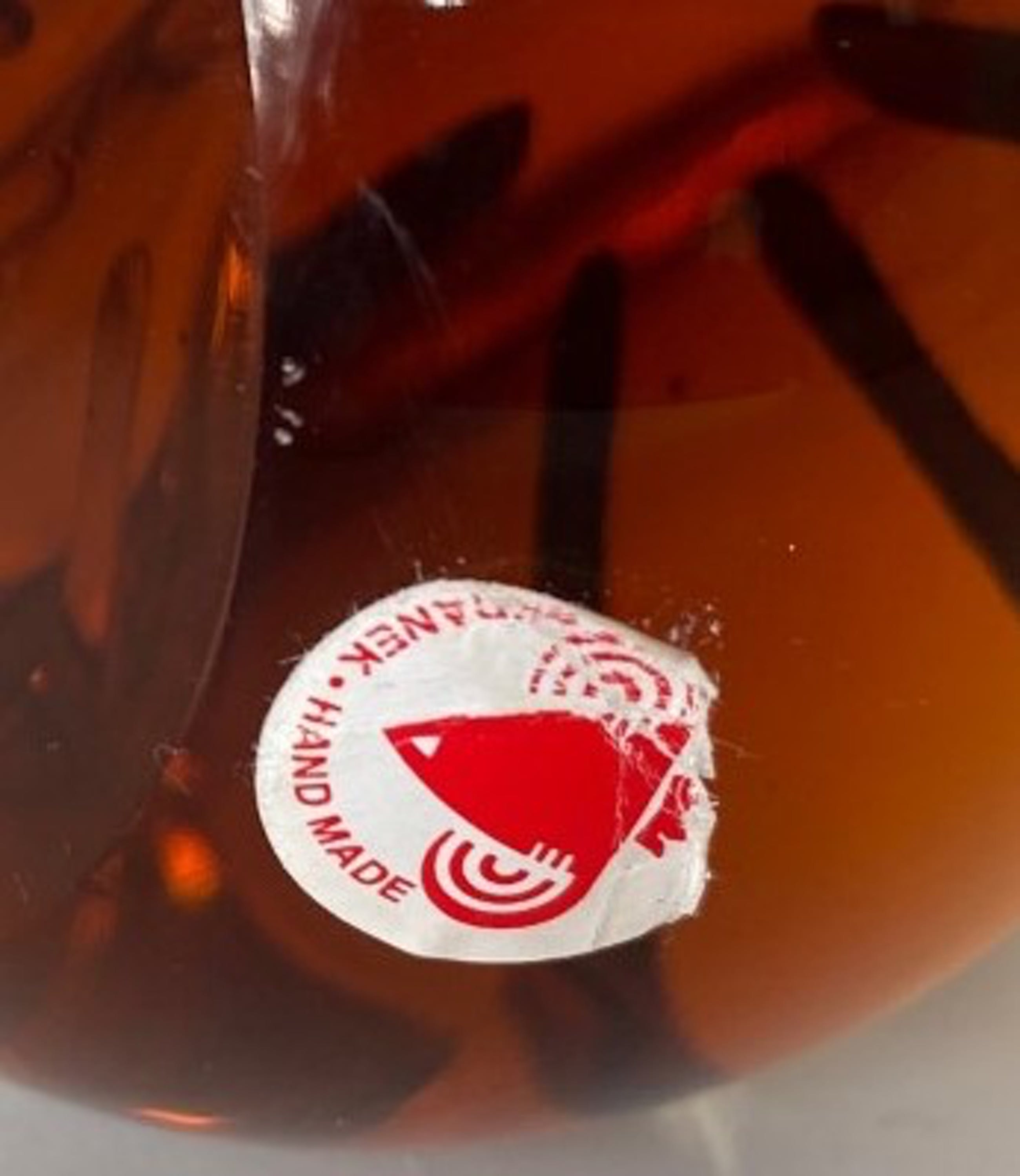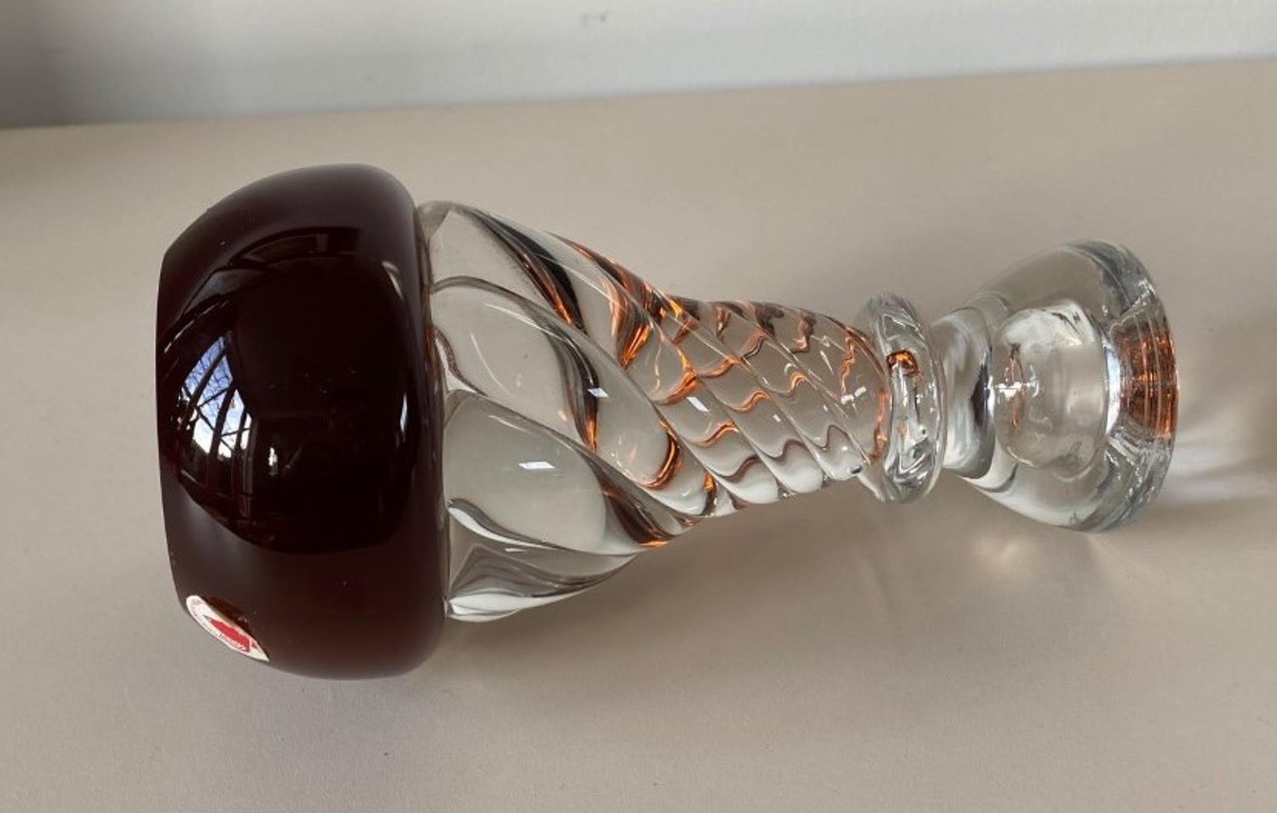 Studio glazen kandelaar met getordeerde blank glazen bovenzijde en massief bruin glazen voet uitgevoerd bij de glasstudio van Jan Beranek uit Skdlovice in Tsjechie. In prima onbeschadigde conditie en gemerkt met een papieren sticker.