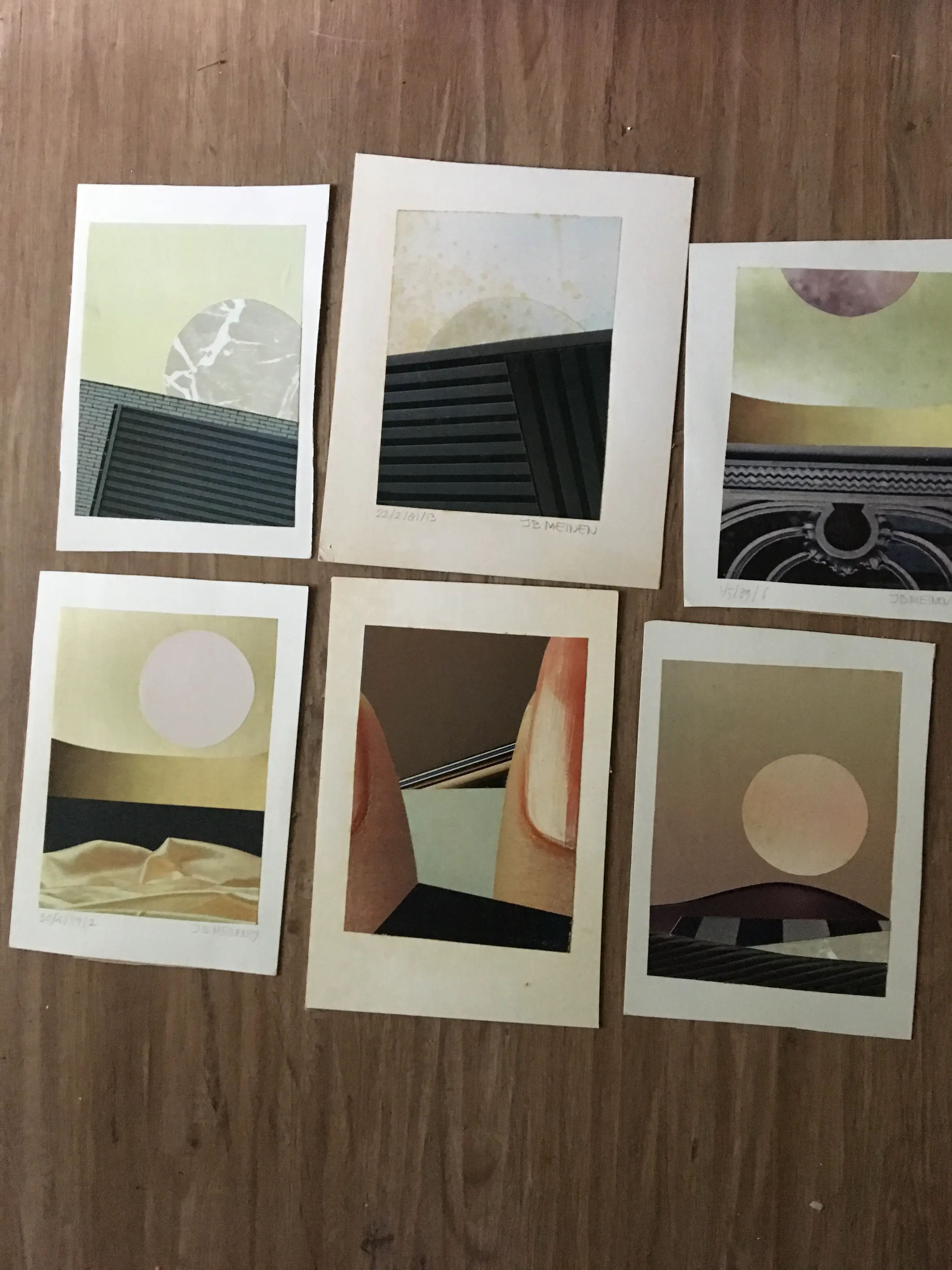 6 collages gemaakt door JB Meinem. Er zijn er 5 gesigneerd en 1 niet. Allen dezelfde maat, namelijk 11 bij 15 cm. Het is geplakt op stevig papier.