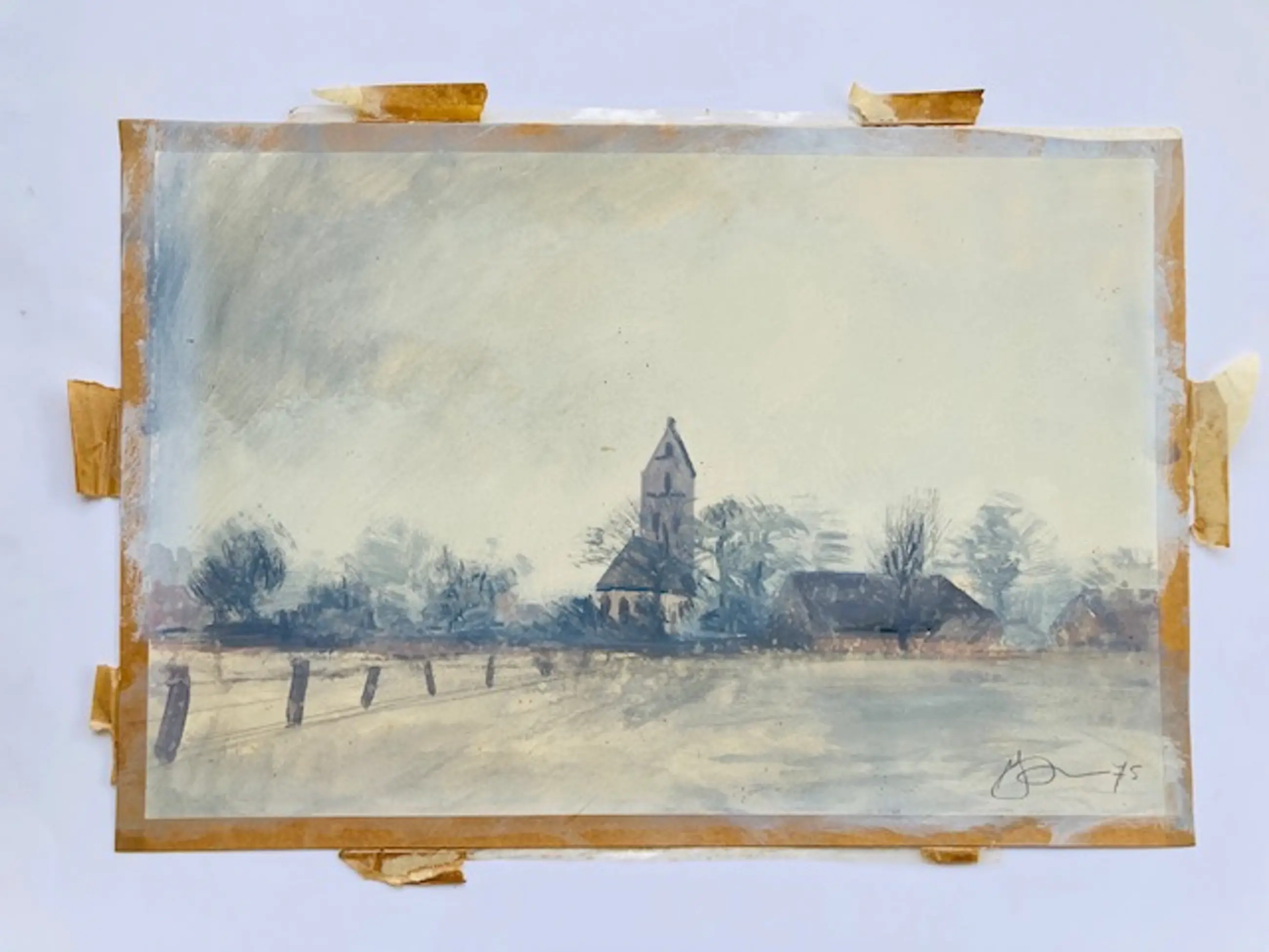 Een zeer fraaie aquarel van de Papendrechtse kunstenaar Jan Bernhard Meinen waar hij zijn liefde toont voor het Franse landschap. Het werk verdient het om opnieuw ingelijst te worden. De kunstenaar heeft het papier opgespannen met zuurvrij papiertape deze taperesten zijn aan het uiteinde nog te zien. Bij gebruik van een passe partout valt dit volledig weg. U mag het vooraf komen beoordelen in de schatkamer van galerie Rotor in Gorinchem.