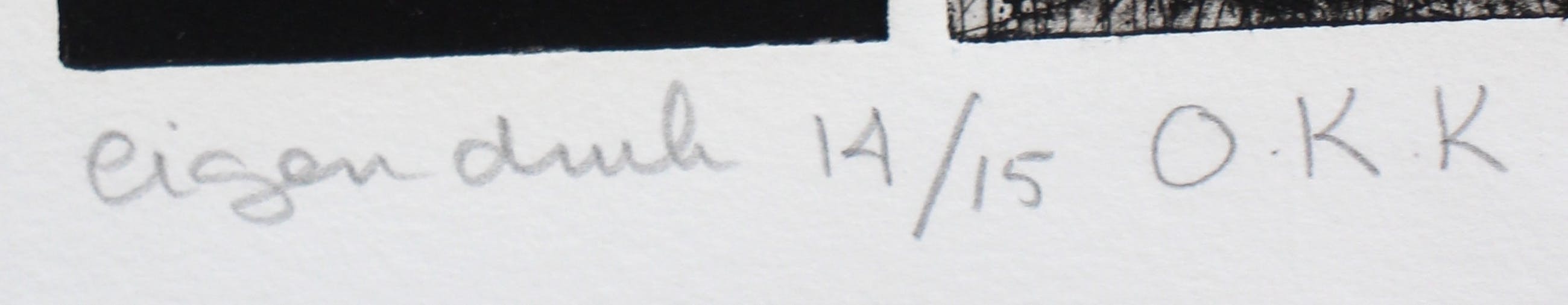 Ets van Jan Bernhard Meinen. Titel: O.K.K. Abstracte compositie met geometrische vormen. Nummer: 14/15, eigen druk. Afmetingen werk: H56 x b31.5cm. Afmetingen voorstelling: H42 x b25.5cm. Het werk is rechtsonder gesigneerd door de kunstenaar. De authenticiteit van het aangeboden werk wordt volledig gegarandeerd. Een certificaat van echtheid kan, op aanvraag, worden gemaild.