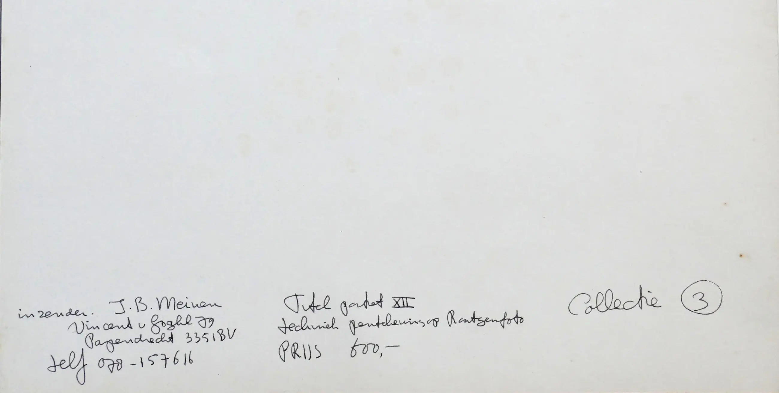 Enig exemplaar . Achter passe-partout. Afmeting : 23.5 x 24,5 In verso in potlood ; Adres enz. en Pentekening Rontgen Portret X11 Collectie 3