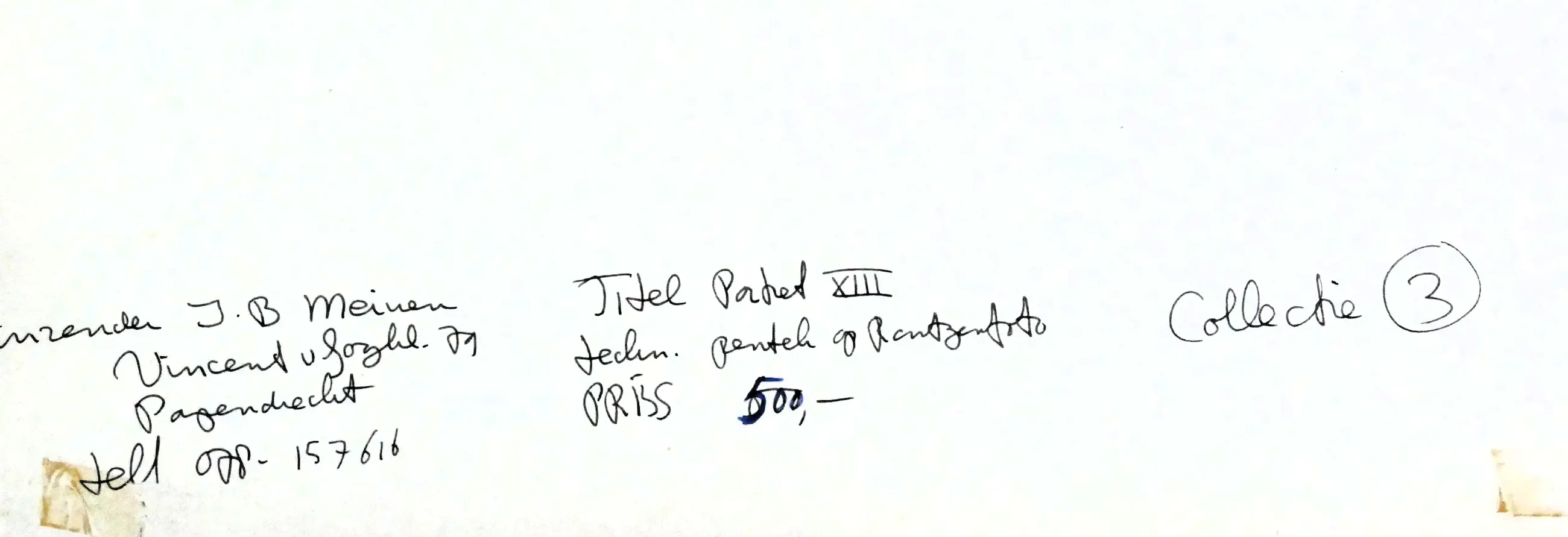 De tekening verkeert in goed conditie. Niet gedateerd, maar aan de hand van techniek en voorstelling vervaardigd rond 1982 In verso : personalia en overige info.