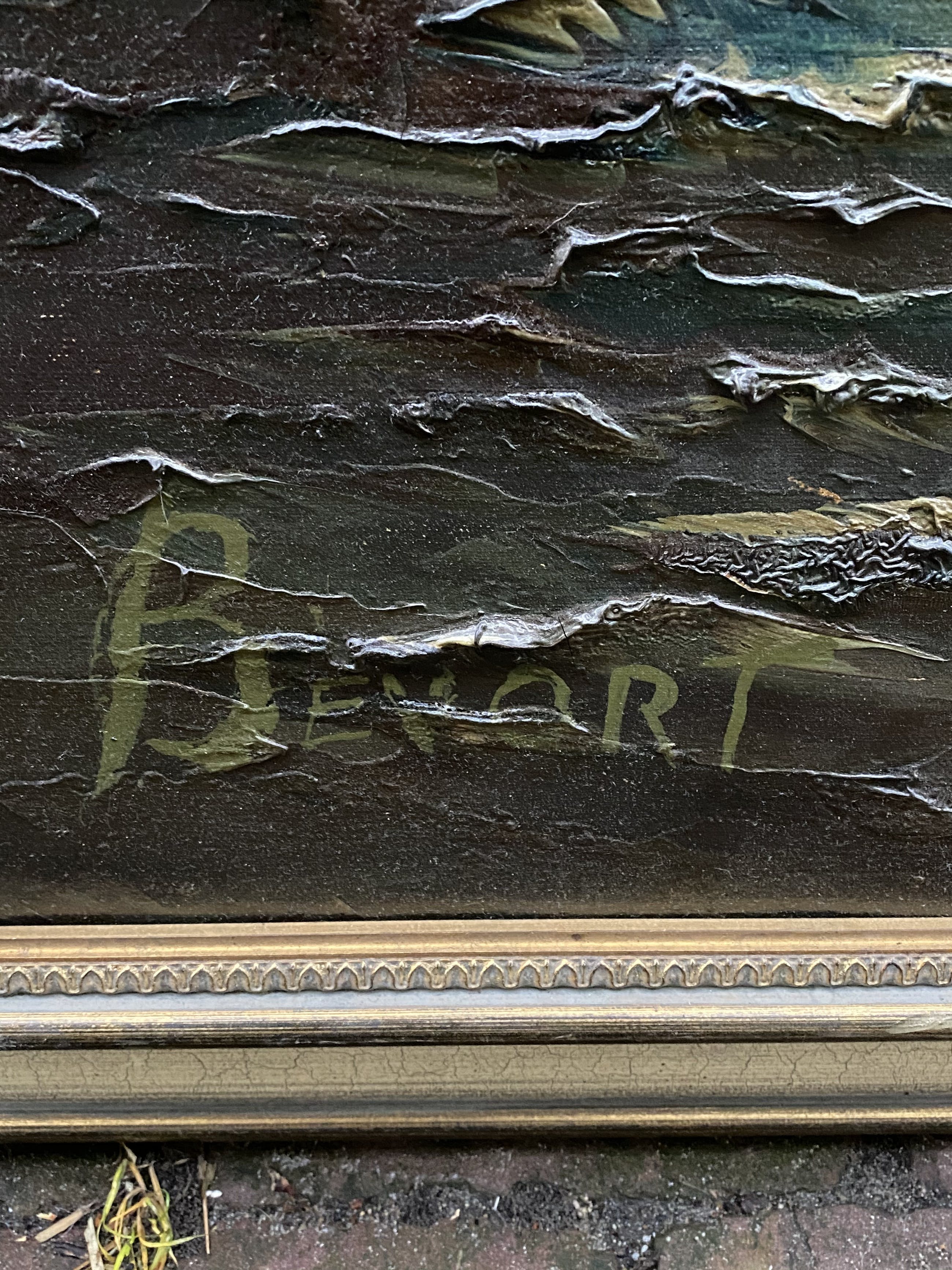 | Het doek bevat oppervlaktevuil en verkleurde vernis door de tijd, roestvorming in witte verf (bekend probleem bij Bevort), craquelures, loszittende verf en wat plekjes verfverlies, doek wat slap. De lijst bevat oppervlaktevuil en slijtschade door de tijd. | |
