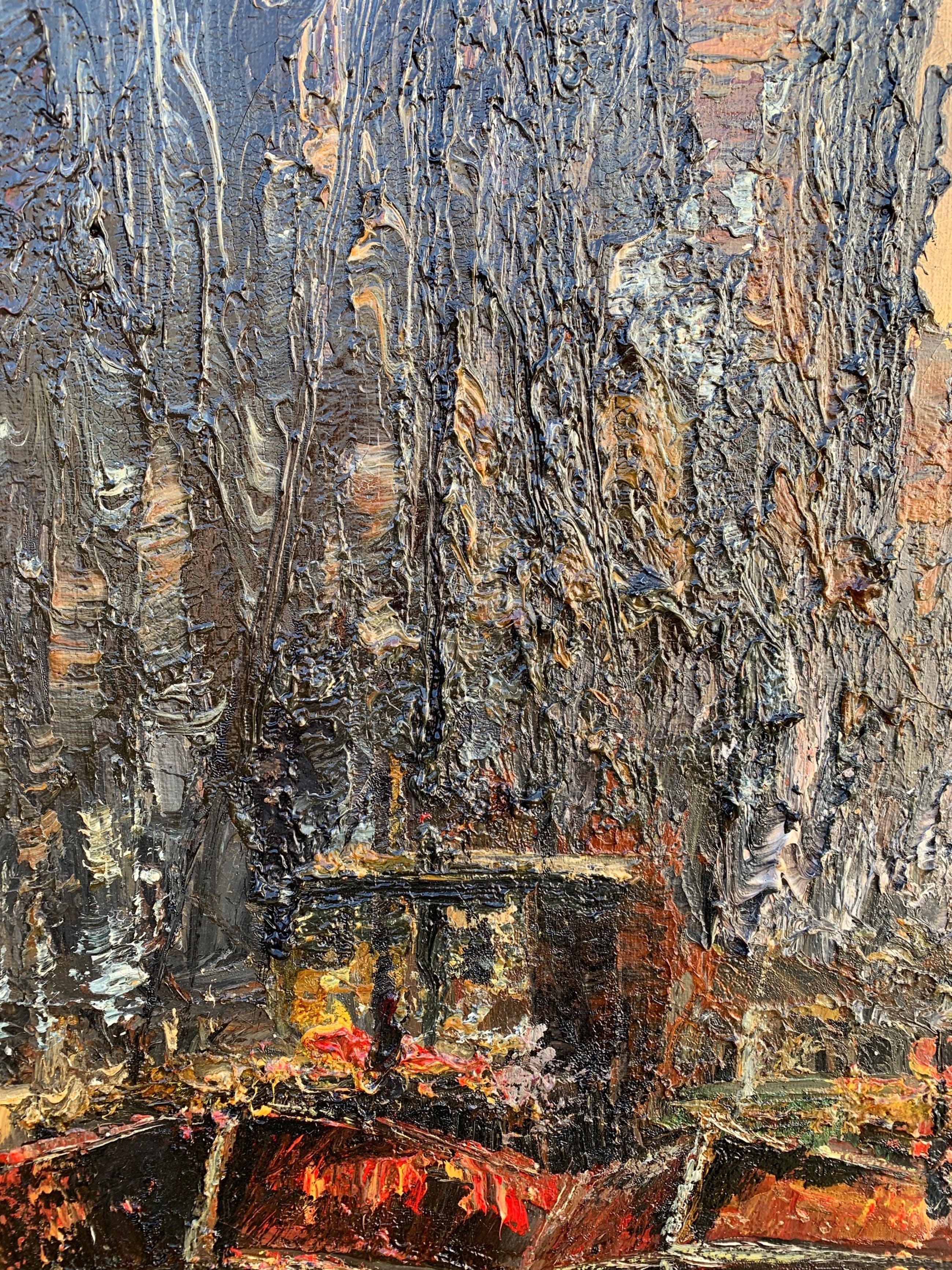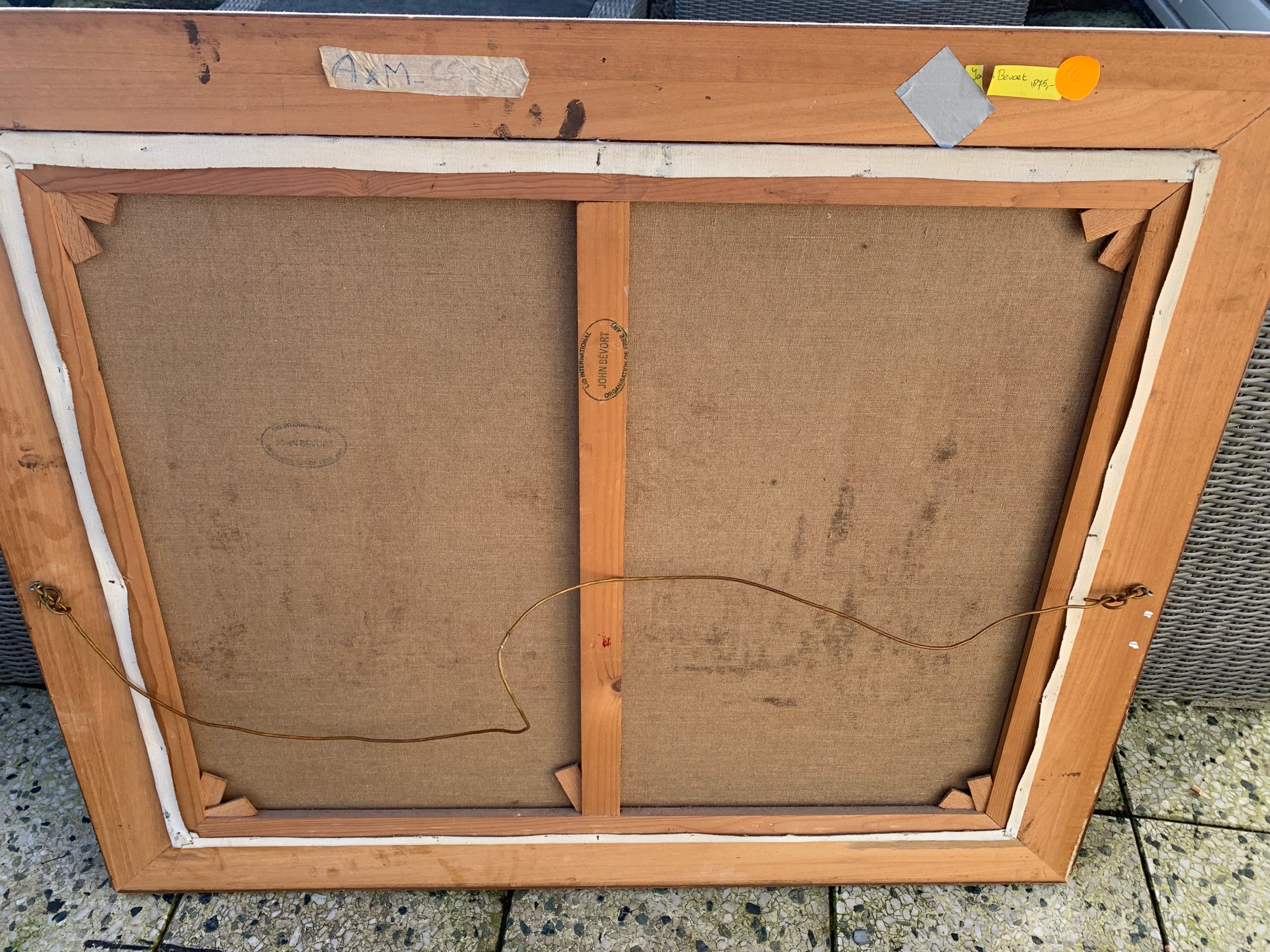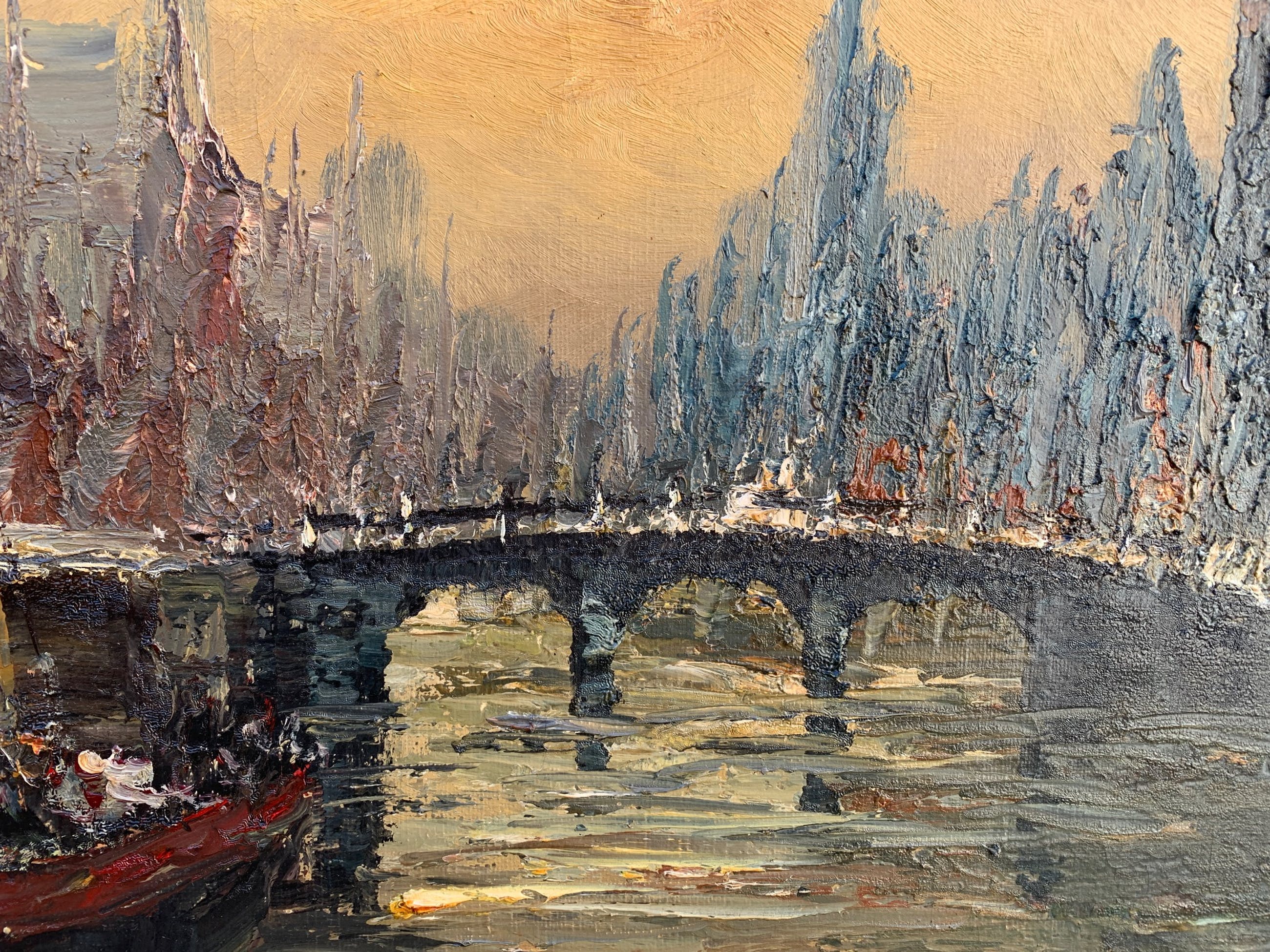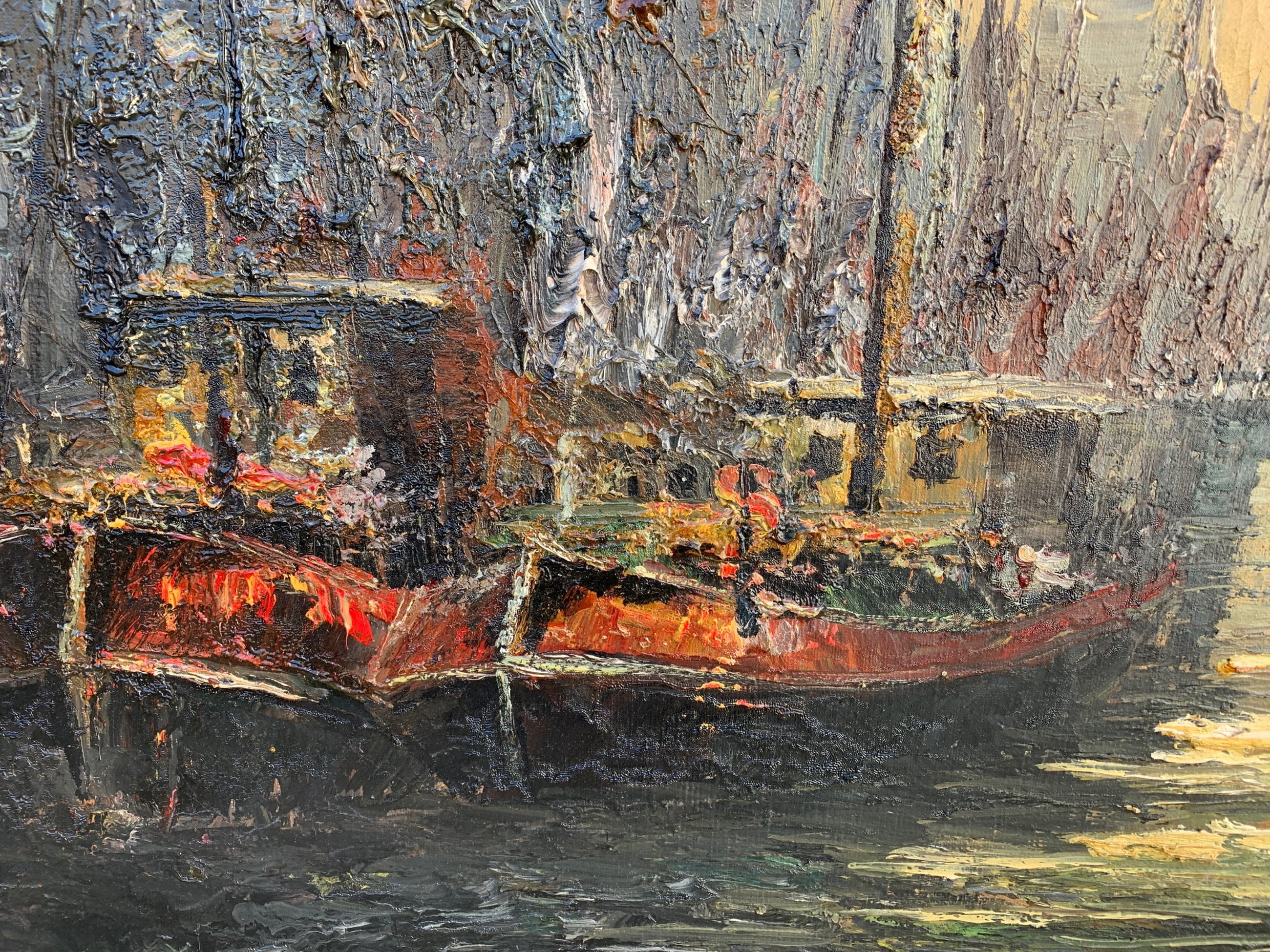 Groot en indrukwekkend schilderij van de bekende Nederlandse schilder John Bévort met de Amsterdamse gracht met uitzicht op de Montelbaanstoren. Het doek en de lijst zijn in goede staat. Het schilderij is niet gesigneerd maar op de achterkant staat een stempel met de tekst: 'John Bévort - Lid internationale organisatie voor vrije kunst' (zie foto's).