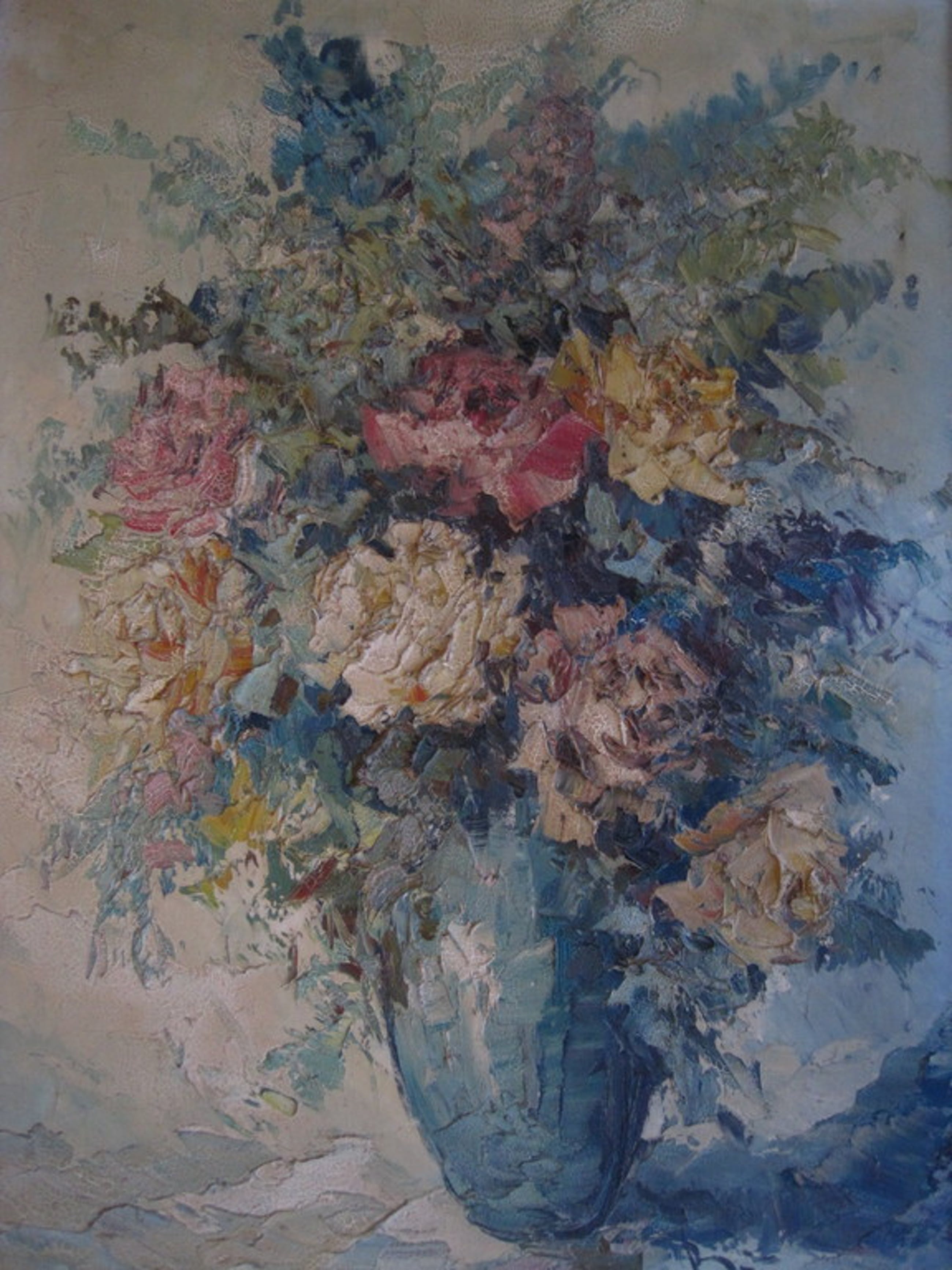 Titel/Voorstelling: " Boeket van Rozen in blauwe vaas" "