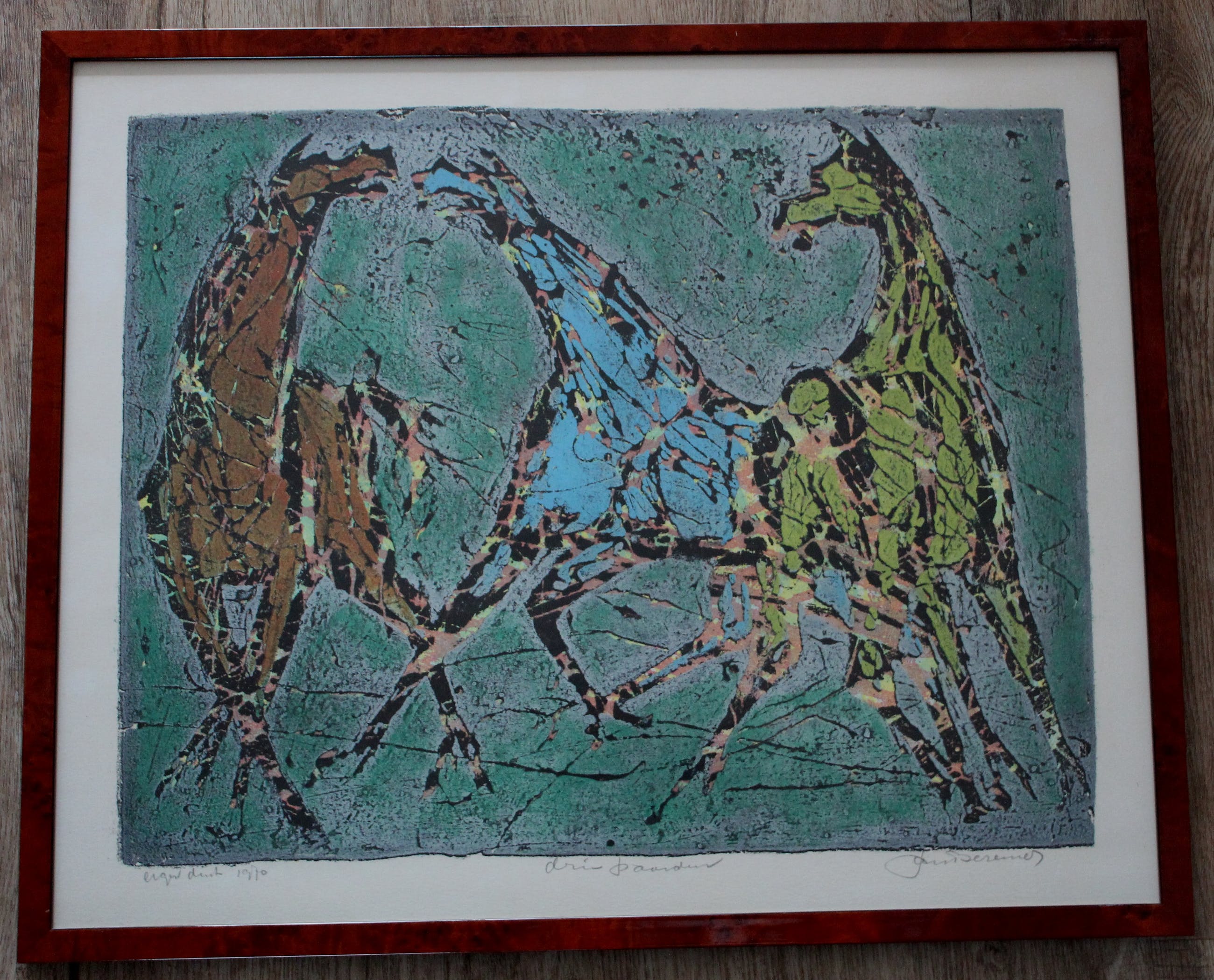 Ingelijste litho van Jan Bezemer. Titel: de drie paarden. Jaar: 1970. Afmetingen incl lijst : H58 x b70cm; Afmetingen voorstelling: H46 x b60cm. Het werk is rechts onderaan, met potlood, gesigneerd door de kunstenaar. De authenticiteit van het aangeboden werk wordt volledig gegarandeerd. Een certificaat van echtheid kan, op aanvraag, worden gemaild.
