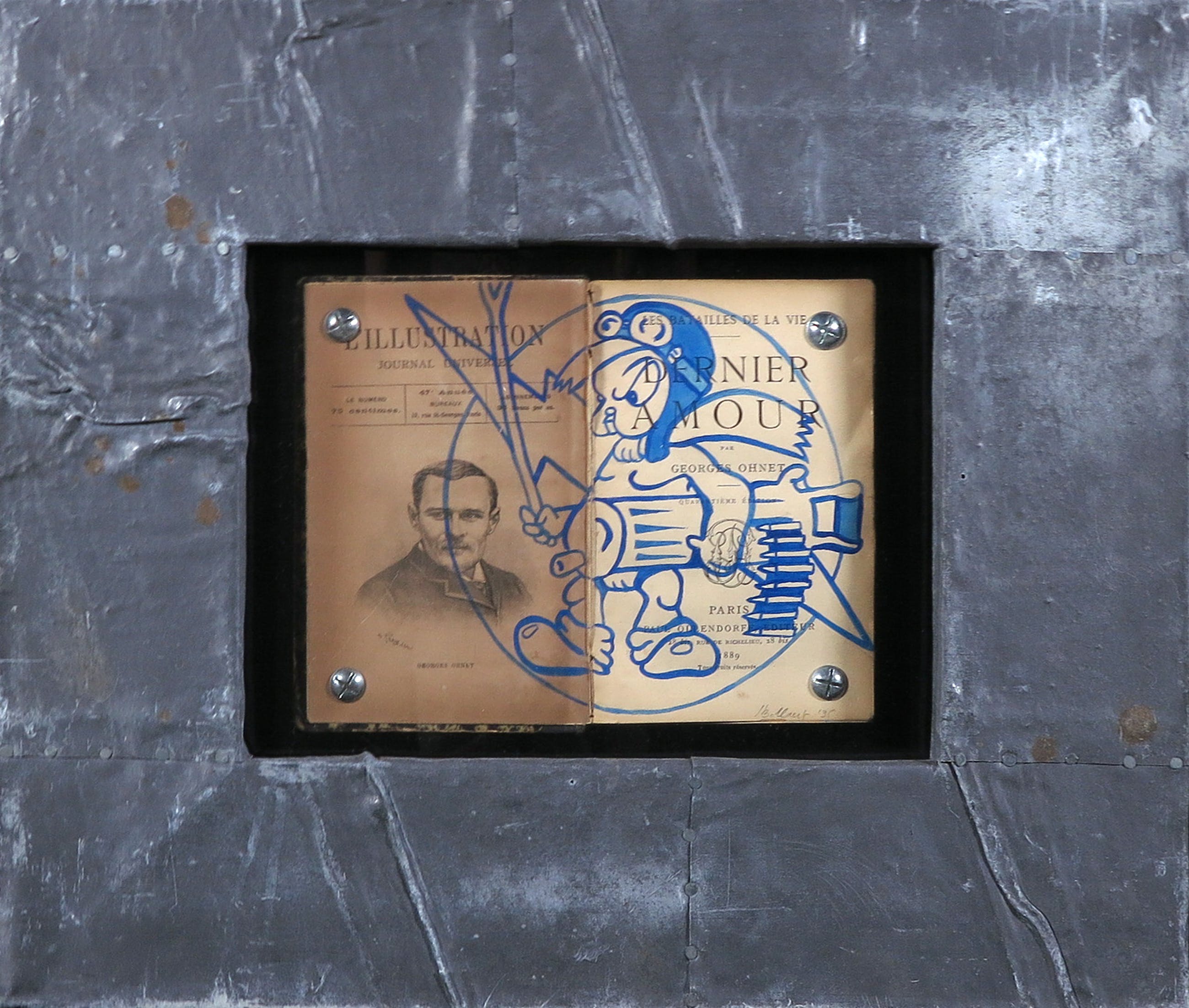 Acryl op kaft van boek, verlijmd op doek en ingelijst met lood.