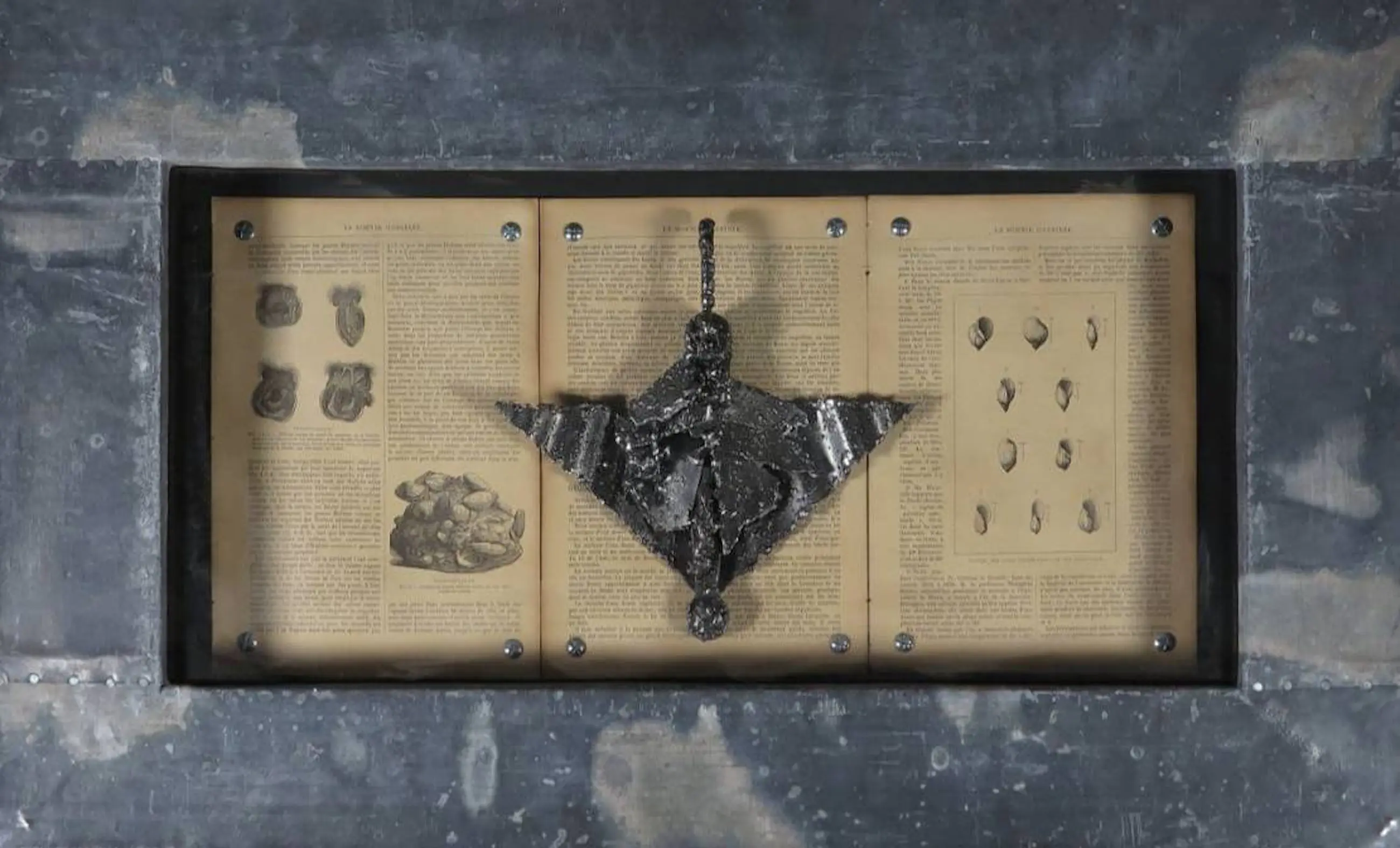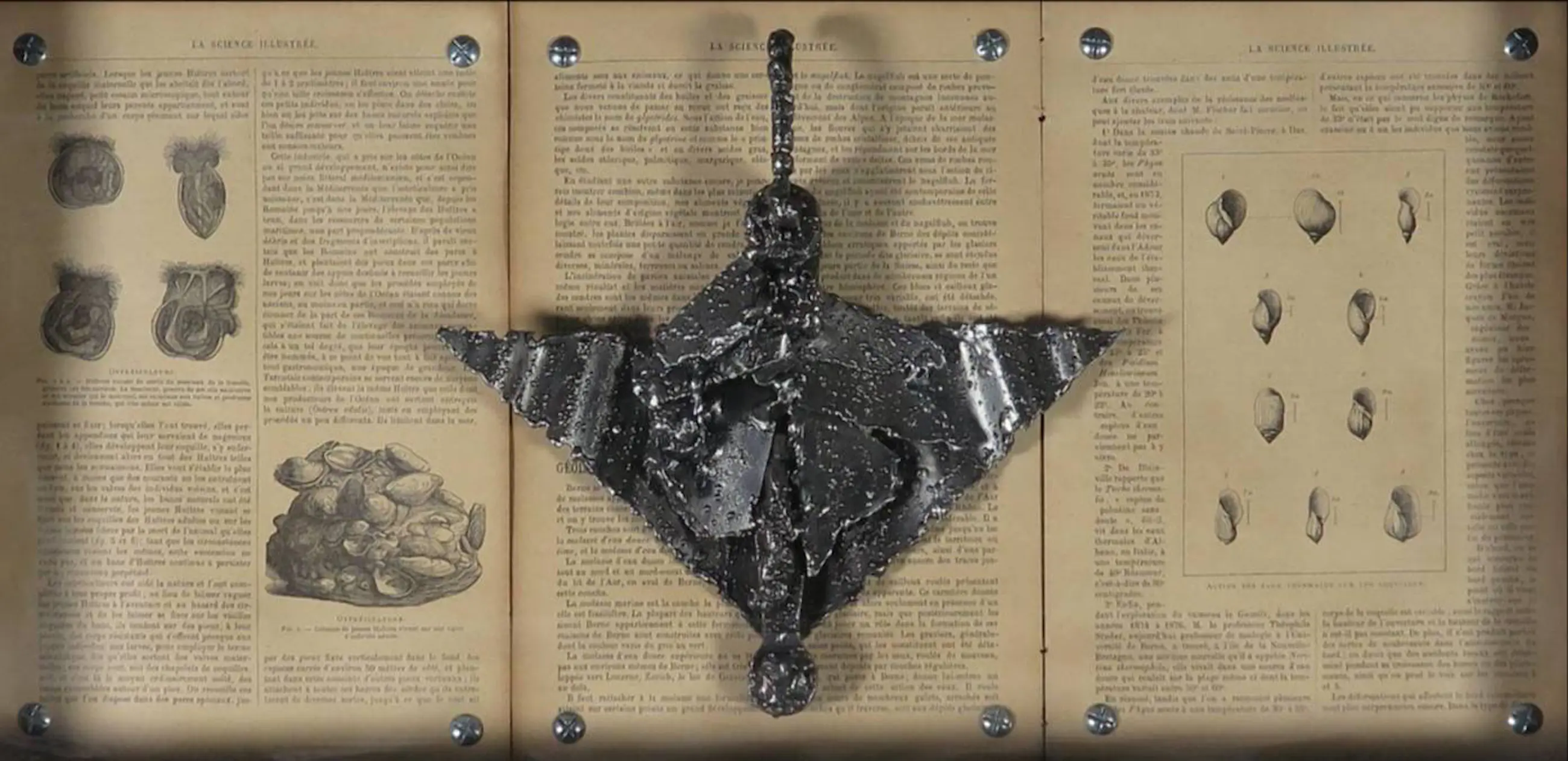 Het werk bestaat uit een metalen sculptuur die gemonteerd is op een oude publicatie over biologie of paleontologie, getiteld ' La Science Illustrée'.