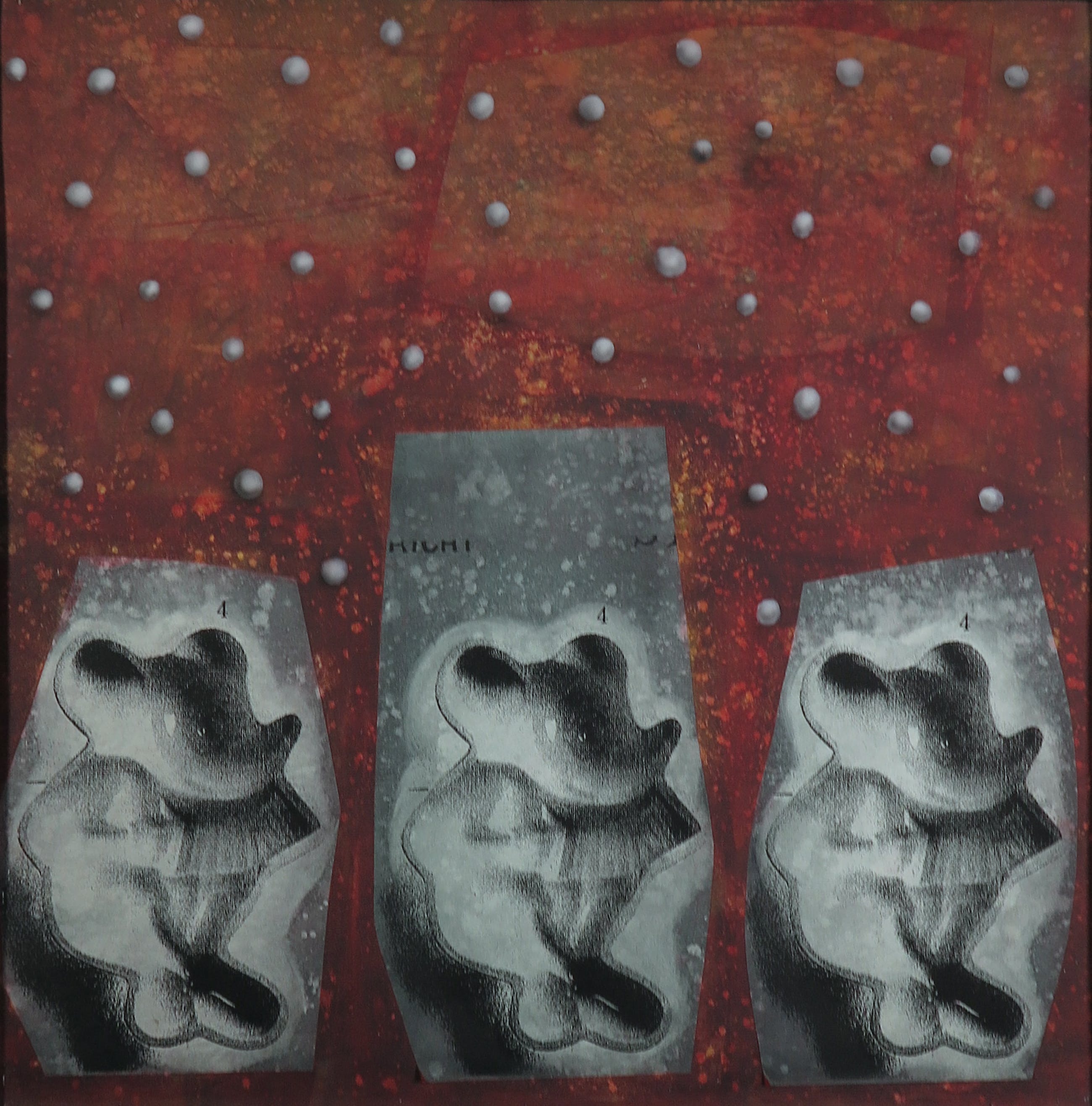 Acryl op papier, verlijmd op doek en ingelijst met lood. De achtergrond is vervaardigd uit uitvergrote historische boeken of documenten.