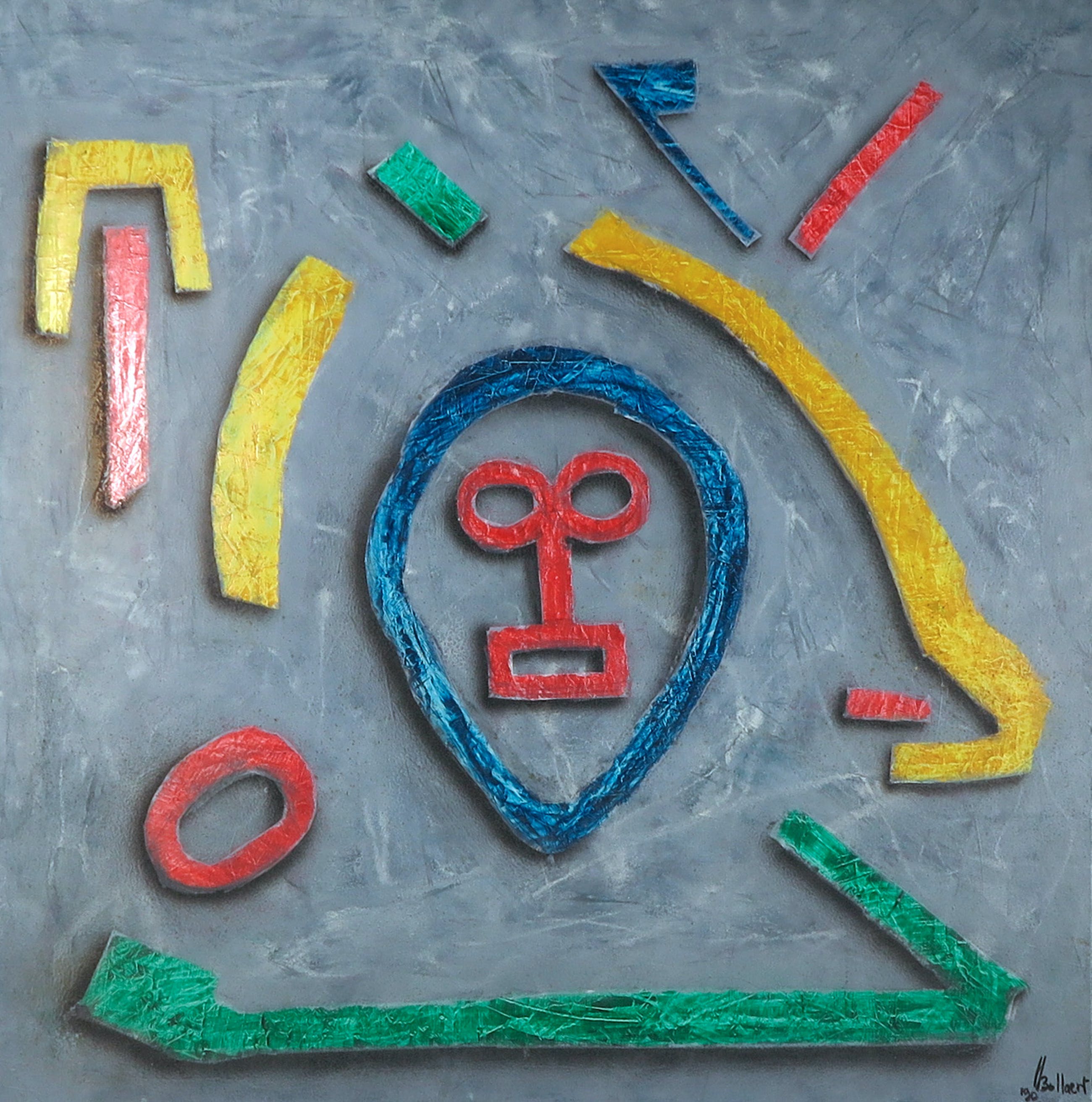 Acryl op papier, verlijmd op marouflé. De achtergrond is vervaardigd uit uitvergrote historische boeken of documenten.