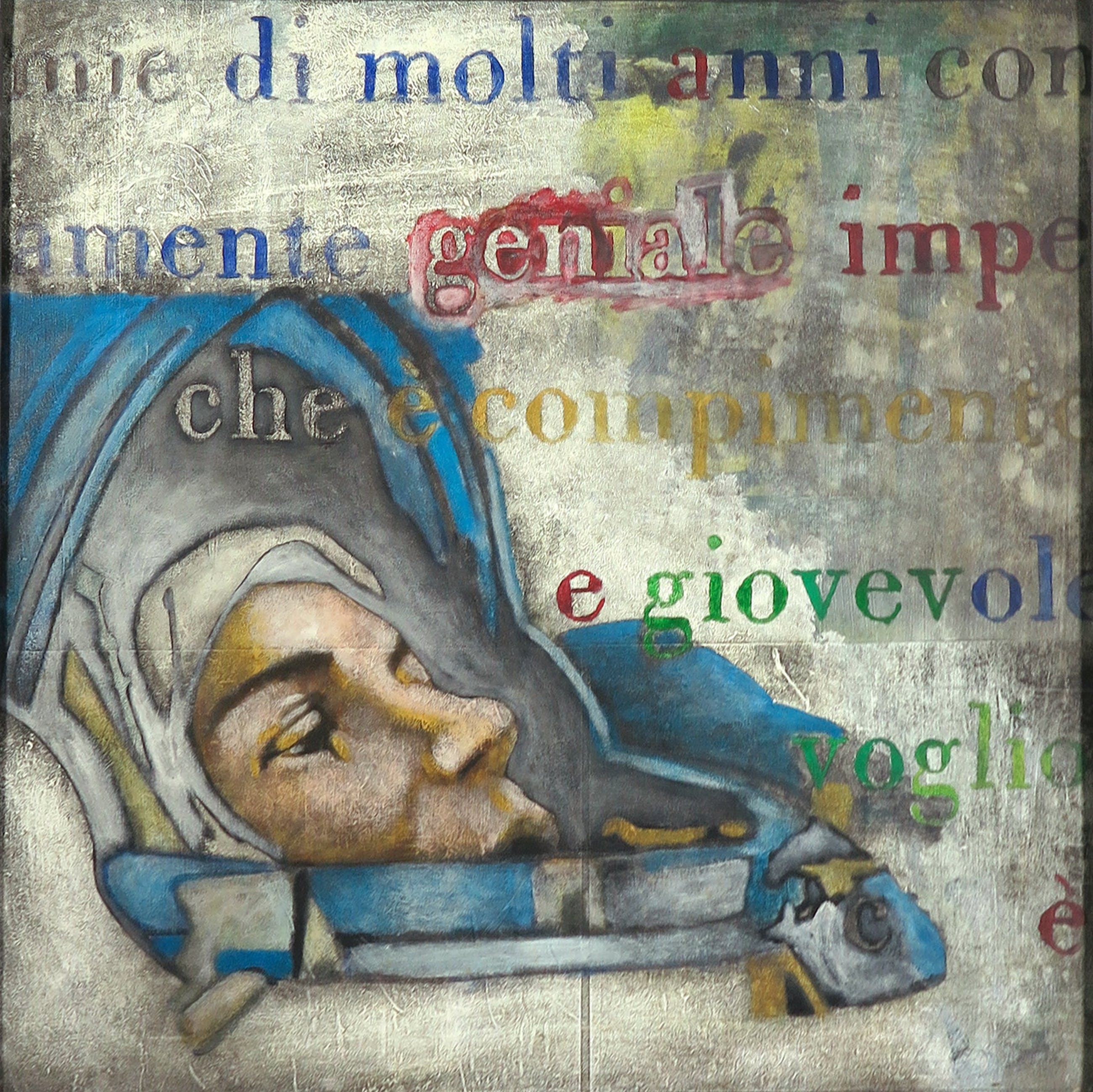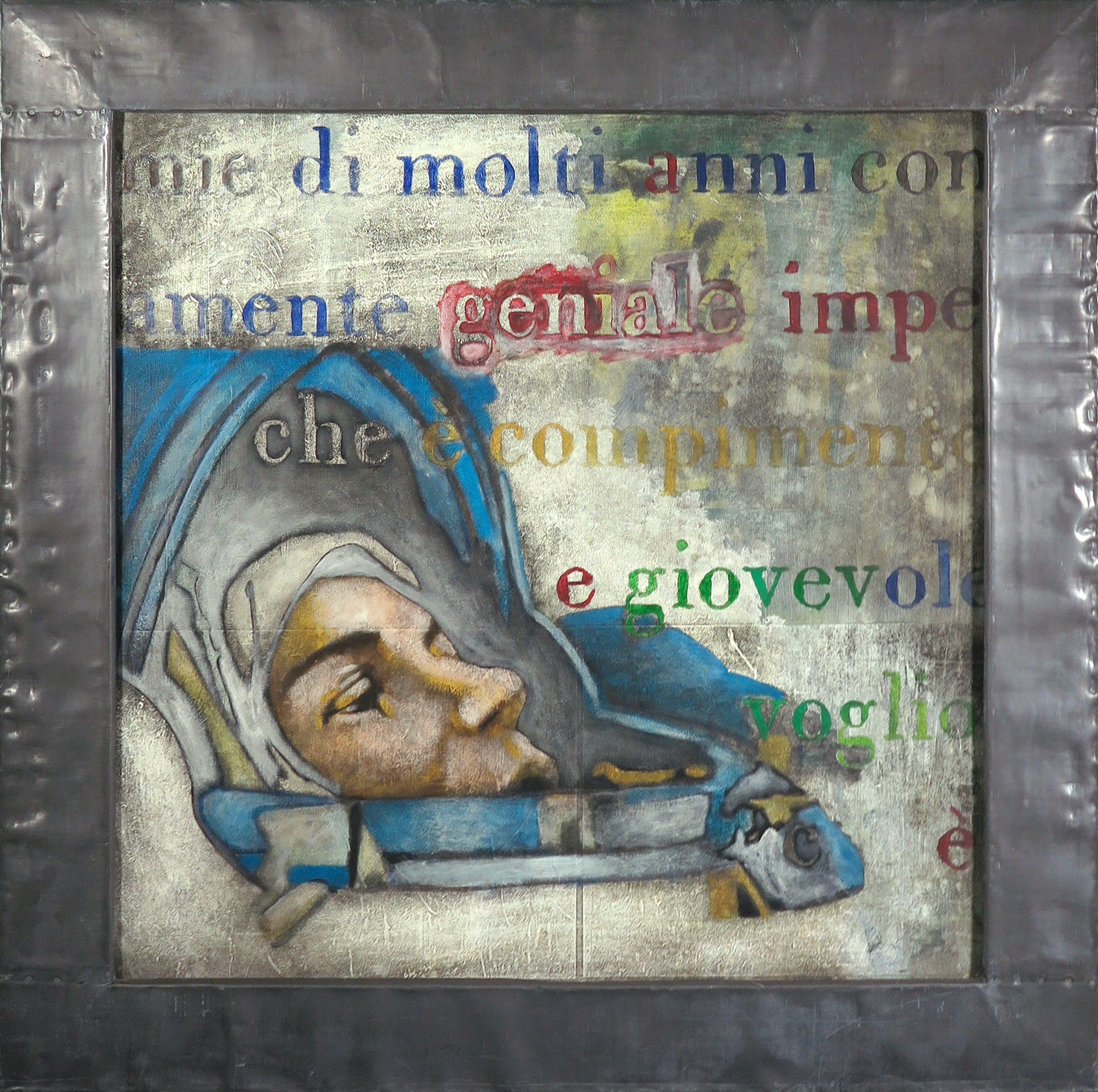Acryl op papier, verlijmd op doek en ingelijst met lood. De achtergrond is vervaardigd uit uitvergrote historische boeken of documenten.