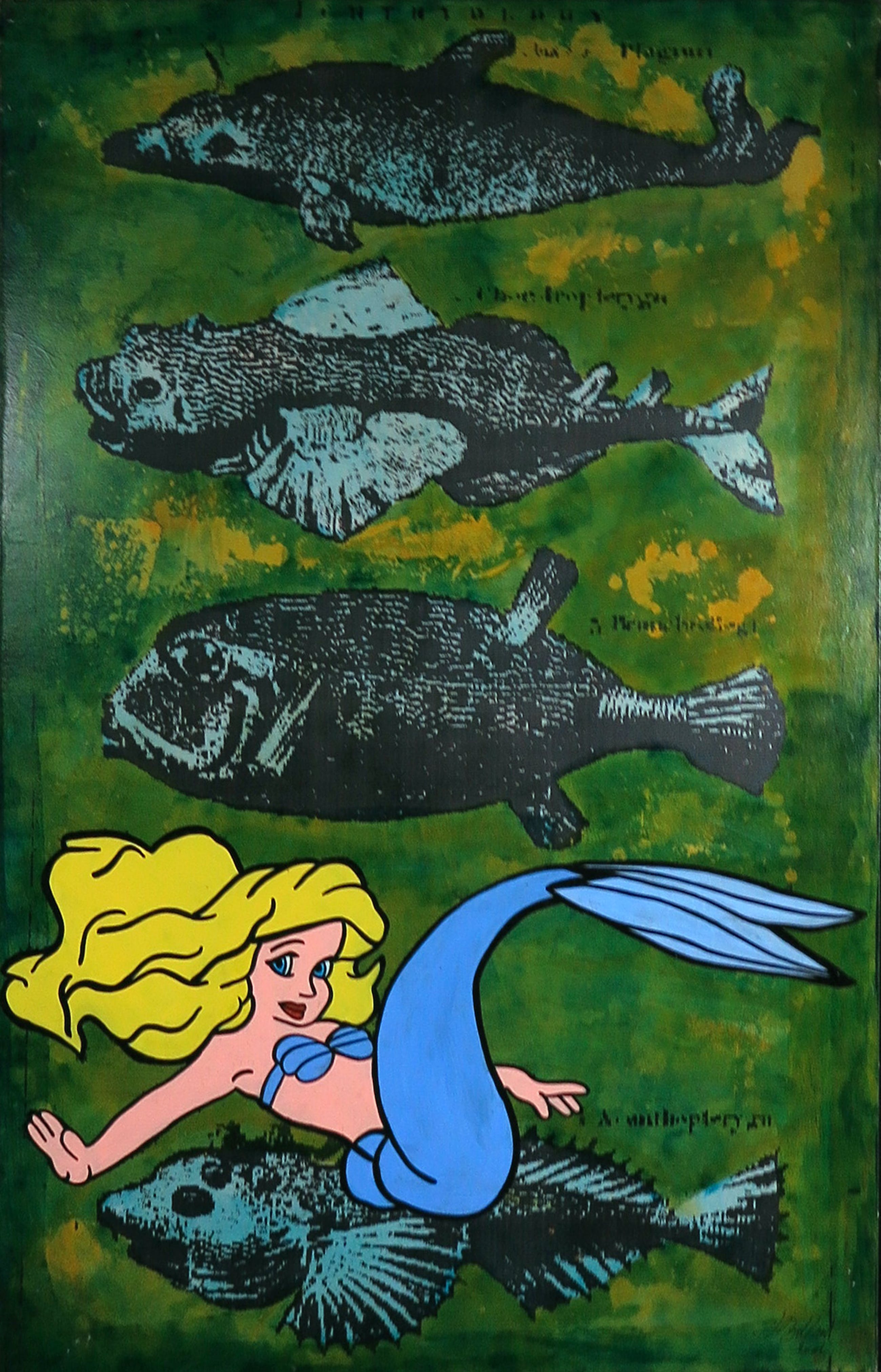 Acryl op papier, verlijmd op doek, over hardboard gespannen (met ophangsysteem). De achtergrond van de voorstelling betreffend een uitvergrootte pagina uit historische publicatie. De figuur in de voorgrond is geschilderd.