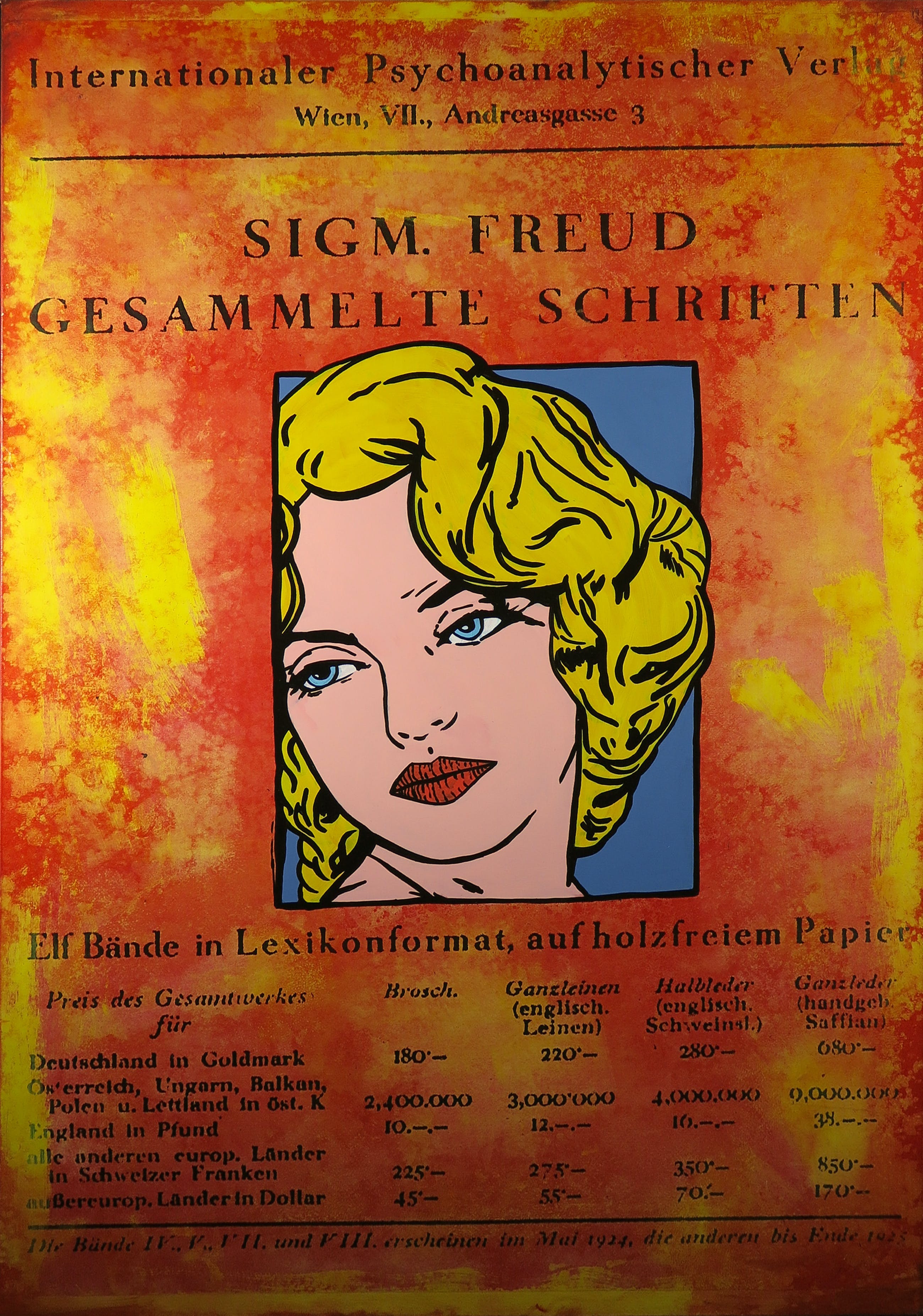 Acryl op papier, verlijmd op doek, over hardboard gespannen (met ophangsysteem). De achtergrond is vervaardigd uit uitvergrote historische boeken of documenten.