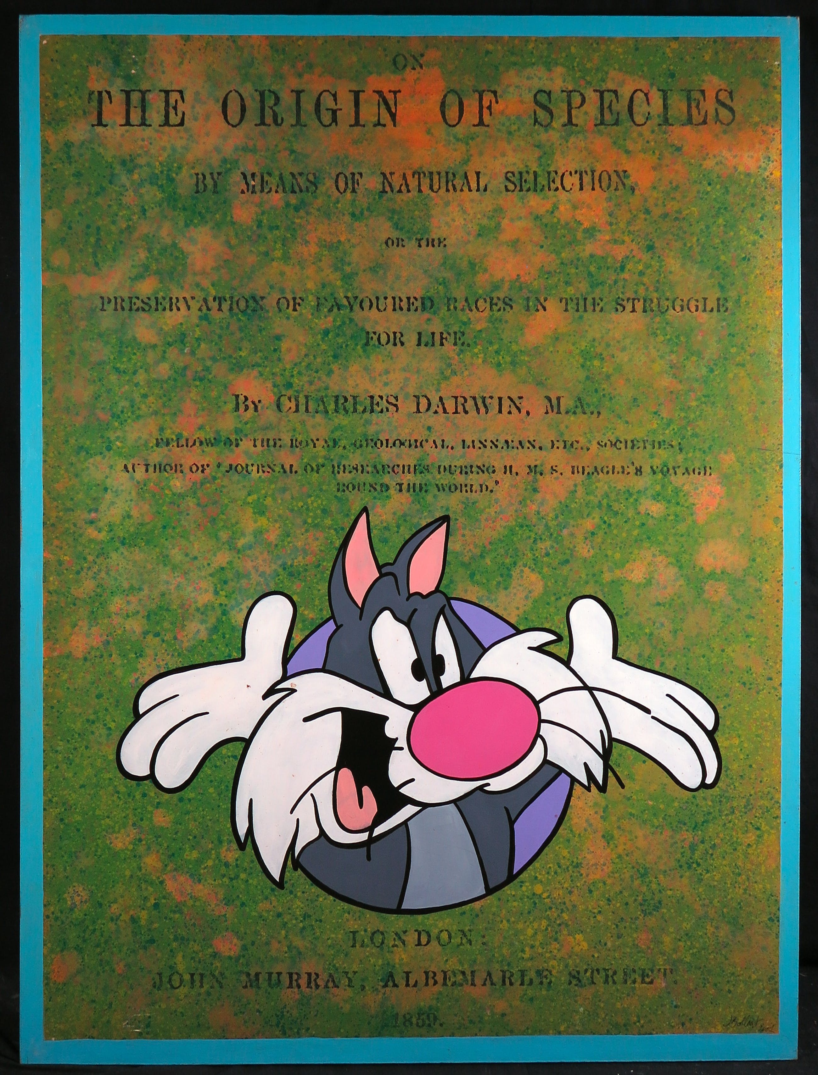 Acryl op papier, verlijmd op doek, over hardboard gespannen (met ophangsysteem). De achtergrond is vervaardigd uit uitvergrote historische boeken of documenten.