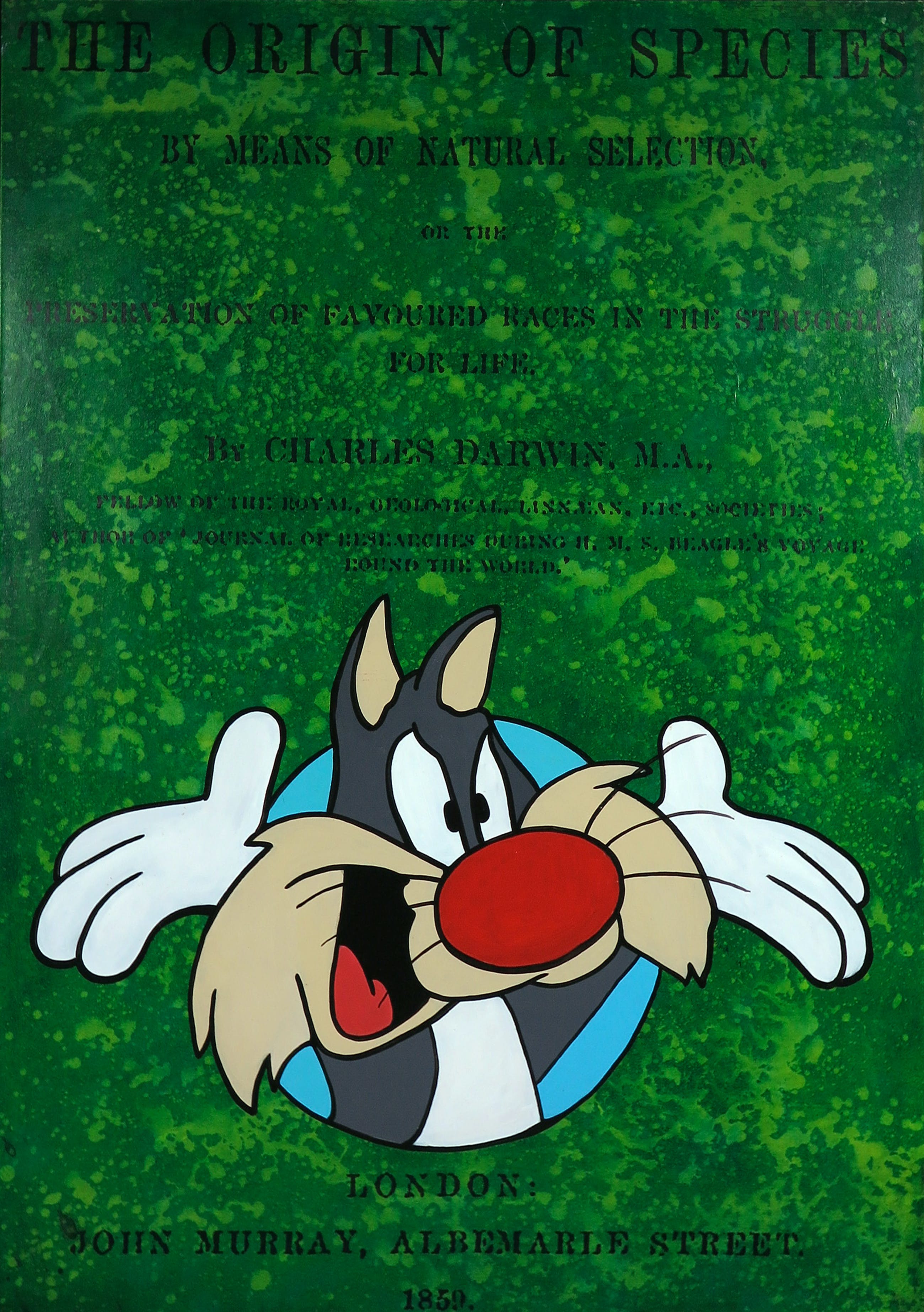 Acryl op papier, verlijmd op doek, over hardboard gespannen (met ophangsysteem). De achtergrond is vervaardigd uit uitvergrote historische boeken of documenten.