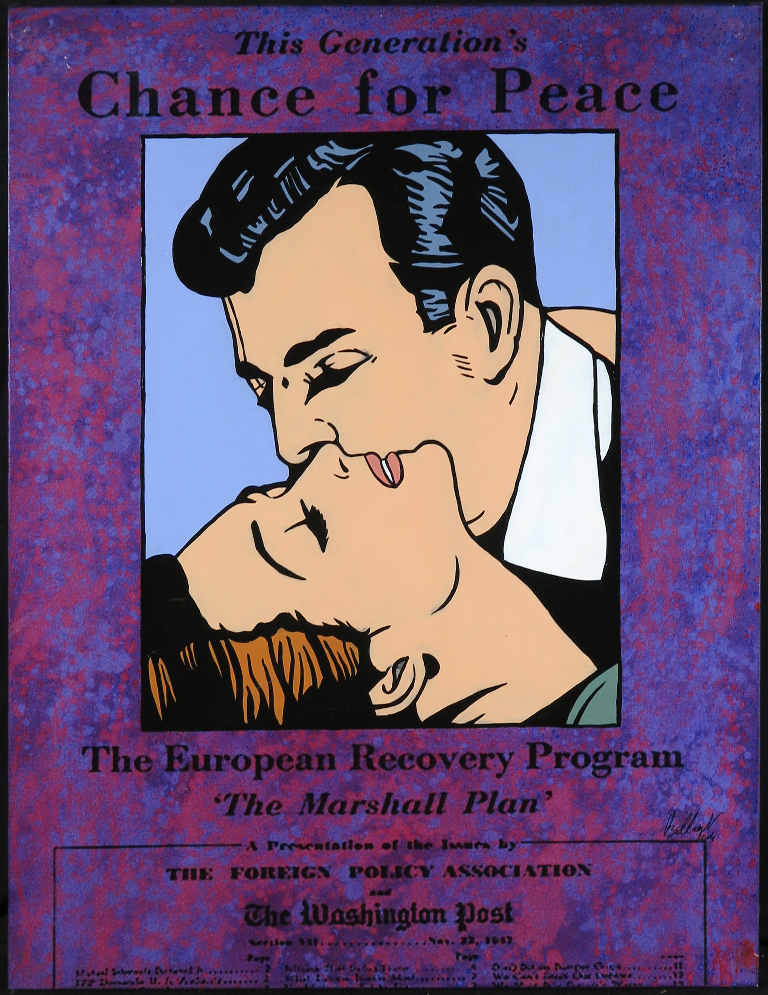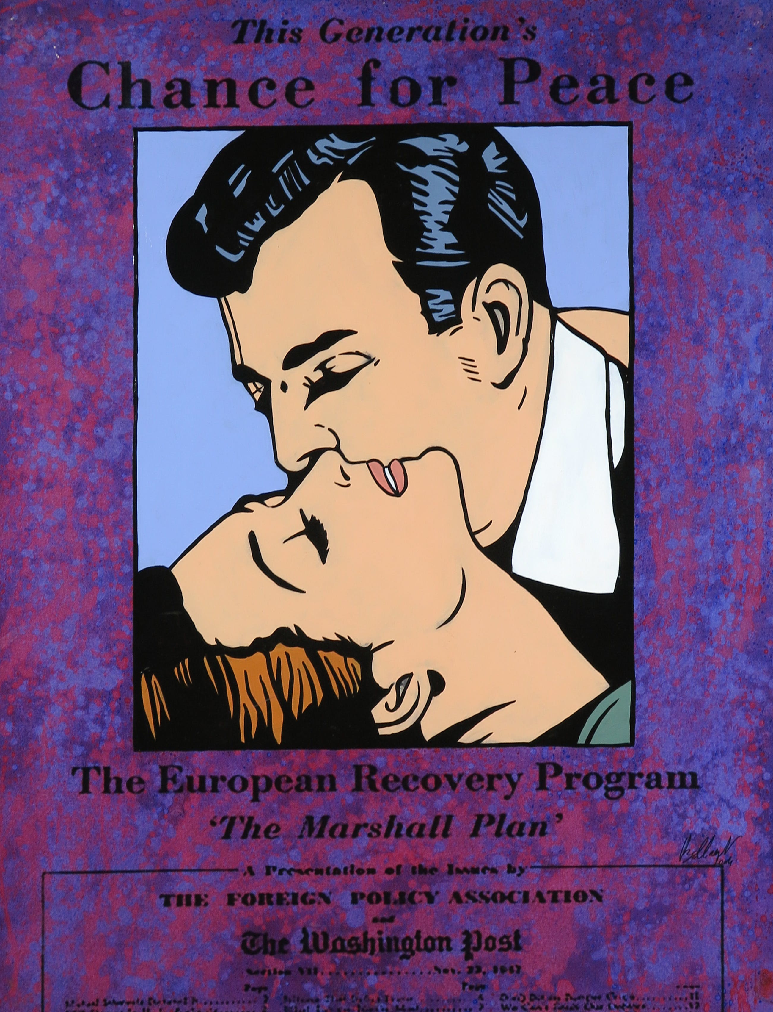 Acryl op papier, verlijmd op doek, over hardboard gespannen (met ophangsysteem). De achtergrond van de voorstelling betreffend een uitvergrootte pagina uit historische publicatie. De figuur in de voorgrond is geschilderd.