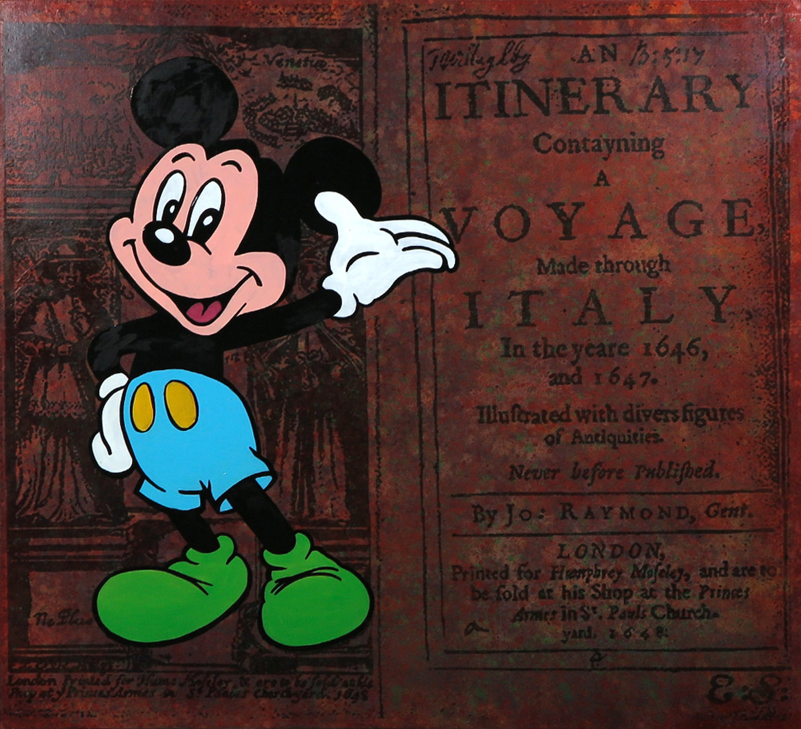 Acryl op papier, verlijmd op doek, over hardboard gespannen (met ophangsysteem). De achtergrond is vervaardigd uit uitvergrote historische boeken of documenten.