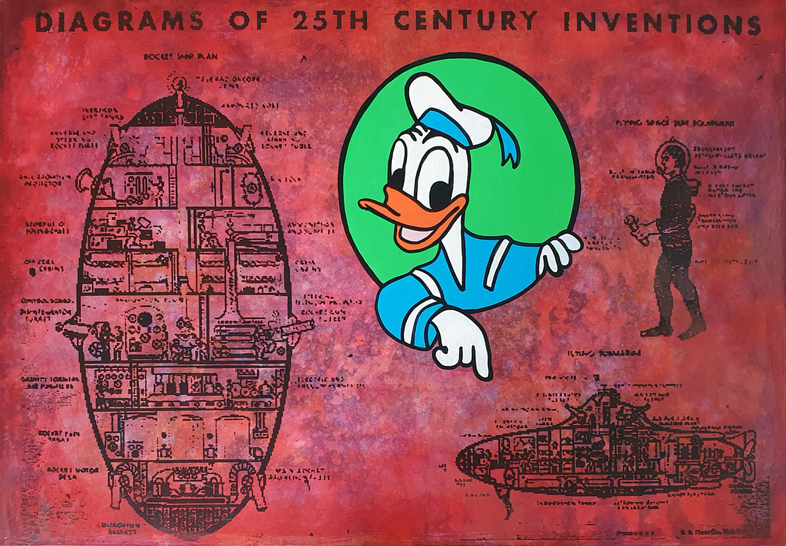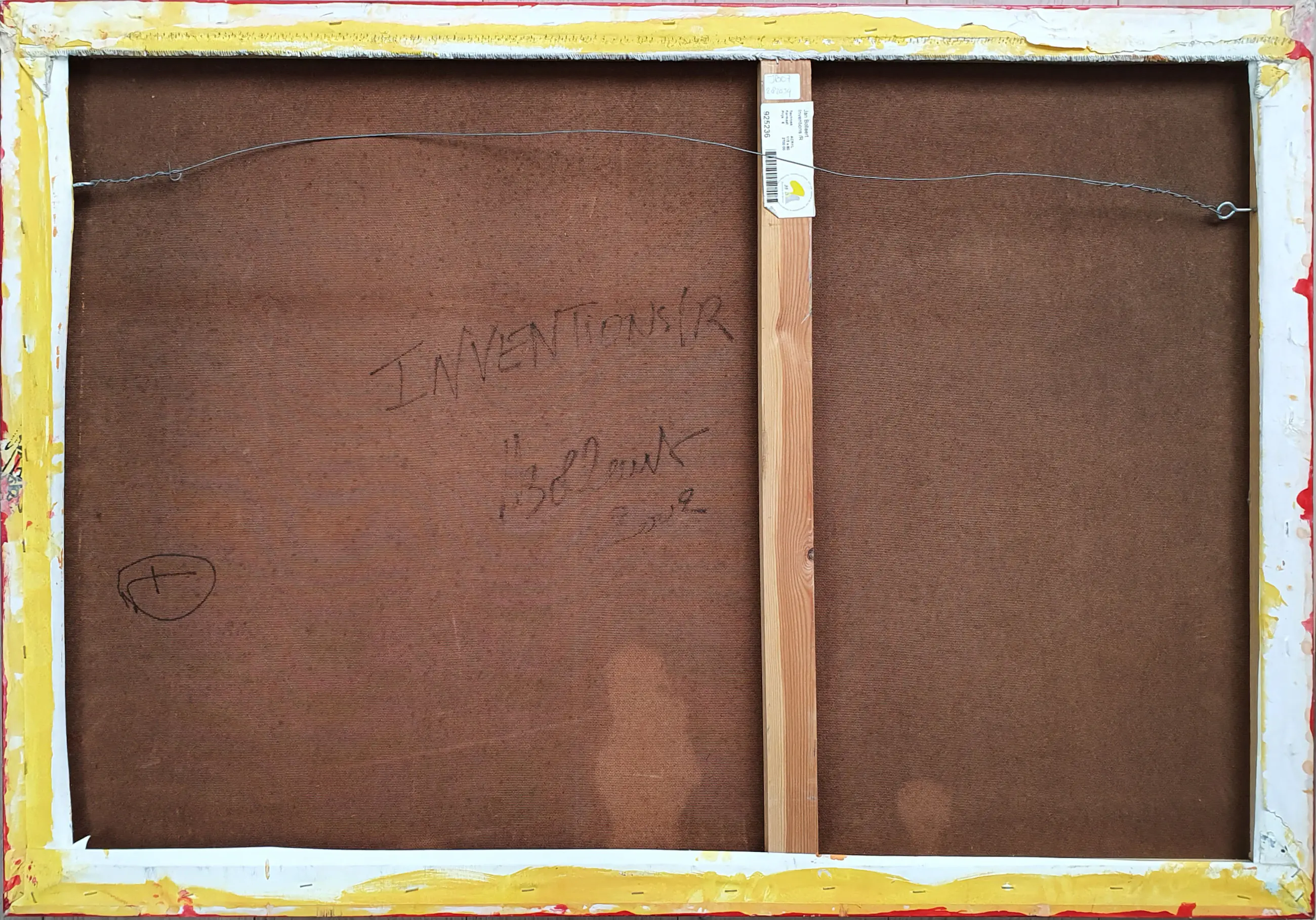 Mooi groot werk van Jan Bollaert. Acryl op papier, verlijmd op doek, over hardboard gespannen. De achtergrond is vervaardigd uit uitvergrote historische boeken.
