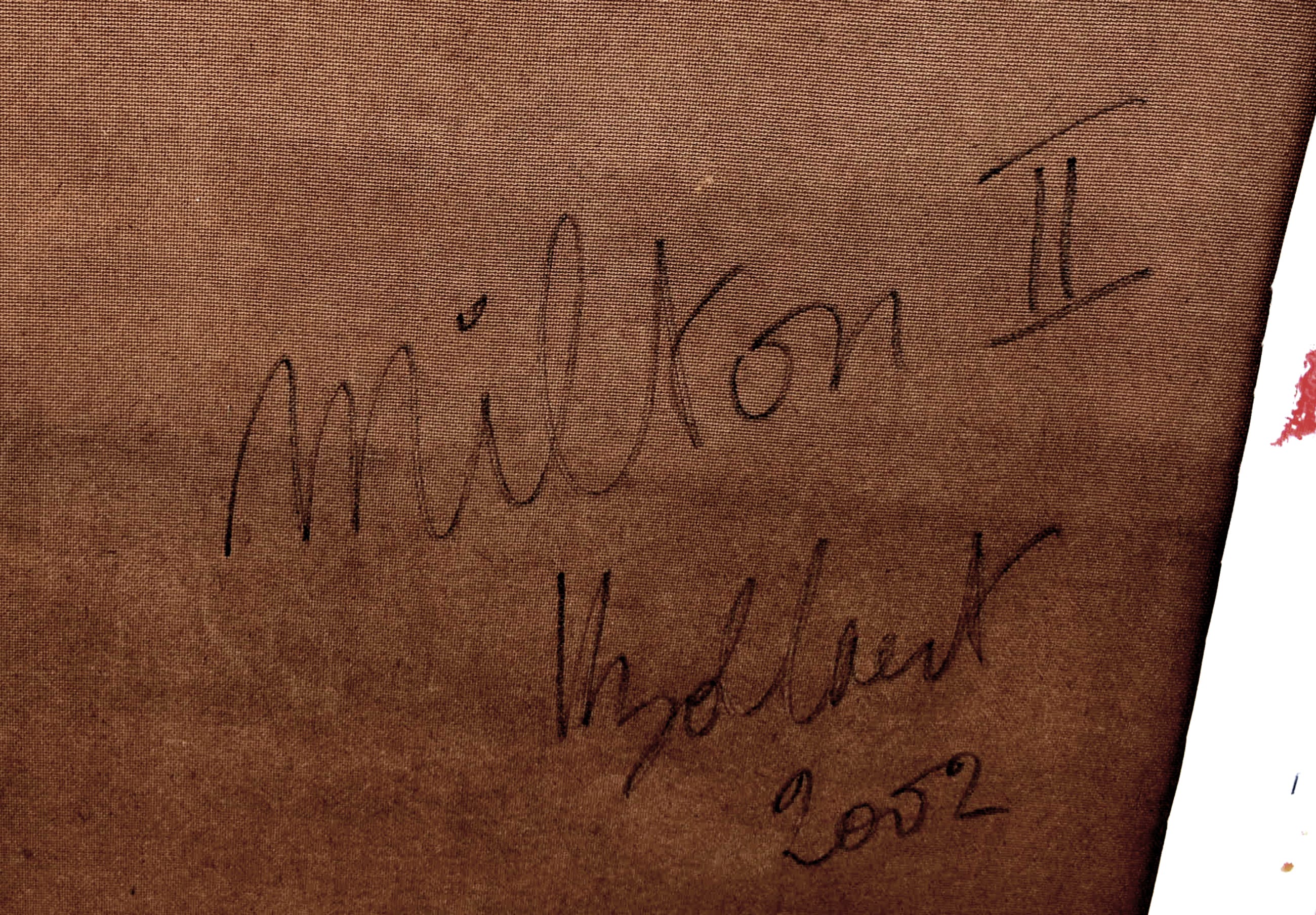 Acryl op papier gemaroufleerd (gelijmd) op doek, over lijst met hardboard gespannen.Achtergrond zijn uitvergrote historische boeken of documenten.Aflopend geschilderd dus hoeft geen lijst.