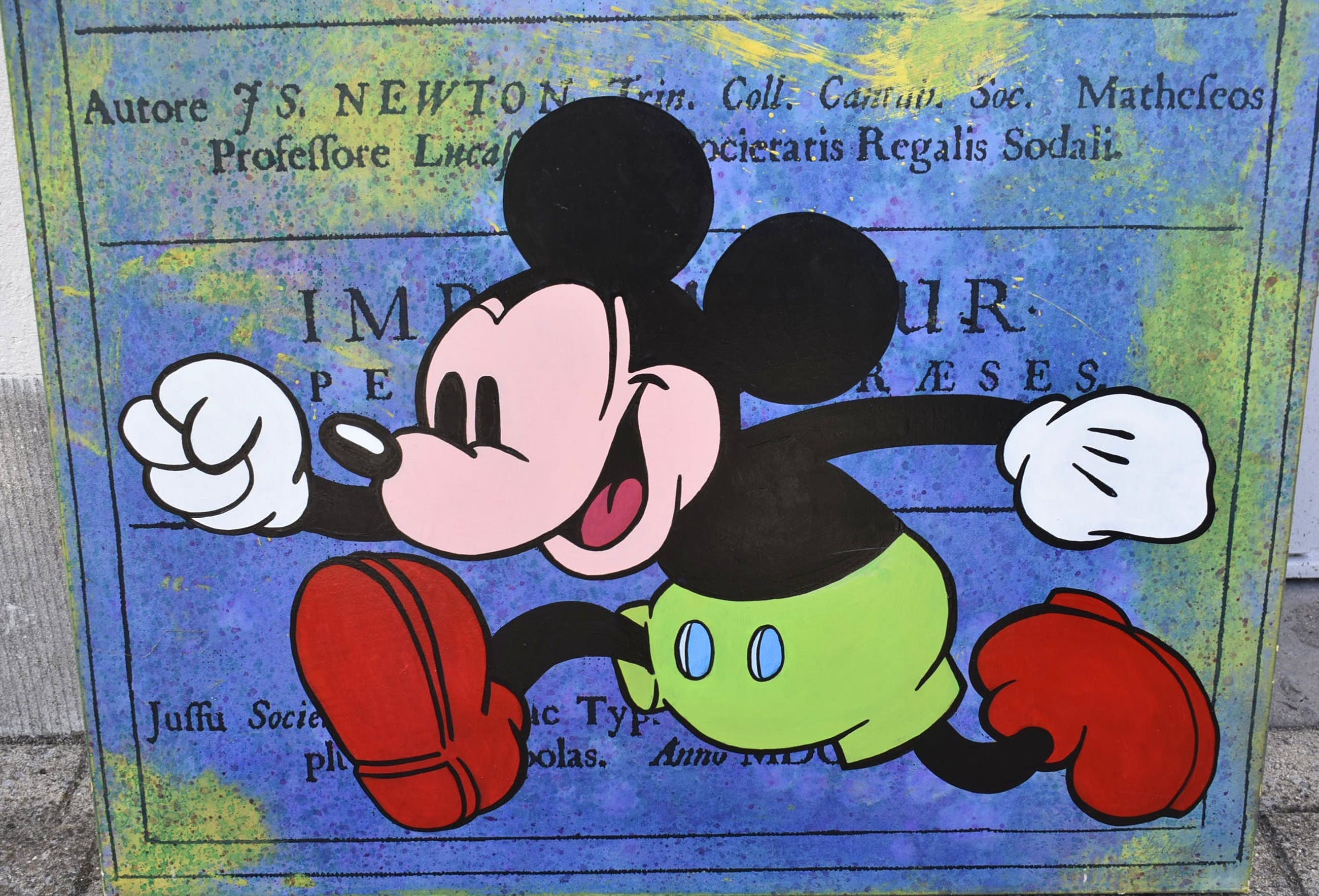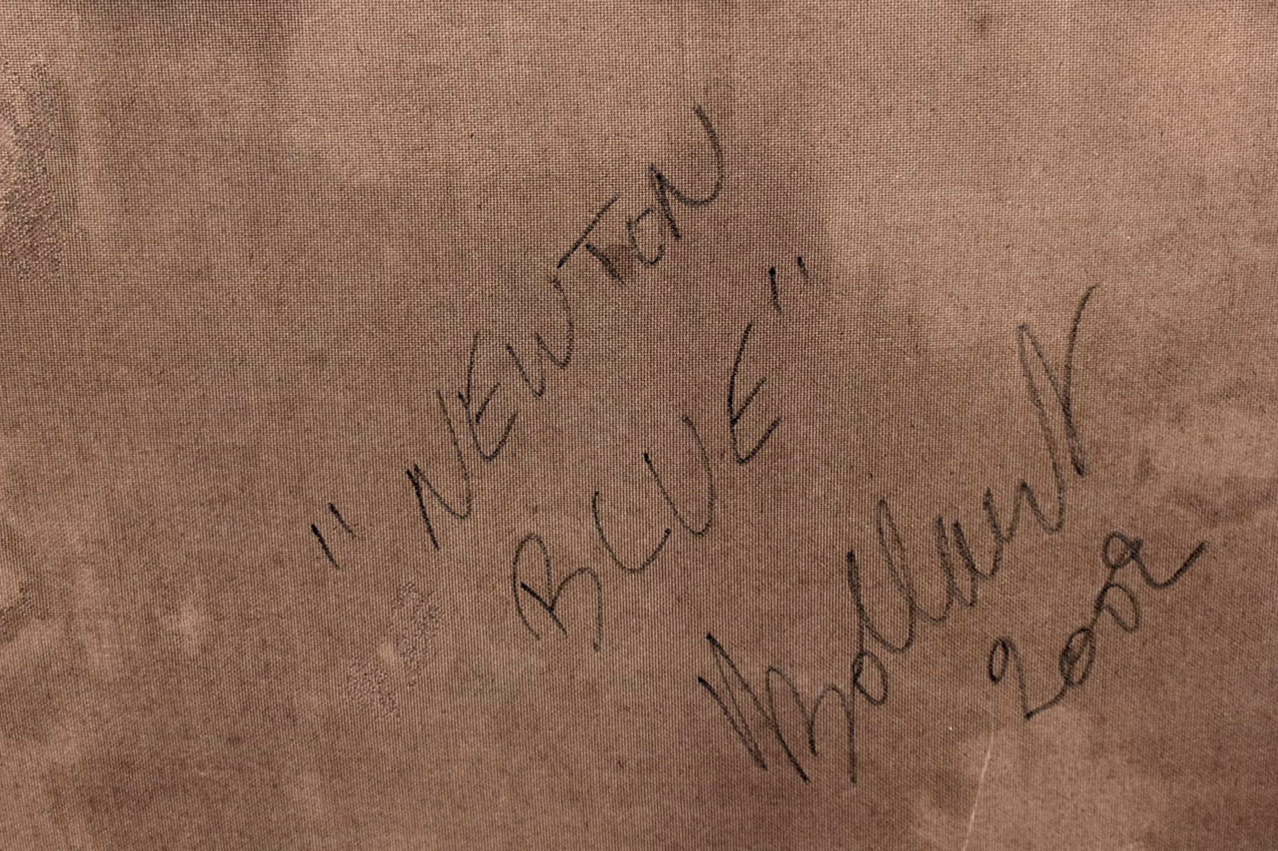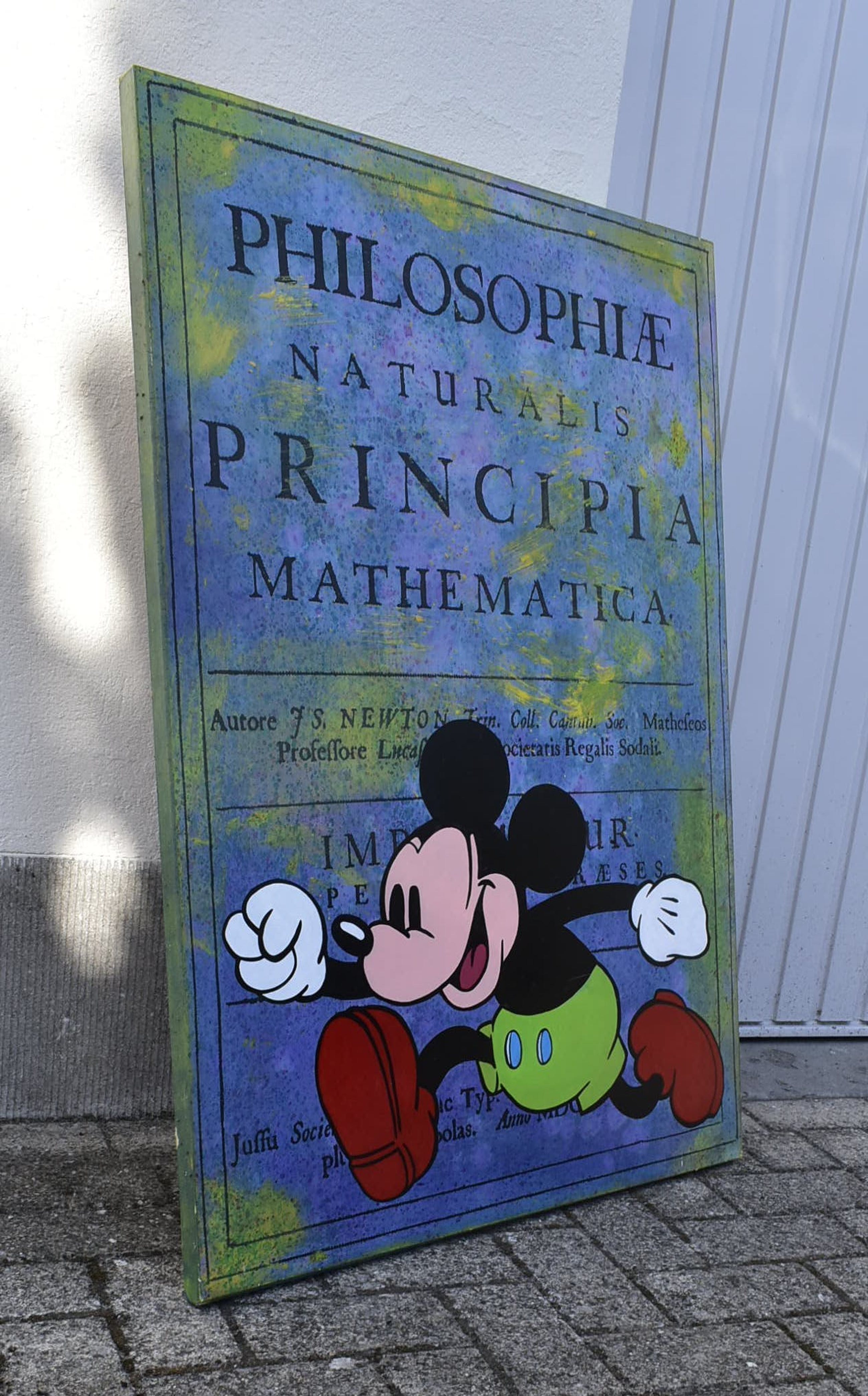 Acryl op papier gemaroufleerd (gelijmd) op doek, over lijst met hardboard gespannen.Achtergrond zijn uitvergrote historische boeken of documenten.Aflopend geschilderd dus hoeft geen lijst.
