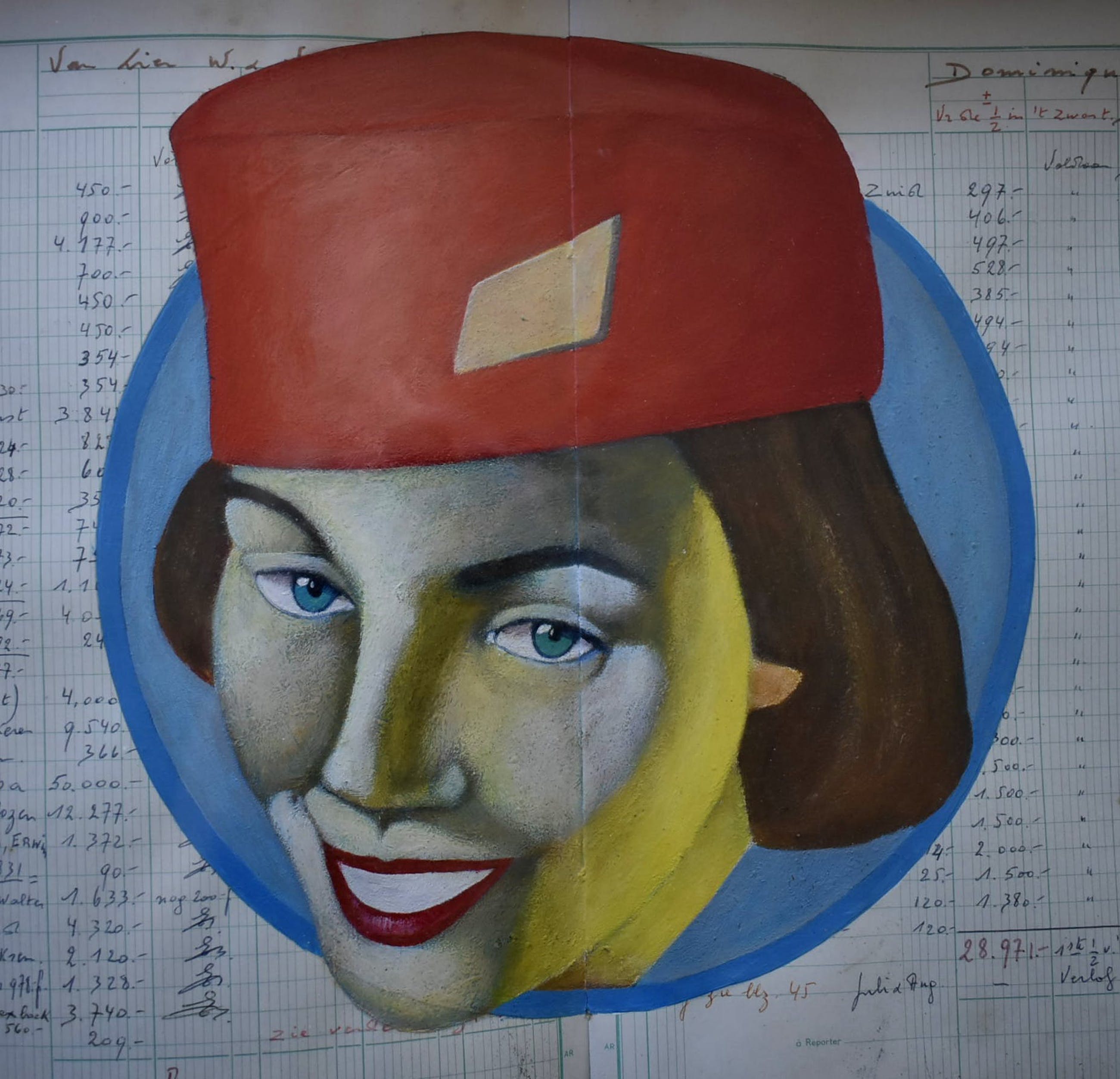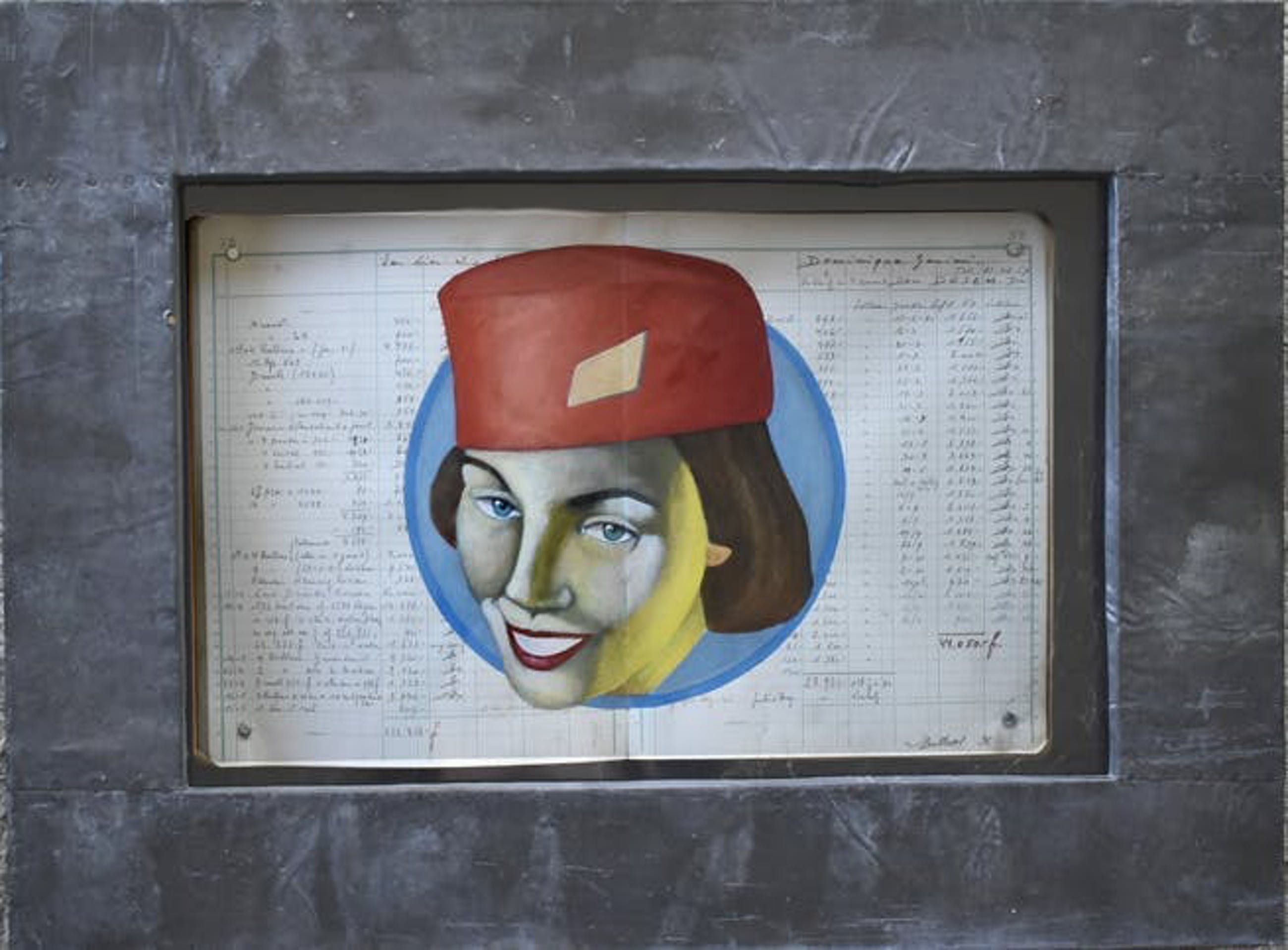 Dit werk bestaat uit een oud document (tijdschrift, boek, prent....) gedeeltelijk beschilderd met acrylverf. Vervolgens gemonteerd op een hardboard plaat en geplaatst in een houten lijst bedekt met hand genageld oud gepatineerd bladlood en beschermd door een acryl plaat.