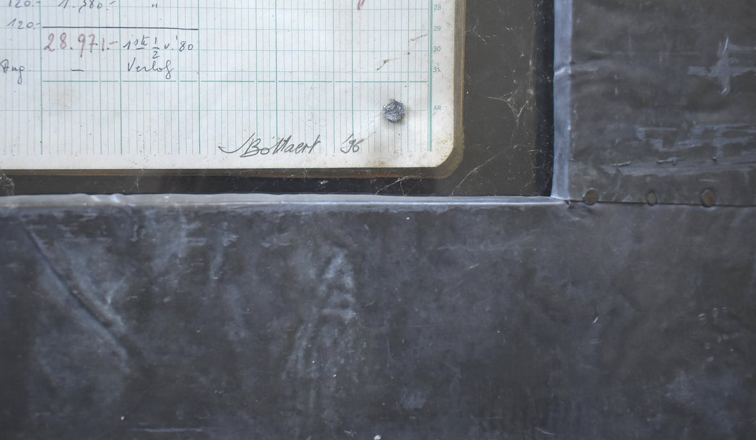 de lijst bestaat uit oud gepatineerd bladlood, dit over een houten lijst. Bladlood kan makkelijk ingedeukt worden, alle vervormingen aan het bladlood zijn een deel van de opzet van het kunstwerk, sommige heb ik zelf aangebracht, sommige zijn later bijgekomen. Zij geven eerder een meerwaarde dan dat ze als schade of slijtage beschouwd moeten worden. Het werk zelf wordt beschermd met een plaat acrylglas, acryl is gevoelig voor krassen. kleine krasjes die vanop 1 meter niet opvallend zijn worden beschouwd als normale slijtage door ouderdom, ook zij doen niets af aan de waarde van het werk. Dit is de enige reden waarom ik "goed" koos als conditie, en niet zeer goed. Dit is een algemene regel voor al dit soort werken, het wil niet zeggen dat dit of een ander werk ook maar één krasje heeft.