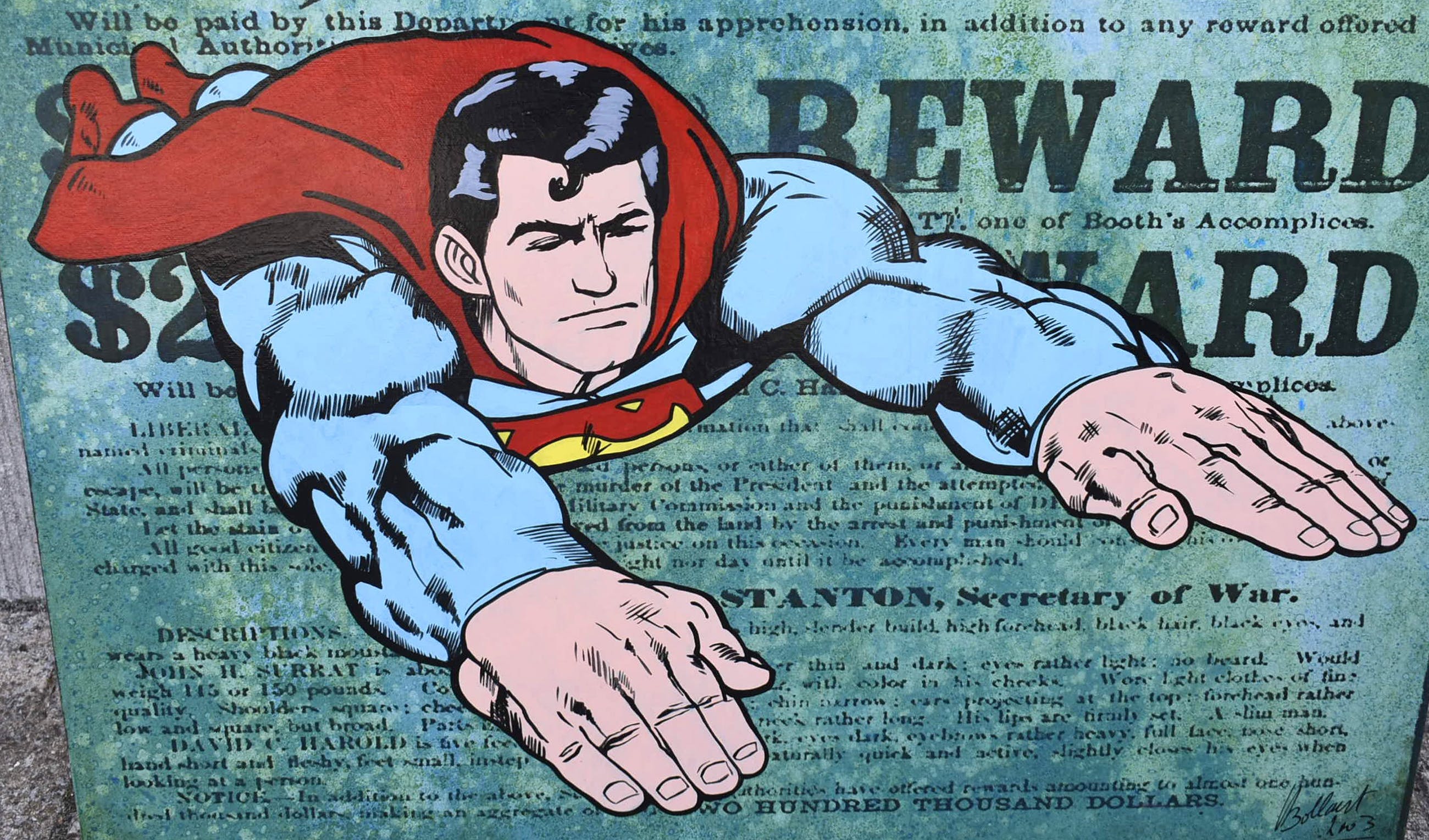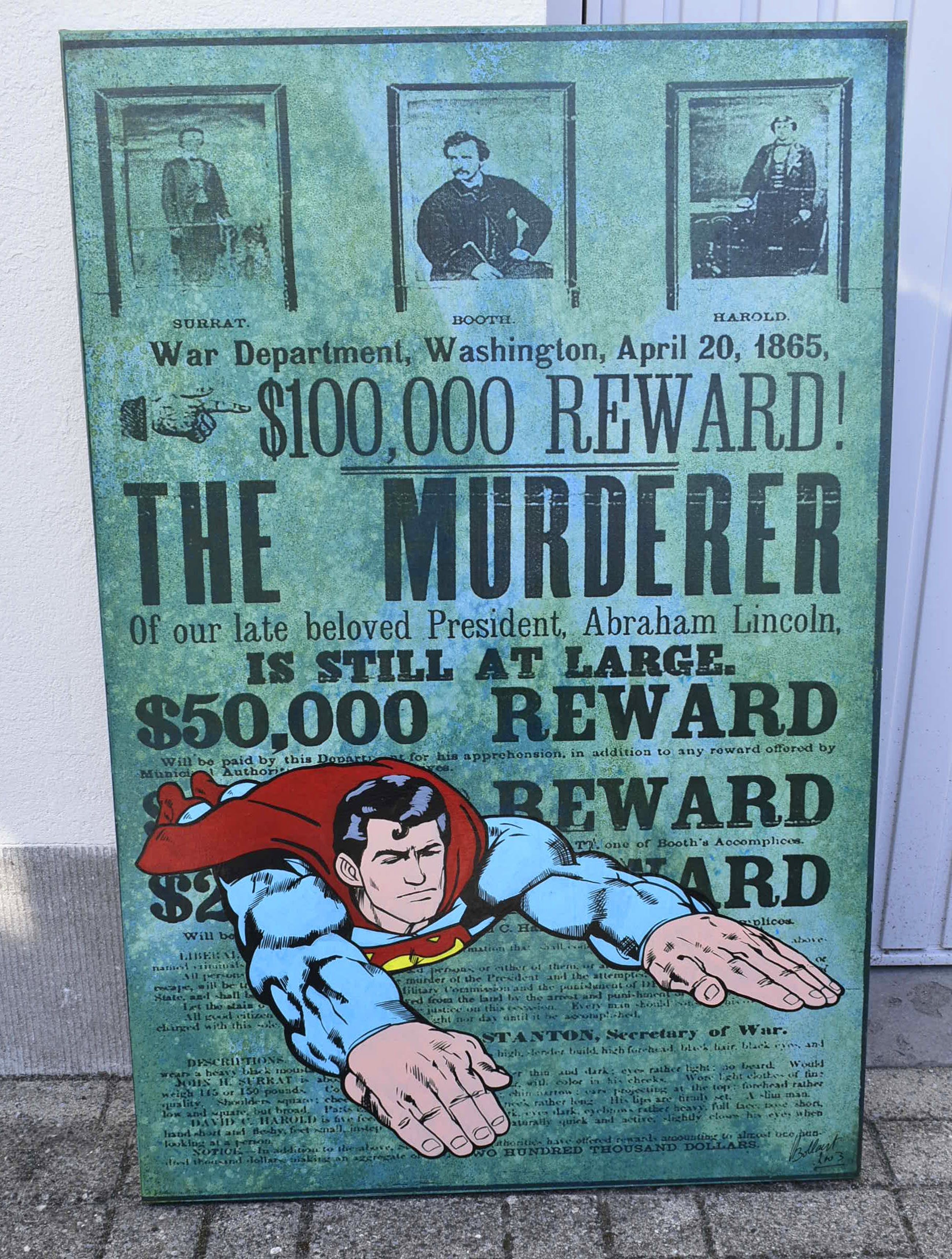 Acryl op papier gemaroufleerd (gelijmd) op doek, over lijst met hardboard gespannen.Achtergrond zijn uitvergrote historische boeken of documenten.Aflopend geschilderd dus hoeft geen lijst.