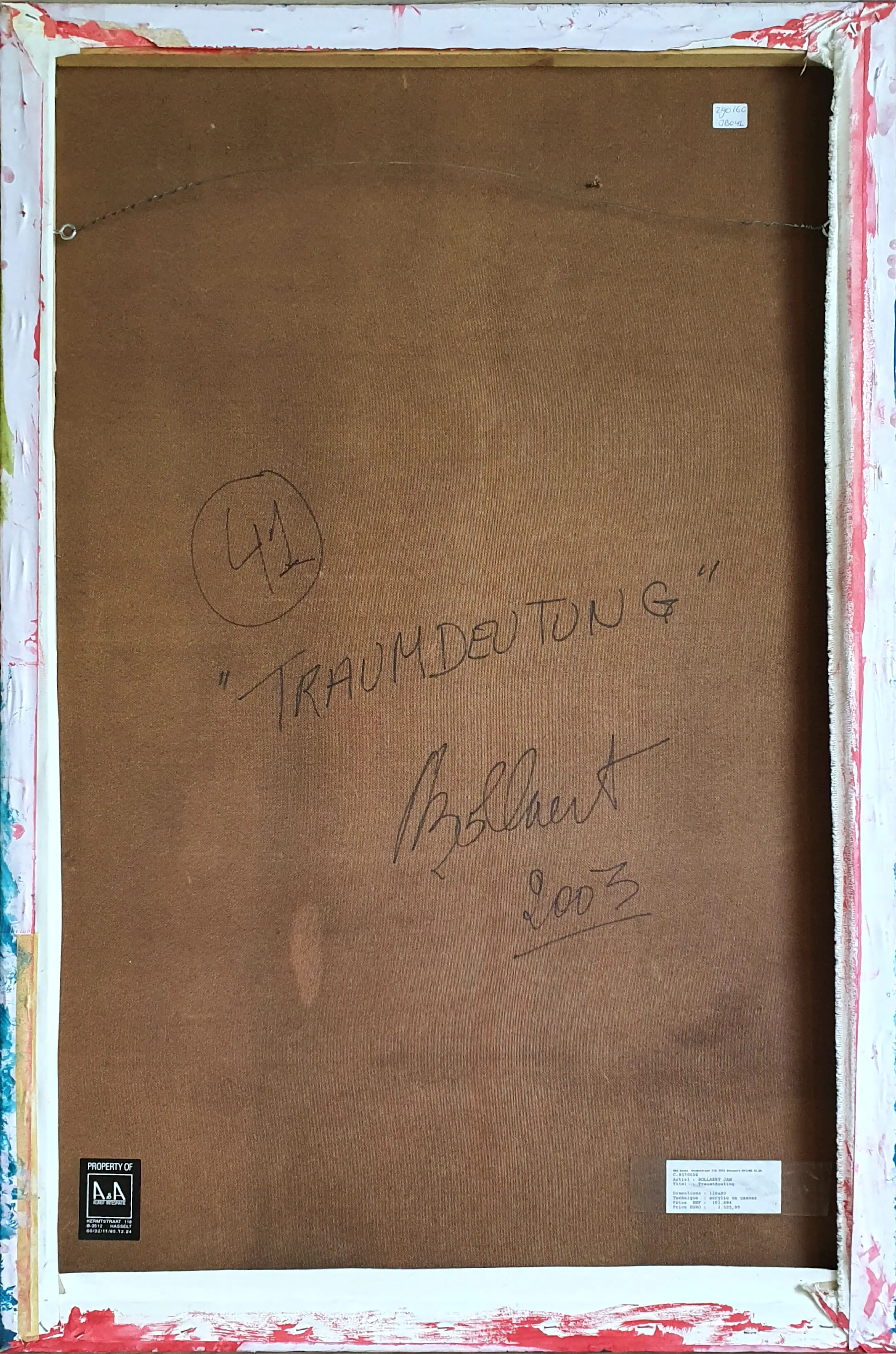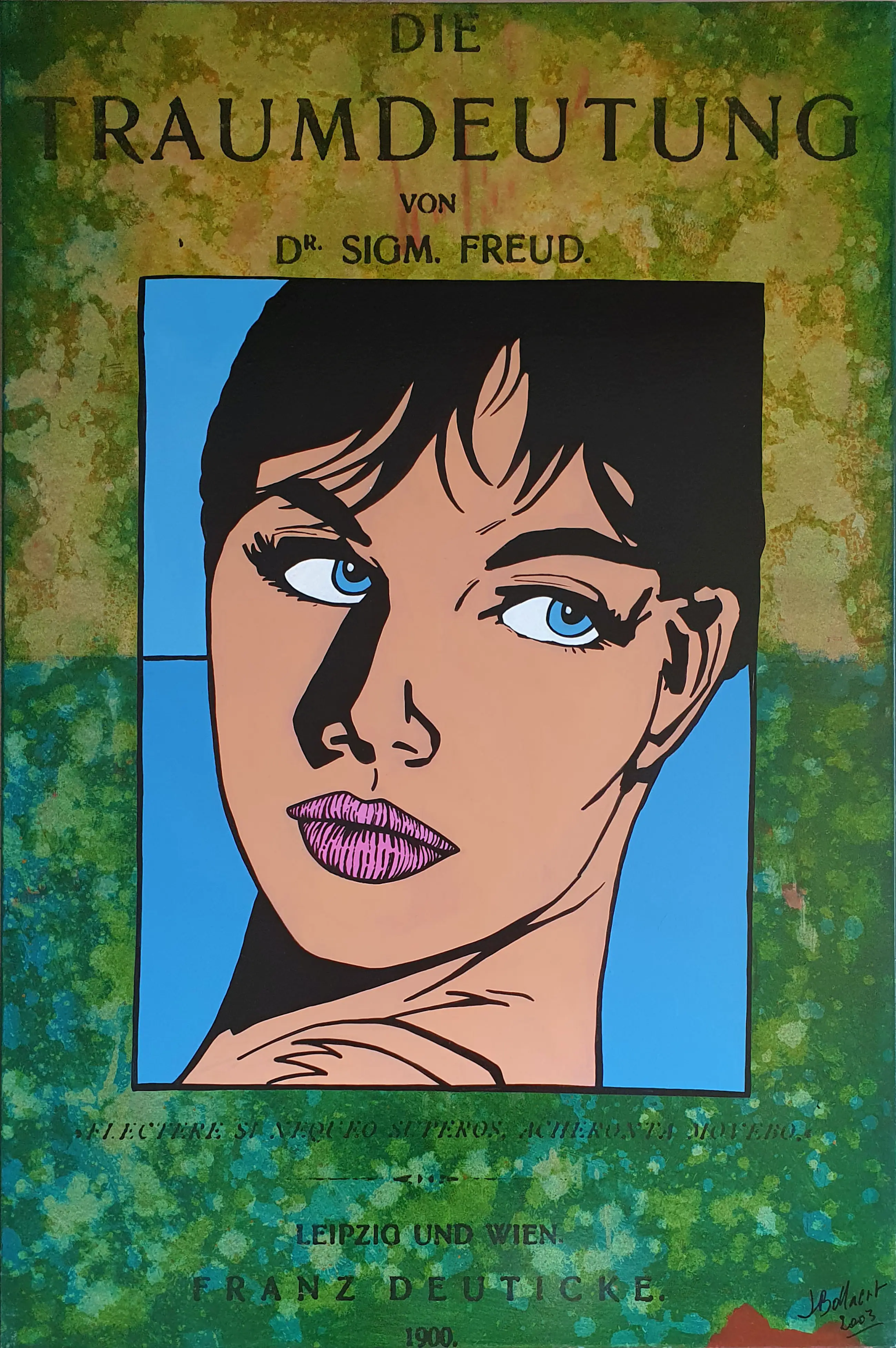 Mooi groot werk van Jan Bollaert. Acryl op papier, verlijmd op doek, over hardboard gespannen. De achtergrond is vervaardigd uit uitvergrote historische boeken.