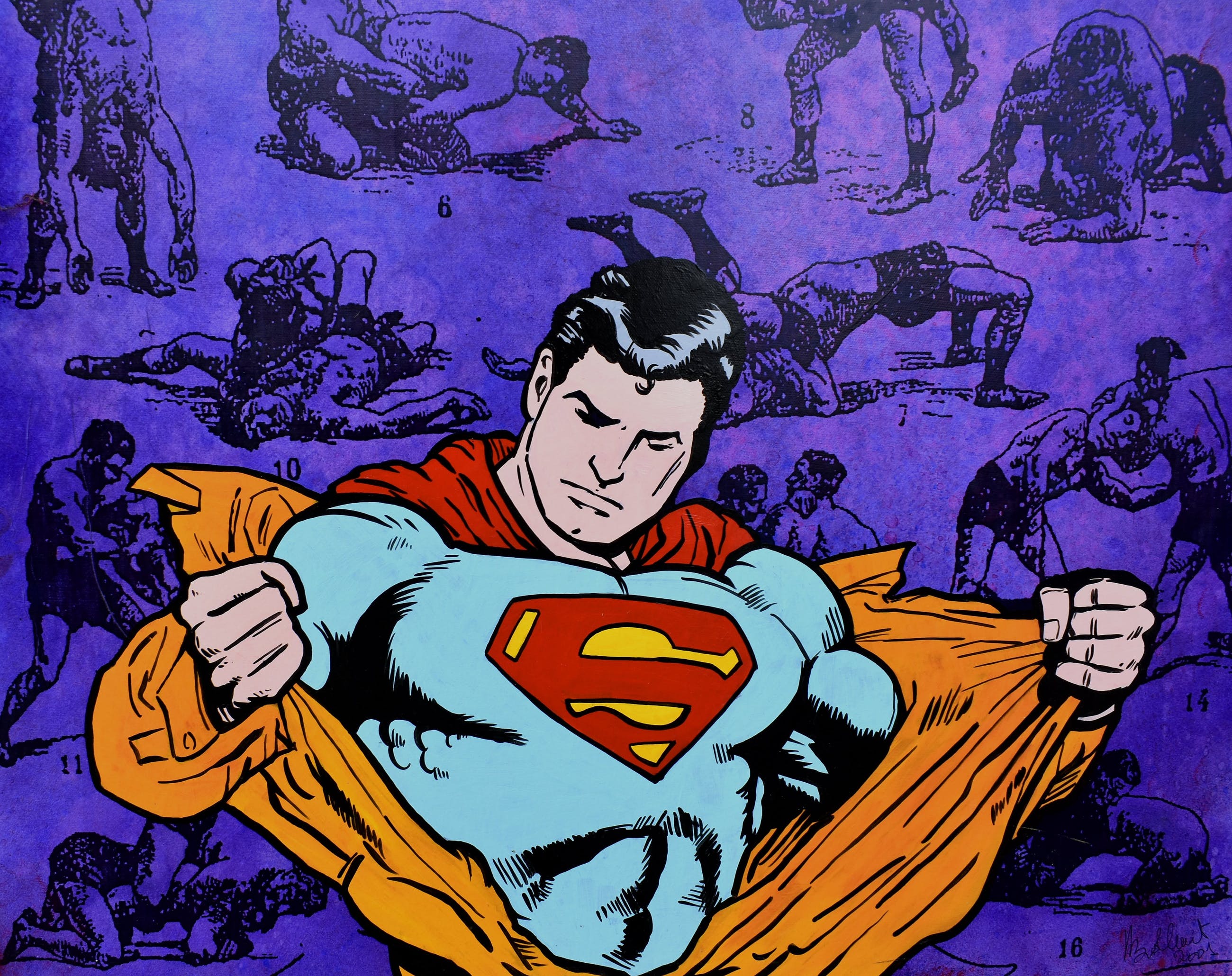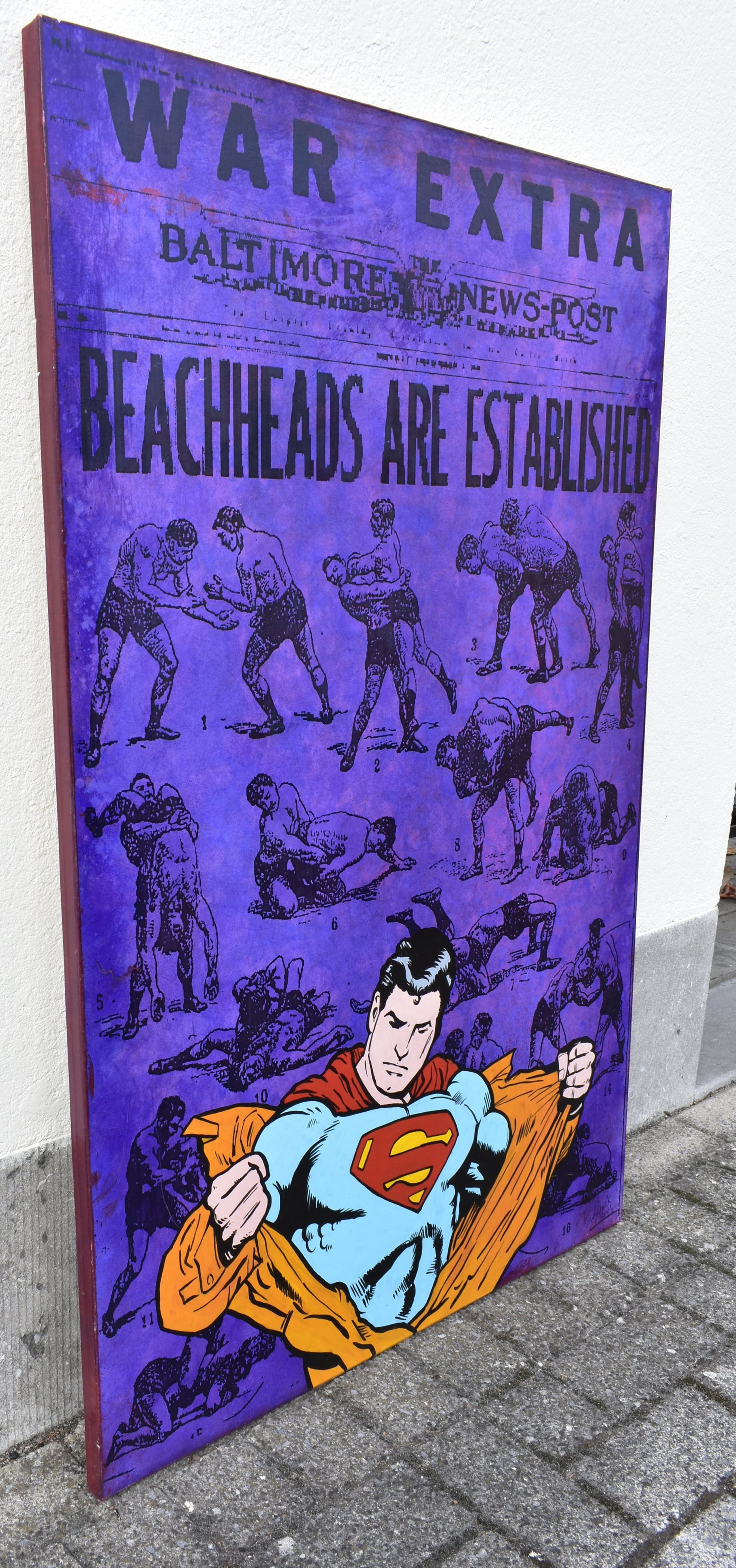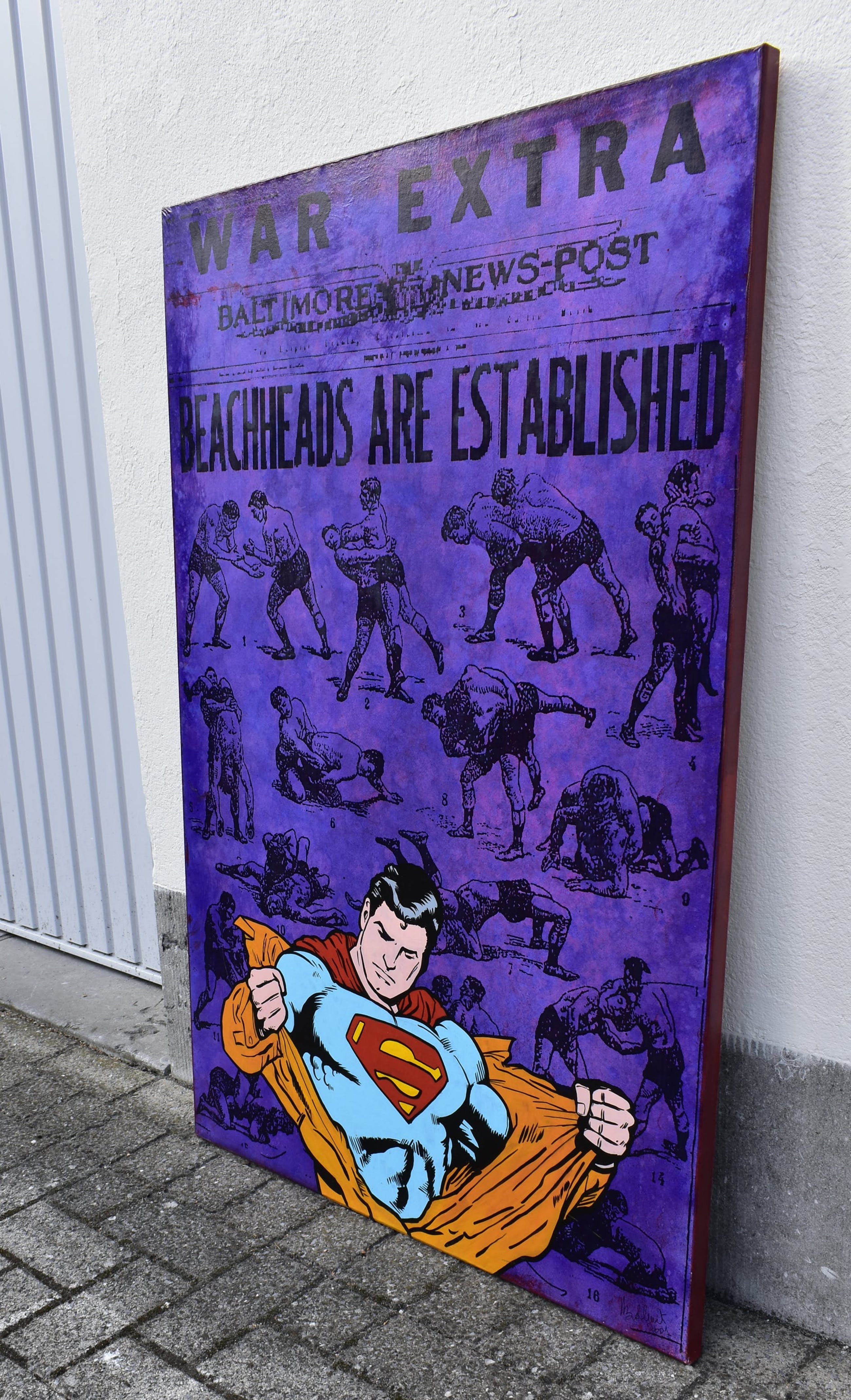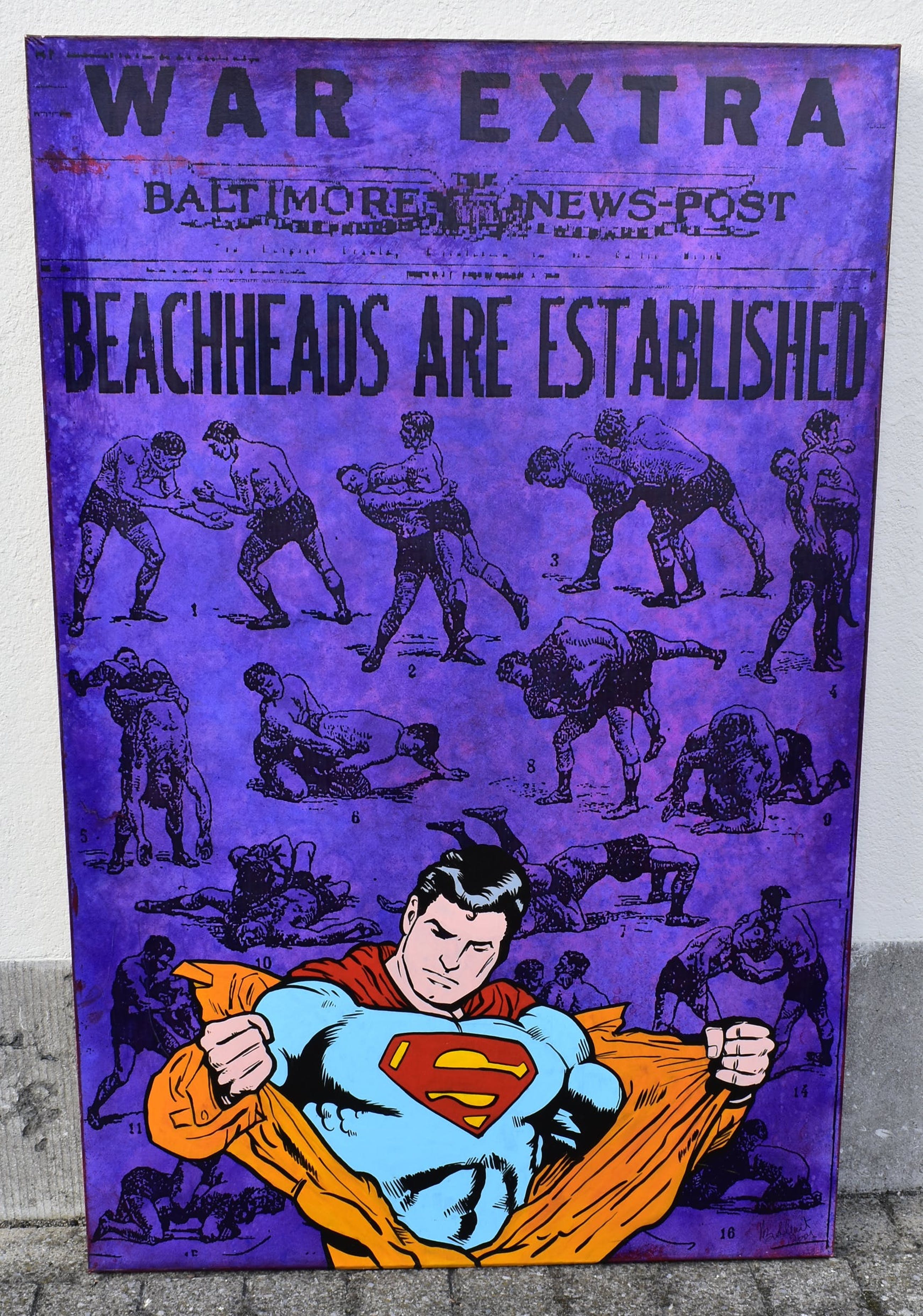 Acryl op papier gemaroufleerd (gelijmd) op doek, over lijst met hardboard gespannen.Achtergrond zijn uitvergrote historische boeken , documenten, kranten of zelf gemaakt samenstelling.Aflopend geschilderd dus hoeft geen lijst.