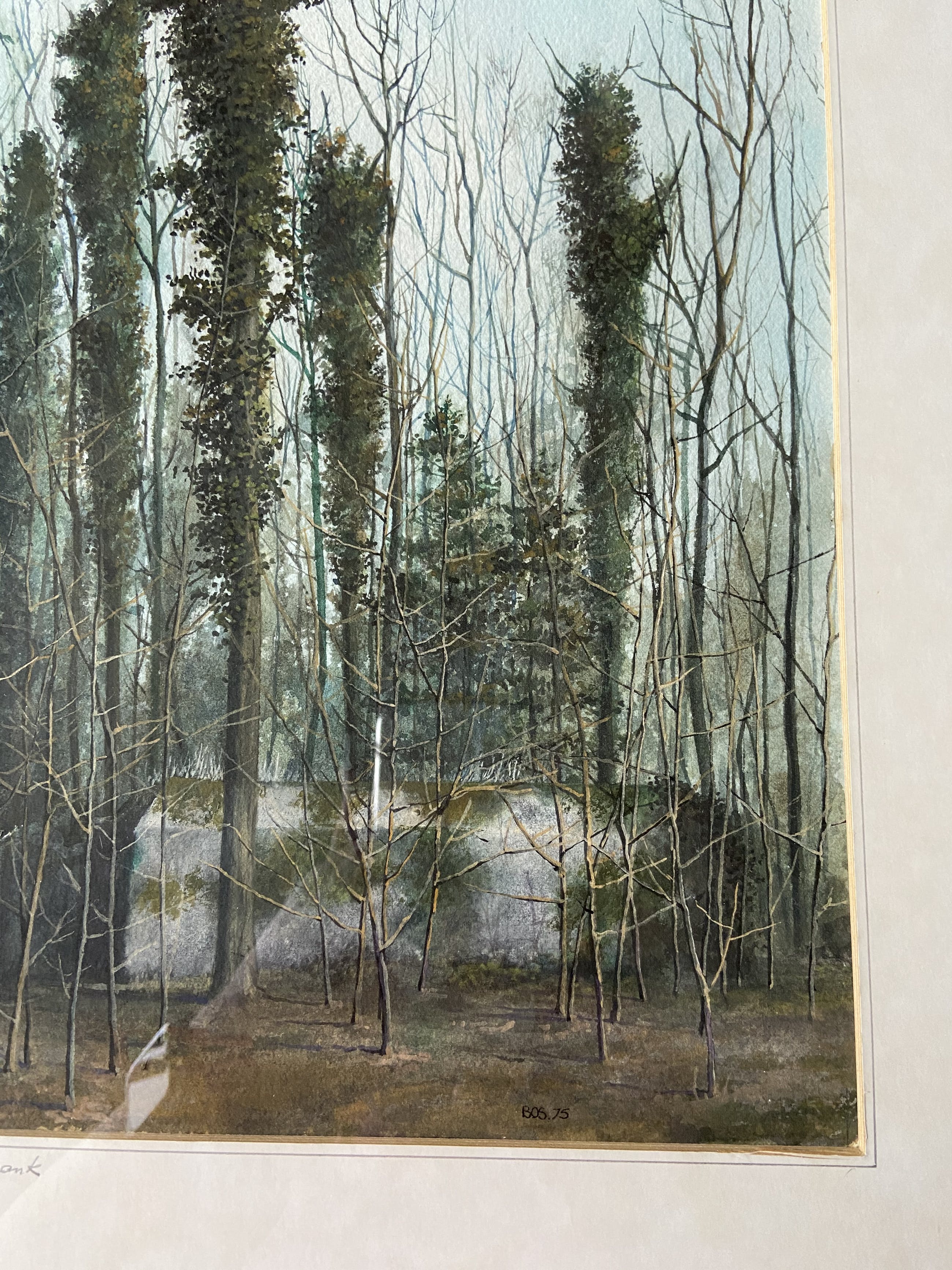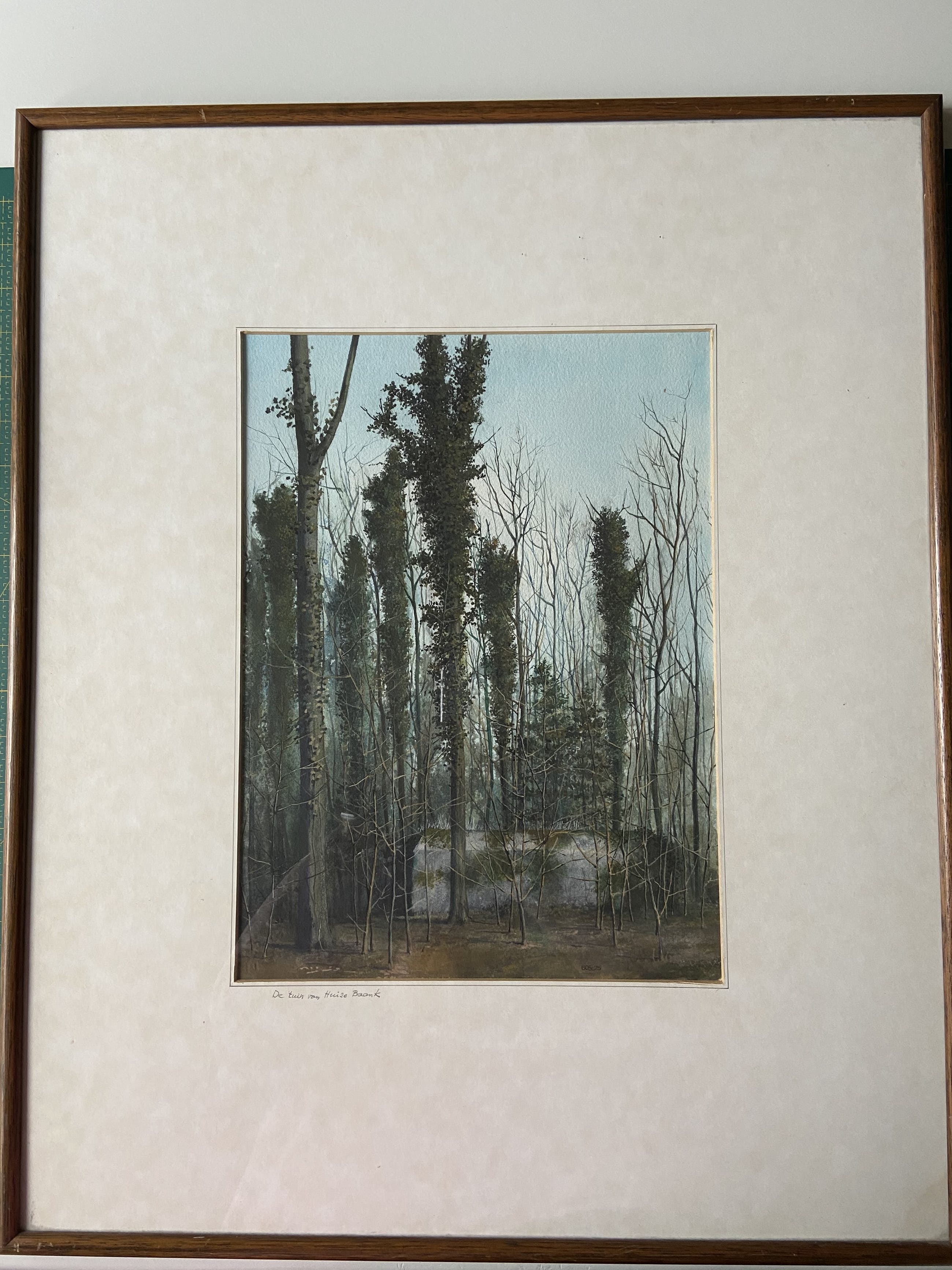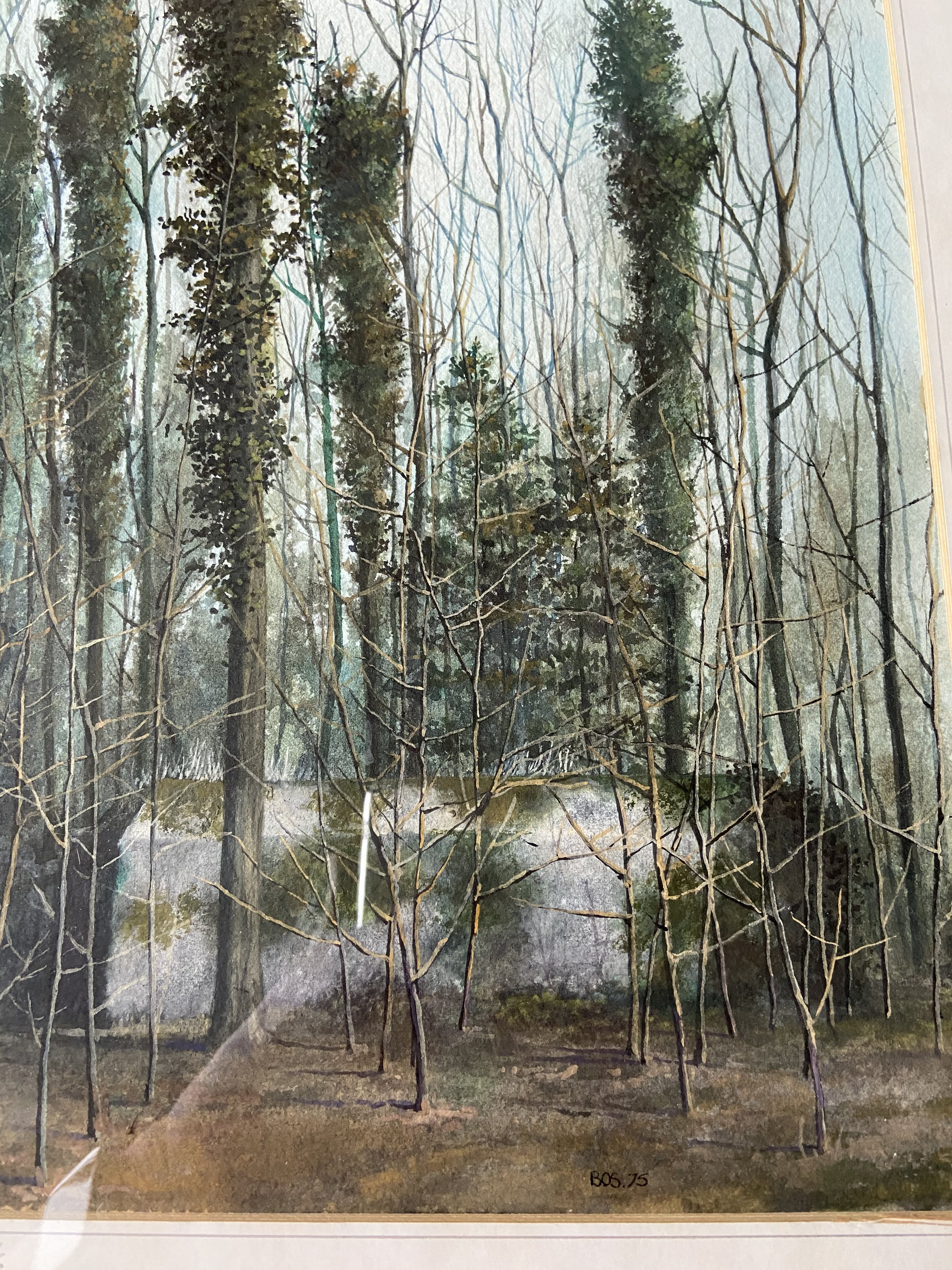 Fraaie aquarel met tussen de bomen de contouren van een bunker.