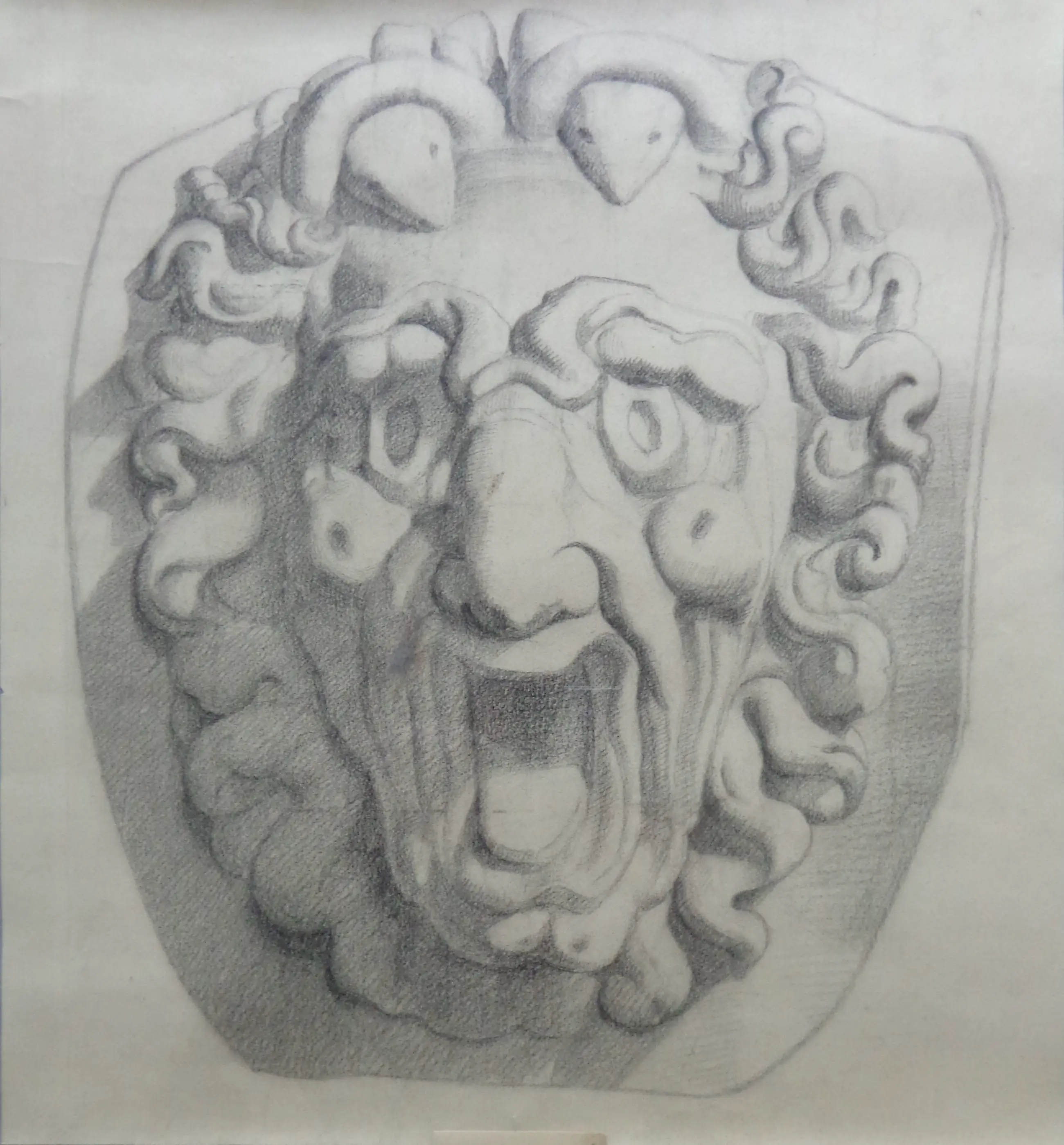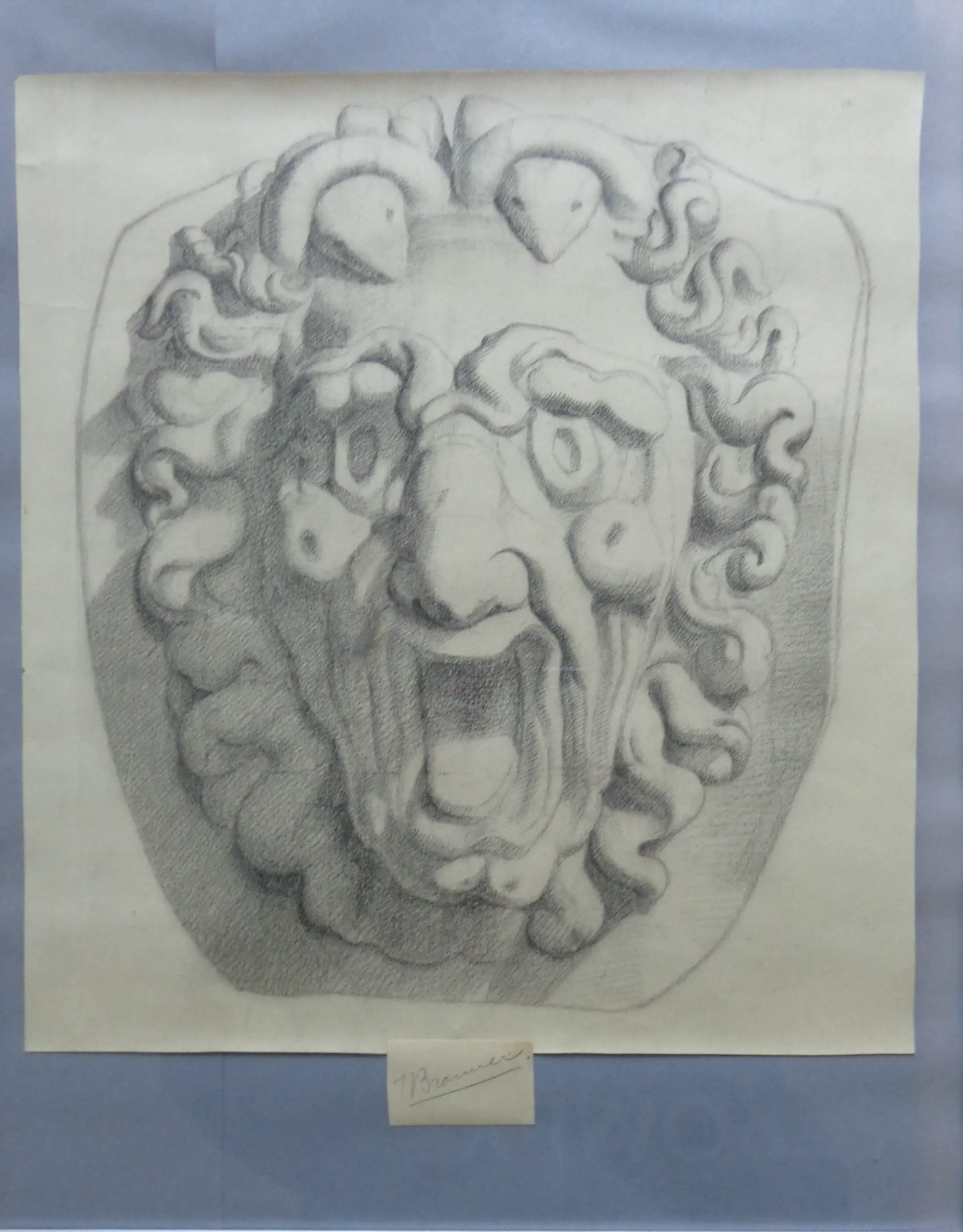 Jan Bronner (1881-1972). Ontwerptekening voor ornament of beeldhouwwerk. Origineel werk van houtskool op papier. Gesigneerd met houtskool (op apart blaadje, mee ingekaderd). (1899). Jeugdwerk van de kunstenaar (op 18-jarige leeftijd). Blad: 38x35cm. Kader: 51x41cm. Goede staat.