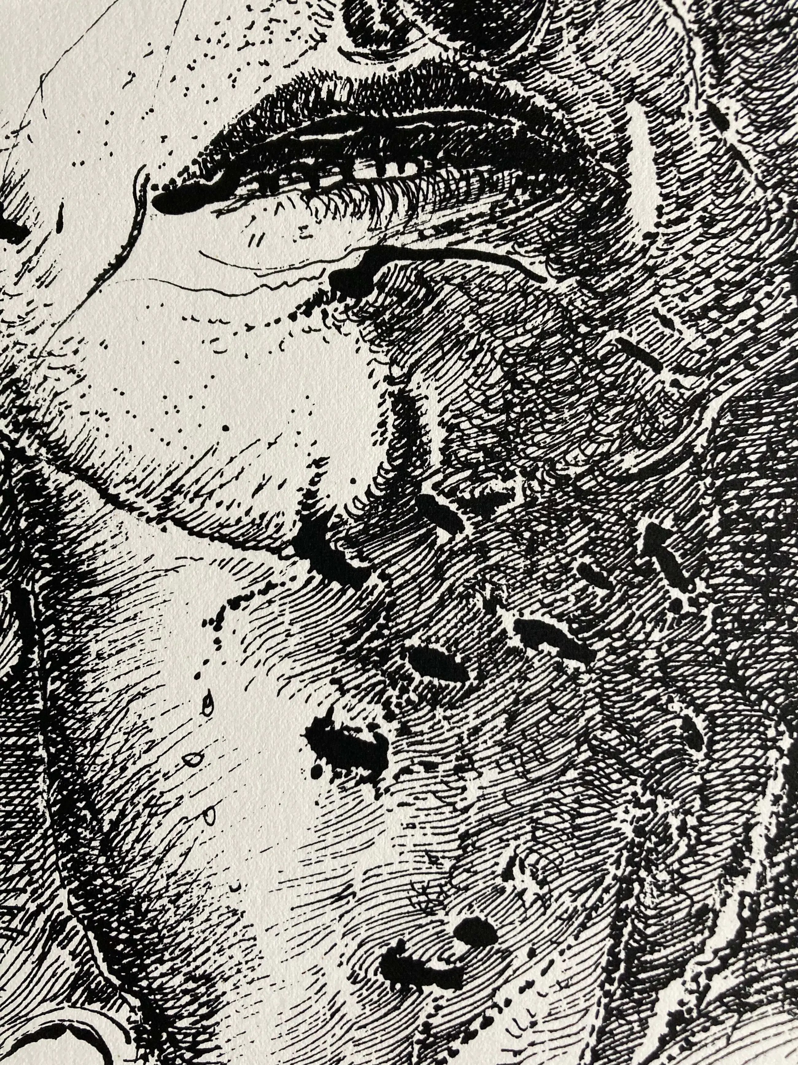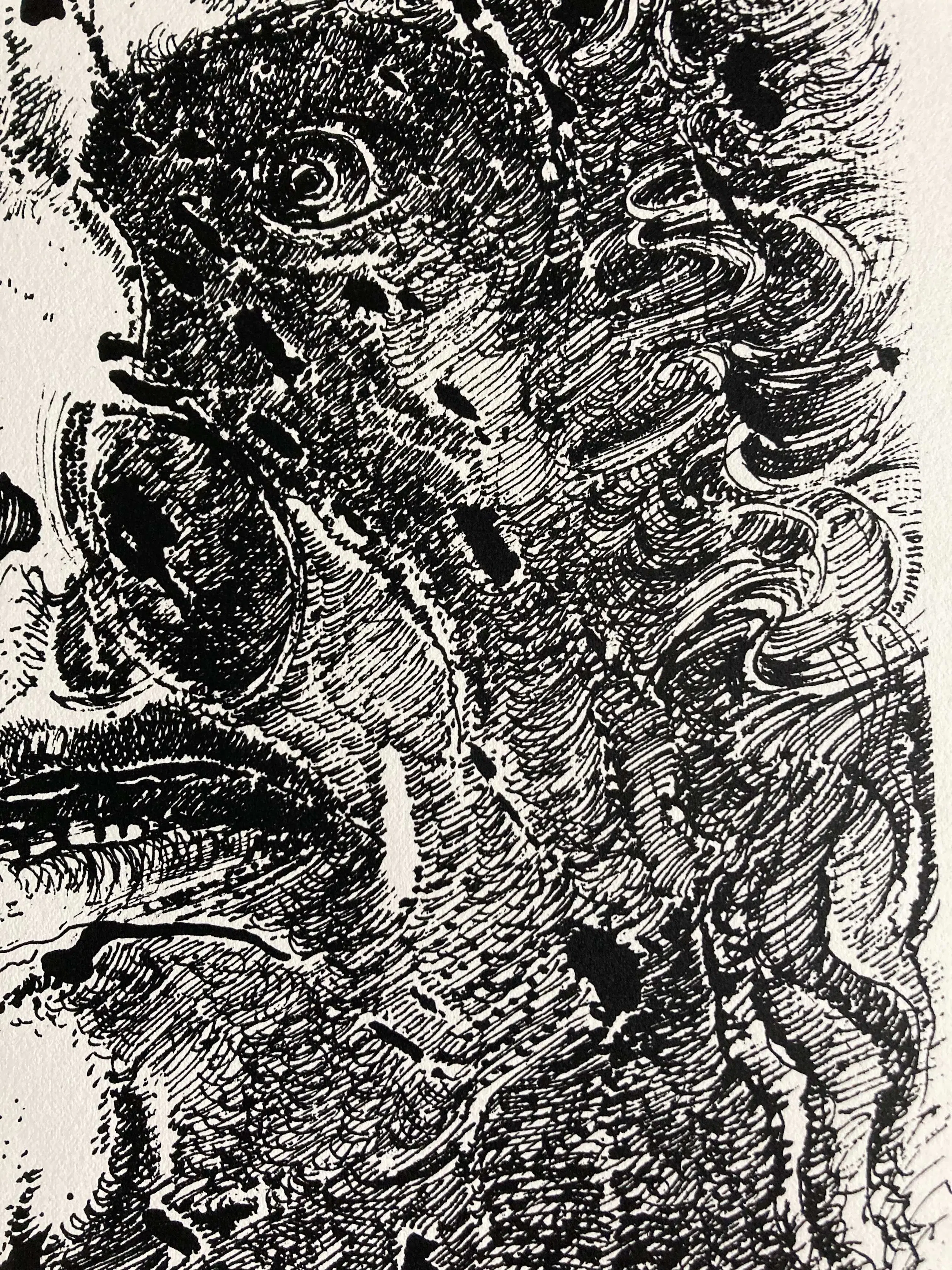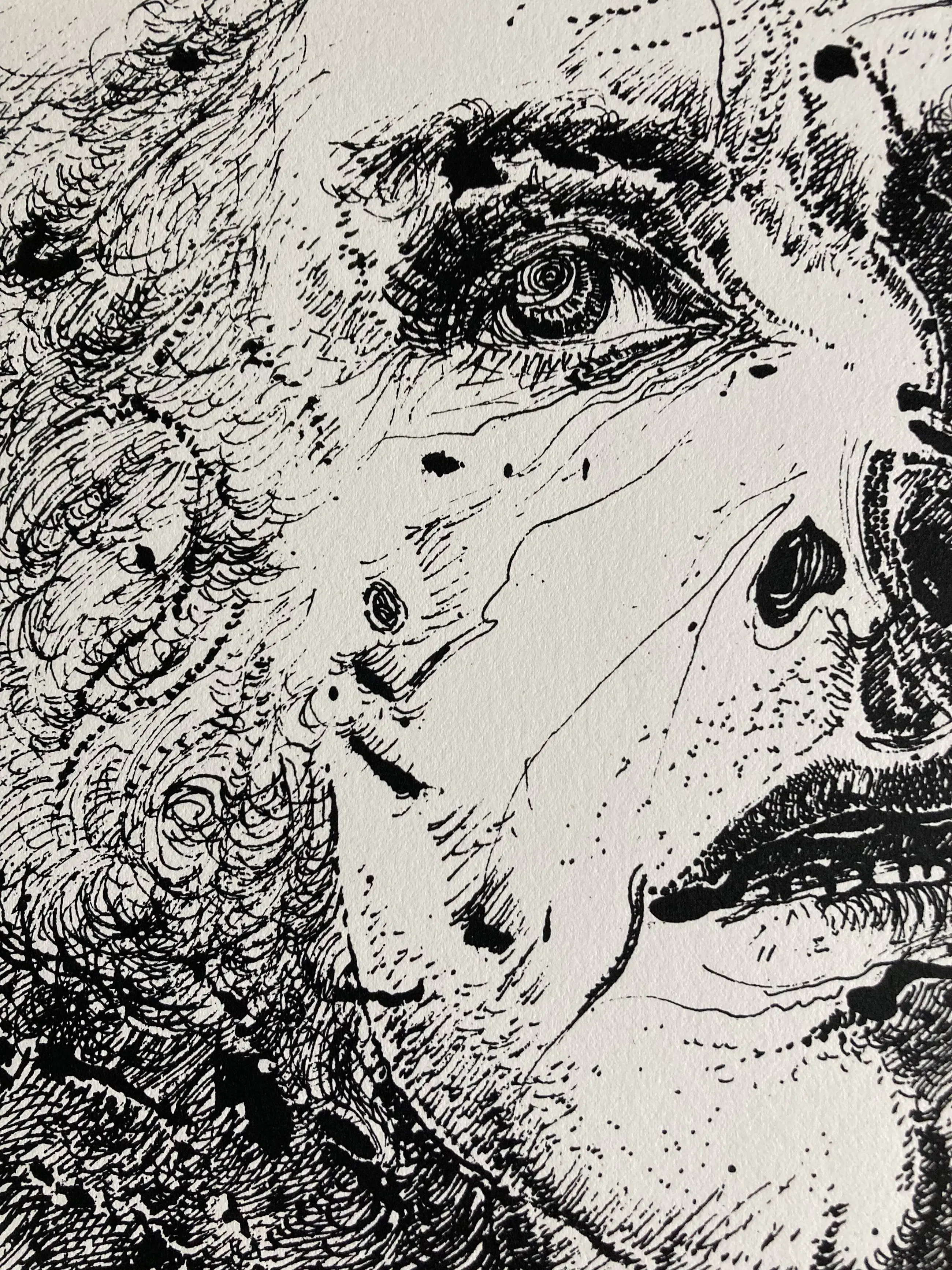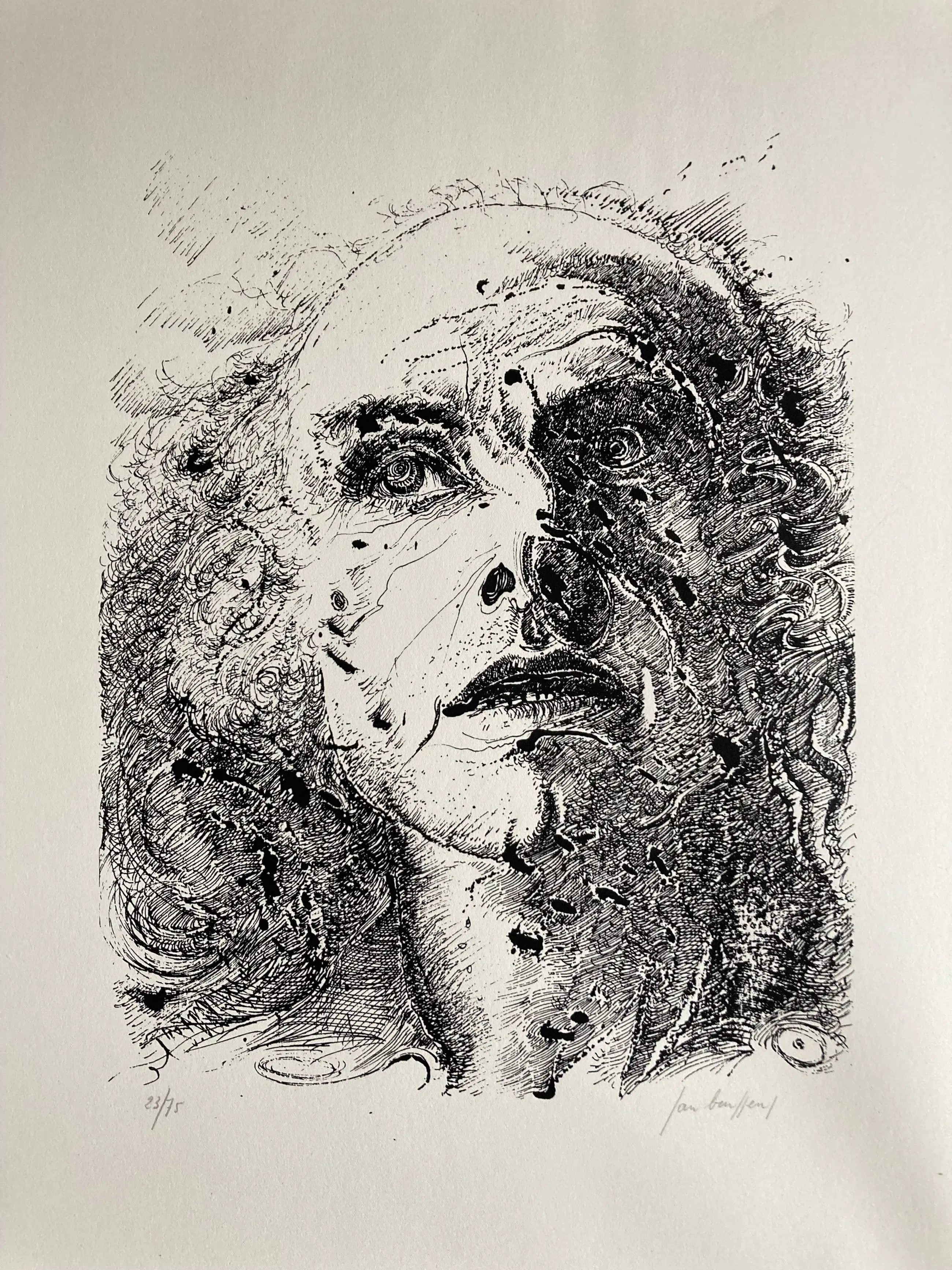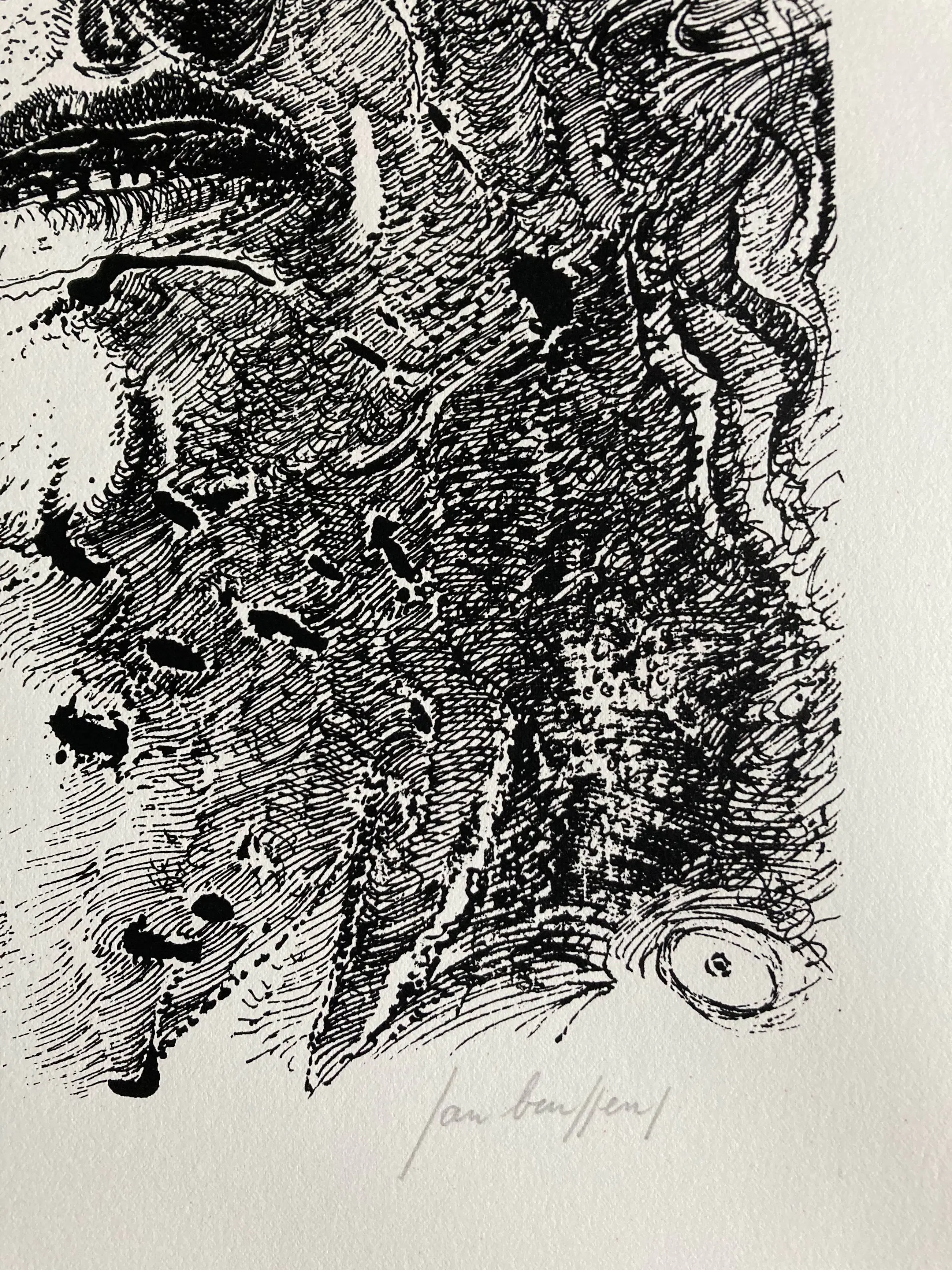 Zelfportret van de Vlaamse kunstschilder en graficus Jan Burssens (Mechelen 1925 – Nevele 2002). Hij wordt beschouwd als een van de voornaamste Vlaamse existentialistische materieschilders. Hij genoot een beperkte opleiding van een jaartje aan de Academie van Gent (waar hij later leraar werd) en bleef voor de rest autodidact. Hij vertrok in 1946 naar Nederland, waar hij in contact kwam met Karel Appel en Corneille en de dichters Bertus Aafjes en Gerrit Achterberg. Eind jaren ’40 begon Burssens te experimenteren met zand, keitjes en schelpen in zijn verf om bepaalde kleureffecten en texturen te creëren. Ook de driptechniek deed zijn intrede. In 1951 en in 1954 werd hij onderscheiden bij la Jeune Peinture Belge. In 1952 stichtte hij de groep Art Abstrait maar het dogmatische karakter van het programma van de groep dwong Burssens, die tegelijkertijd nog steeds met een ‘abstracte-figuratie’ aan het experimenteren was, “Art Abstrait” al na een jaar te verlaten. Dit betekende voor Burssens een bevrijding: hij ging zijn eigen weg en dit resulteerde in de meest creatieve en originele periode in zijn carrière. Hij evolueerde van lyrische abstractie naar figuratief expressionisme en werd ‘de schilder van de binnenkant’ en gaf het essentiële van de geportretteerde weer. “Gedreven door de drang naar verdieping, vervagen de figuratieve alibi’s om tekens en aanklachten te worden. Menselijke en dierlijke figuren spreken een picturale taal vol afschuw, verscheurdheid en tederheid, monsters met zachte zinnen, geharnaste en ongenaakbare borstwering rond een kwetsbaar hart”. Zijn terugkeer naar de figuratie en meer bepaald naar de portretschilderkunst vanaf 1965 resulteerde in een reeks van schilderijen die hij maakte rond Che Guevara en Chino. Deze portretten illustreren Burssens’ voorliefde voor de kunst van Goya en Velasquez. Hij nam deel aan de Biennale van Venetië (1958) en de Documenta (Kassel, 1959), en zijn werk is aanwezig o.m. in Musea te Brussel, Kortrijk, Gent en Oostende, maar ook in het Guggenheim in New York.