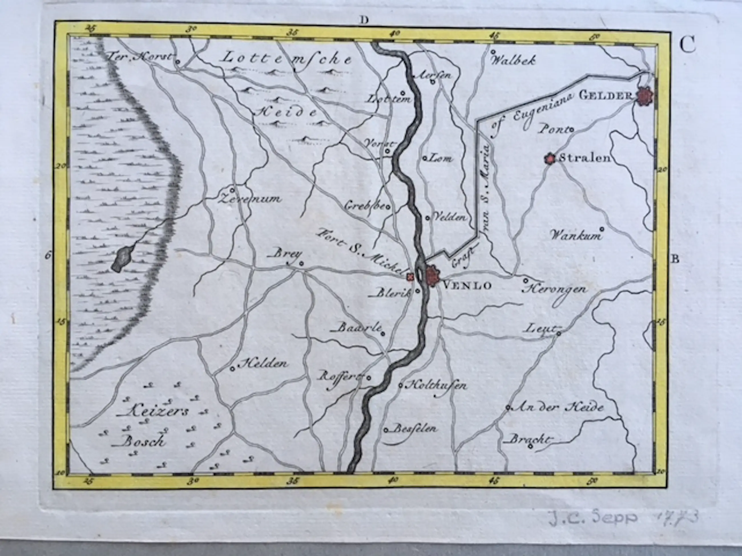 Oud, antiek landkaartje van de regio Venlo.