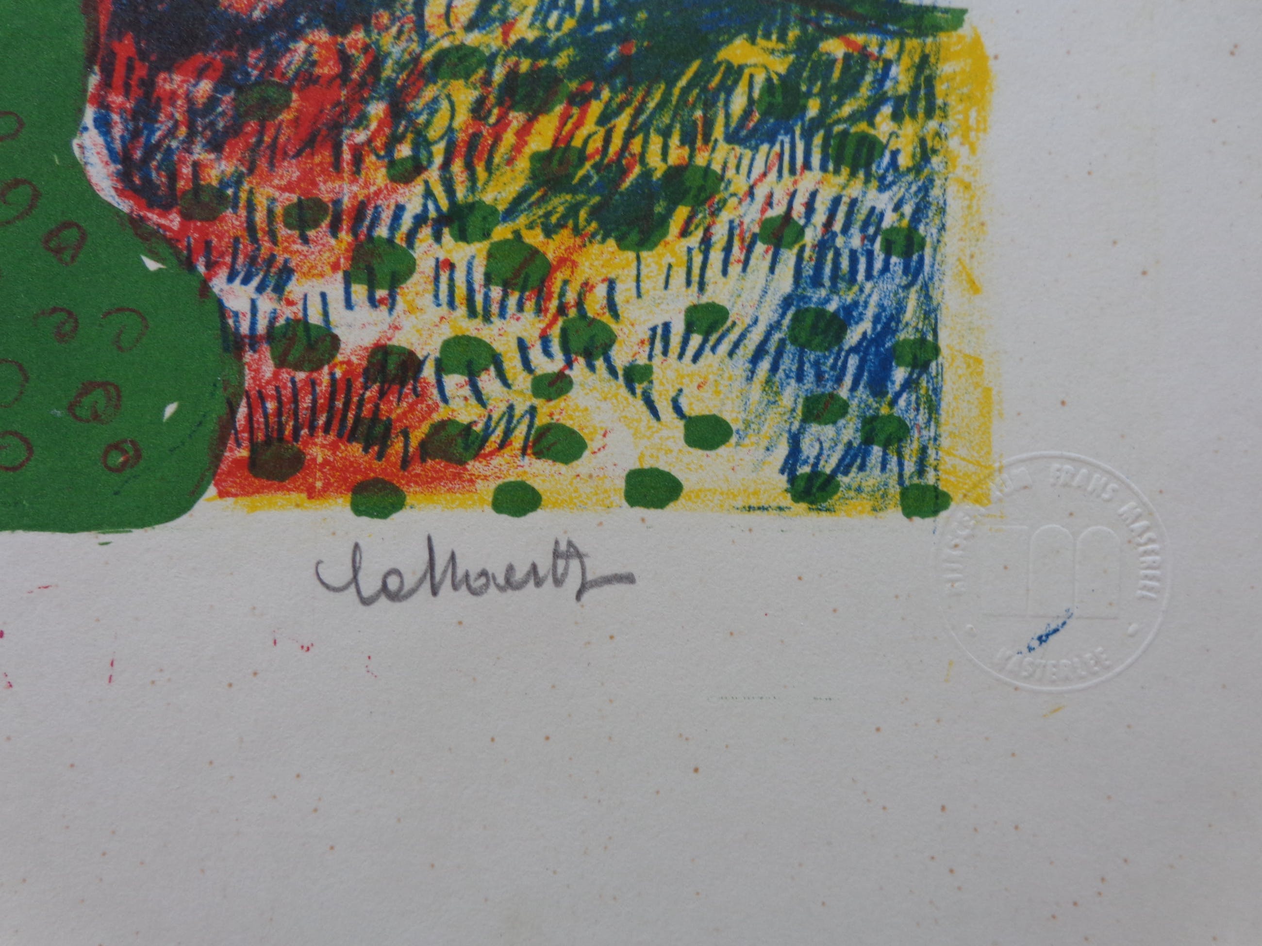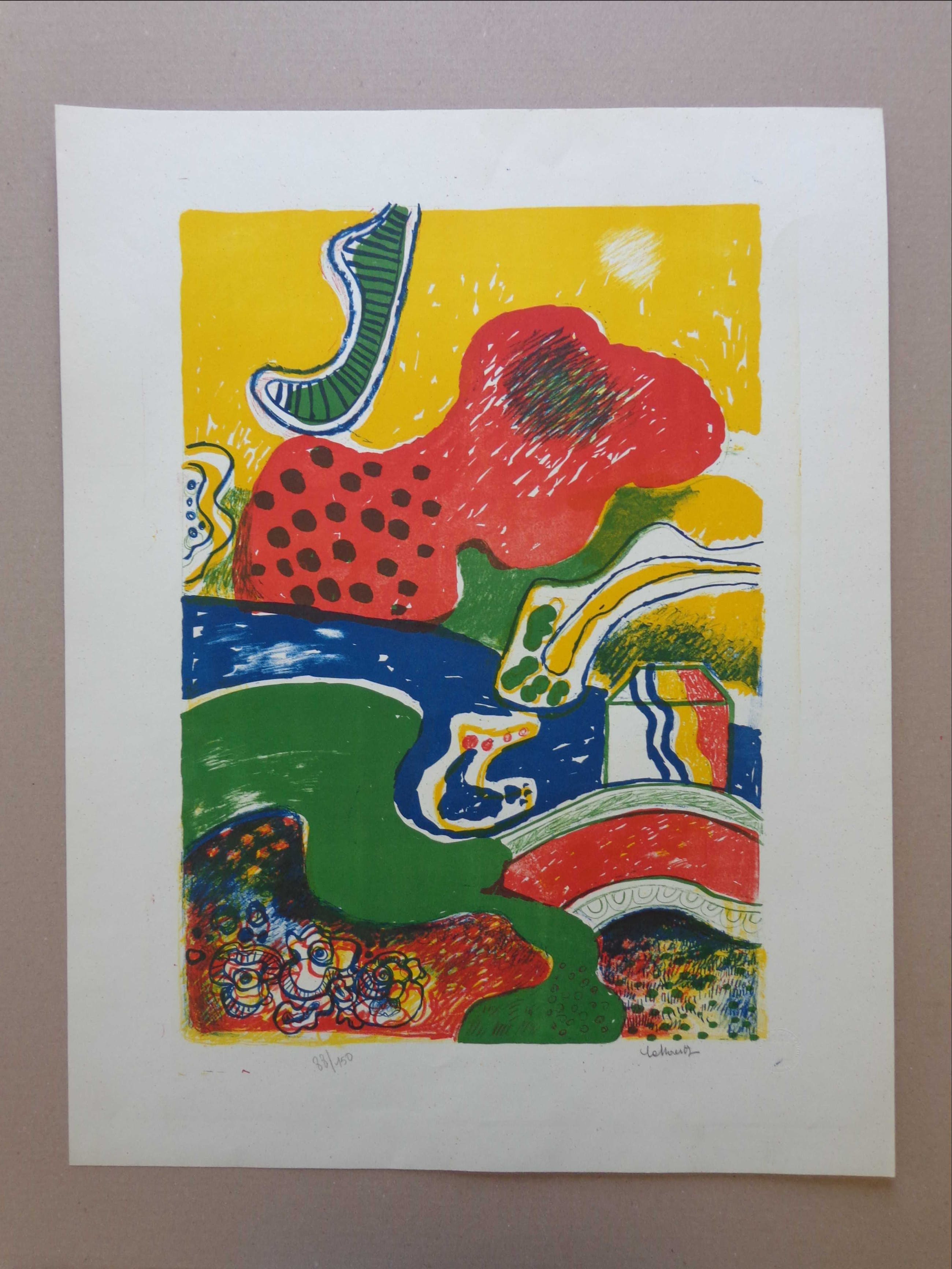 Kleurlithografie op papier (met spikkels in het papier, zo uitgegeven).