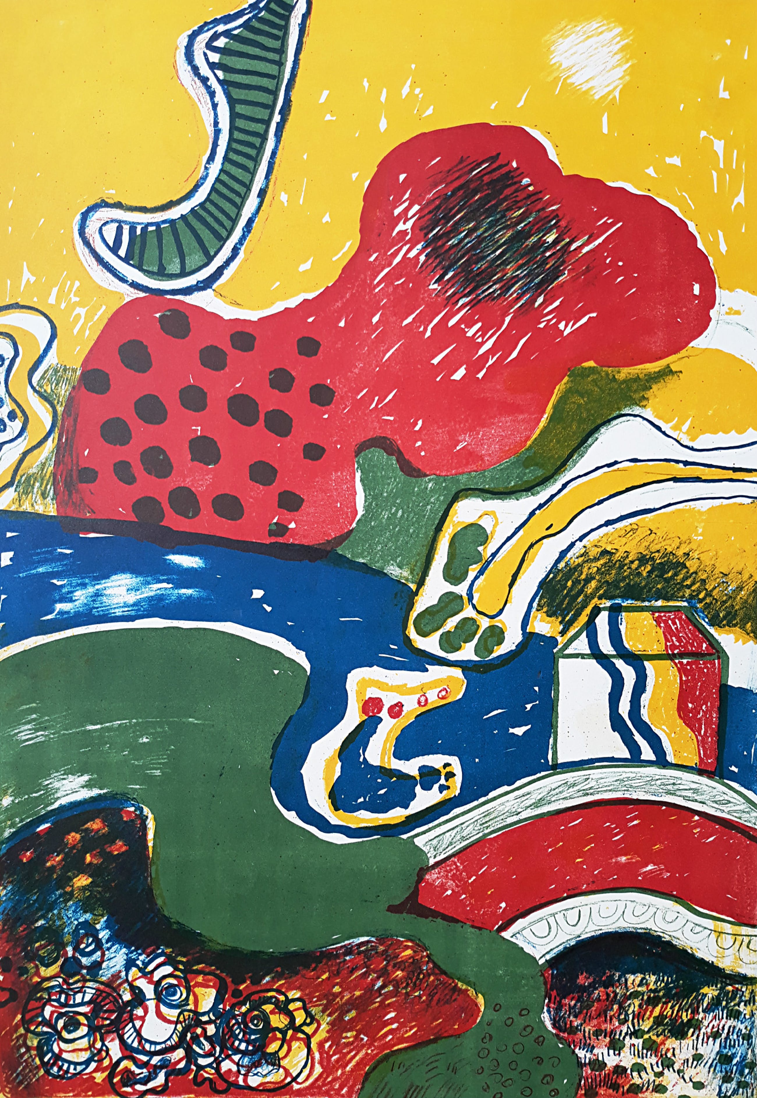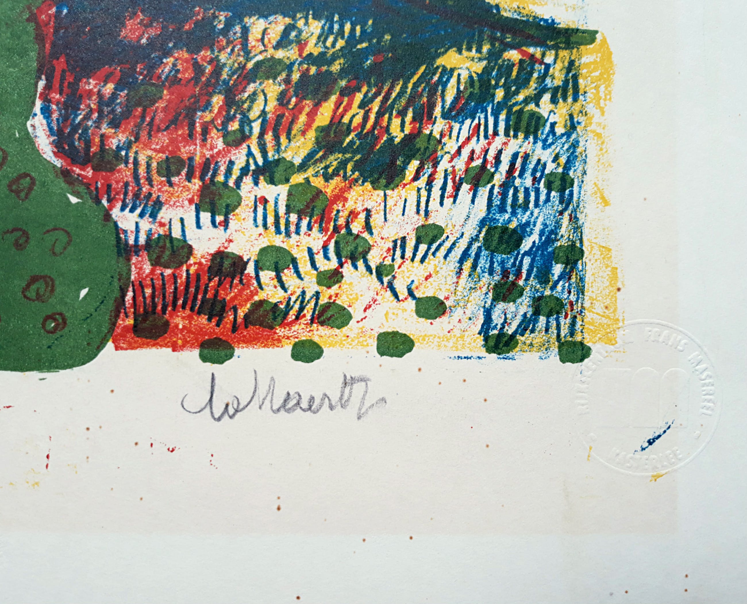 Bekend werk van de Belgische kunstenaar Jan Cobbaert. Litho op dik papier, met potlood gesigneerd en genummerd (103/150), en met blindstempel van Rijkscentrum Frans Masereel in Kasterlee. In goede conditie; blad heeft ingelijst gezeten want er zitten taperesten langs de randen van het blad en er is een lichte verkleuring binnen een vorig passe-partout. Rechtsboven aan de achterkant van het blad zit een kleine beschadiging die aan de voorkant te zien is als een miniem kreukje. Opnieuw ingelijst met passe-partout is het werk gewoon goed.
