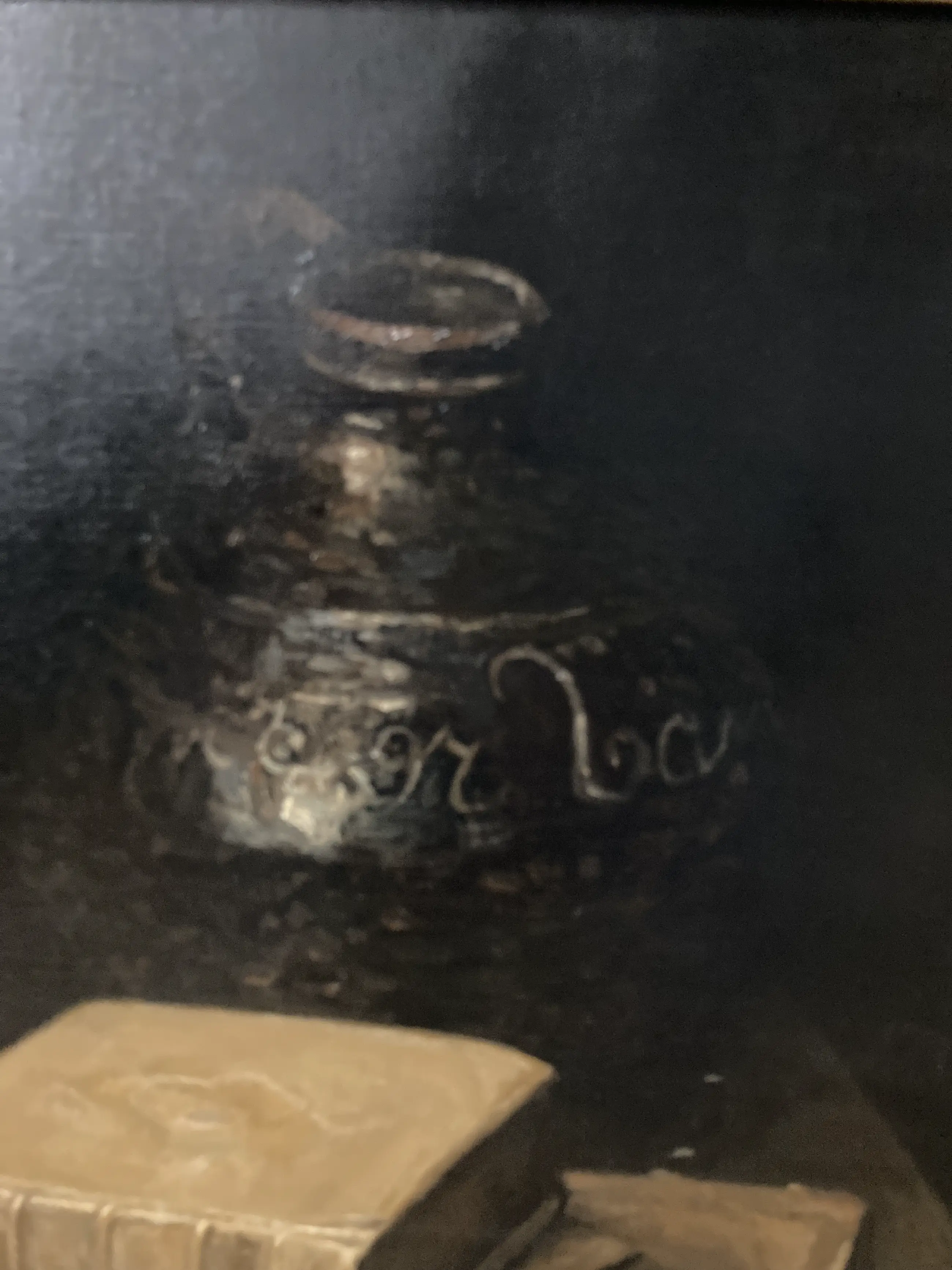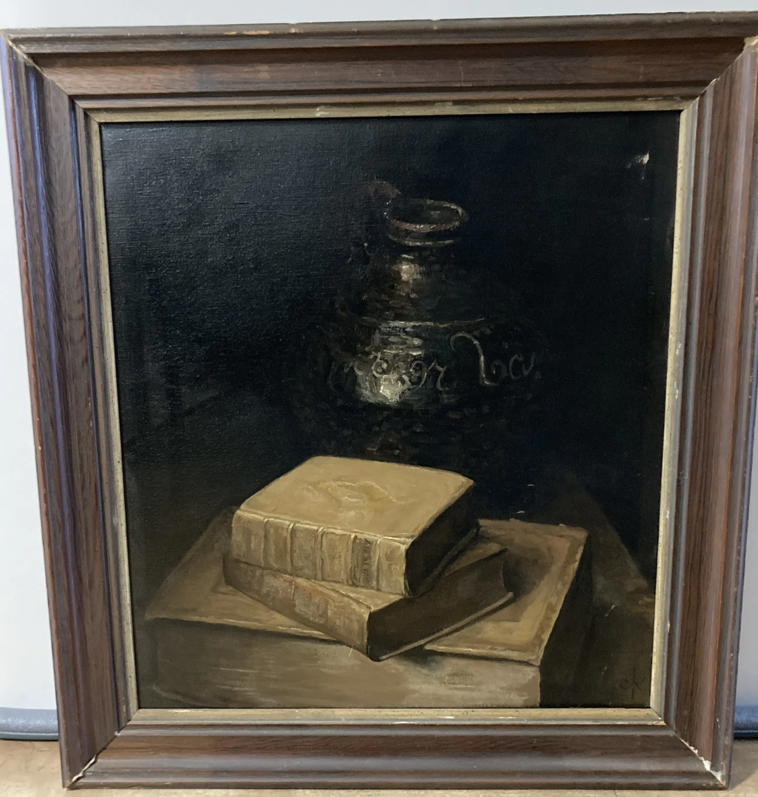 Olieverf schilderij van J C Nachenius, Stilleven, waarbij hij zijn voorliefde voor boeken laat zien. Handgesigneerd. Vermoedelijk geschilderd tijdens de periode dat hij in Garderen woonde.