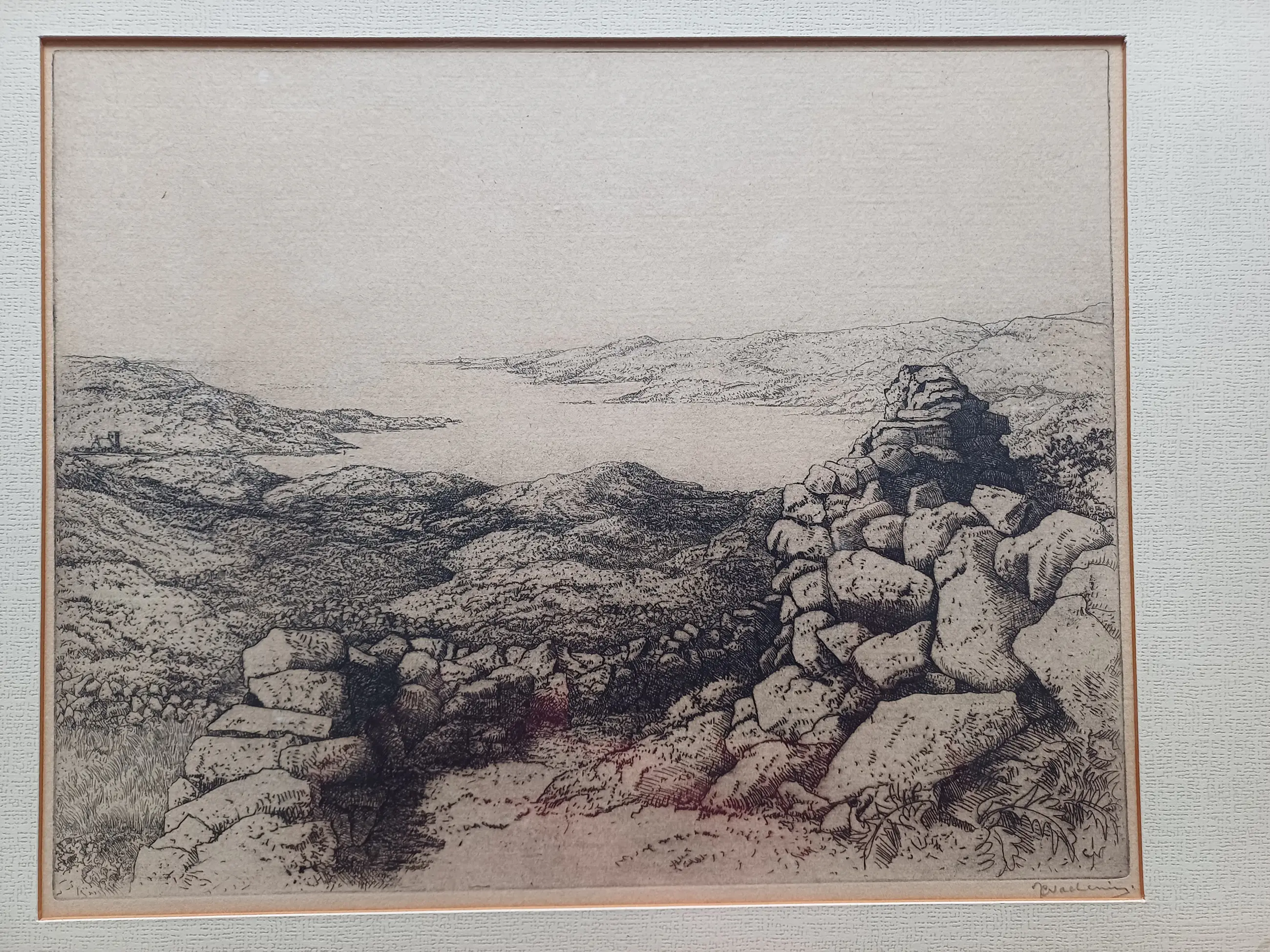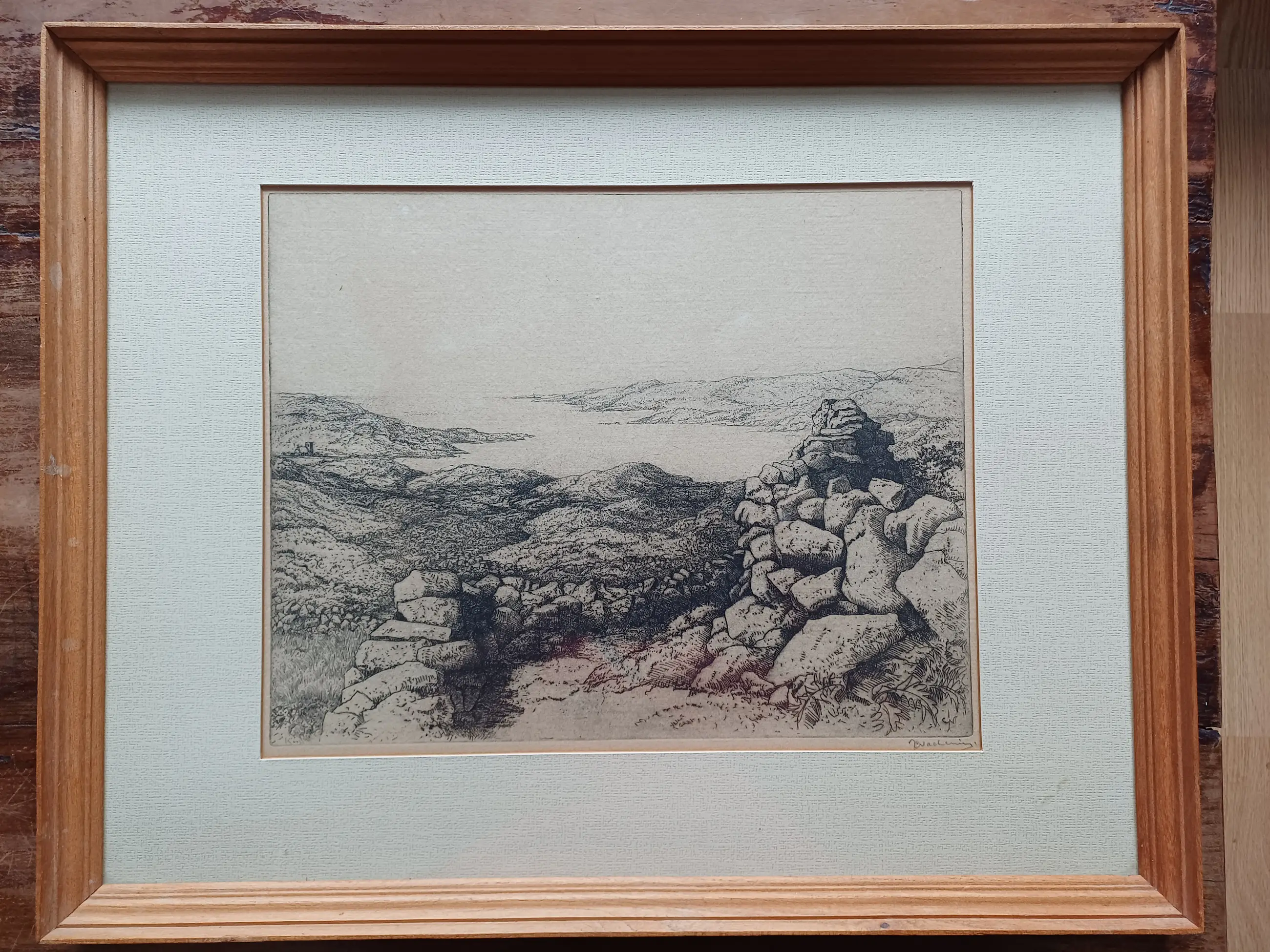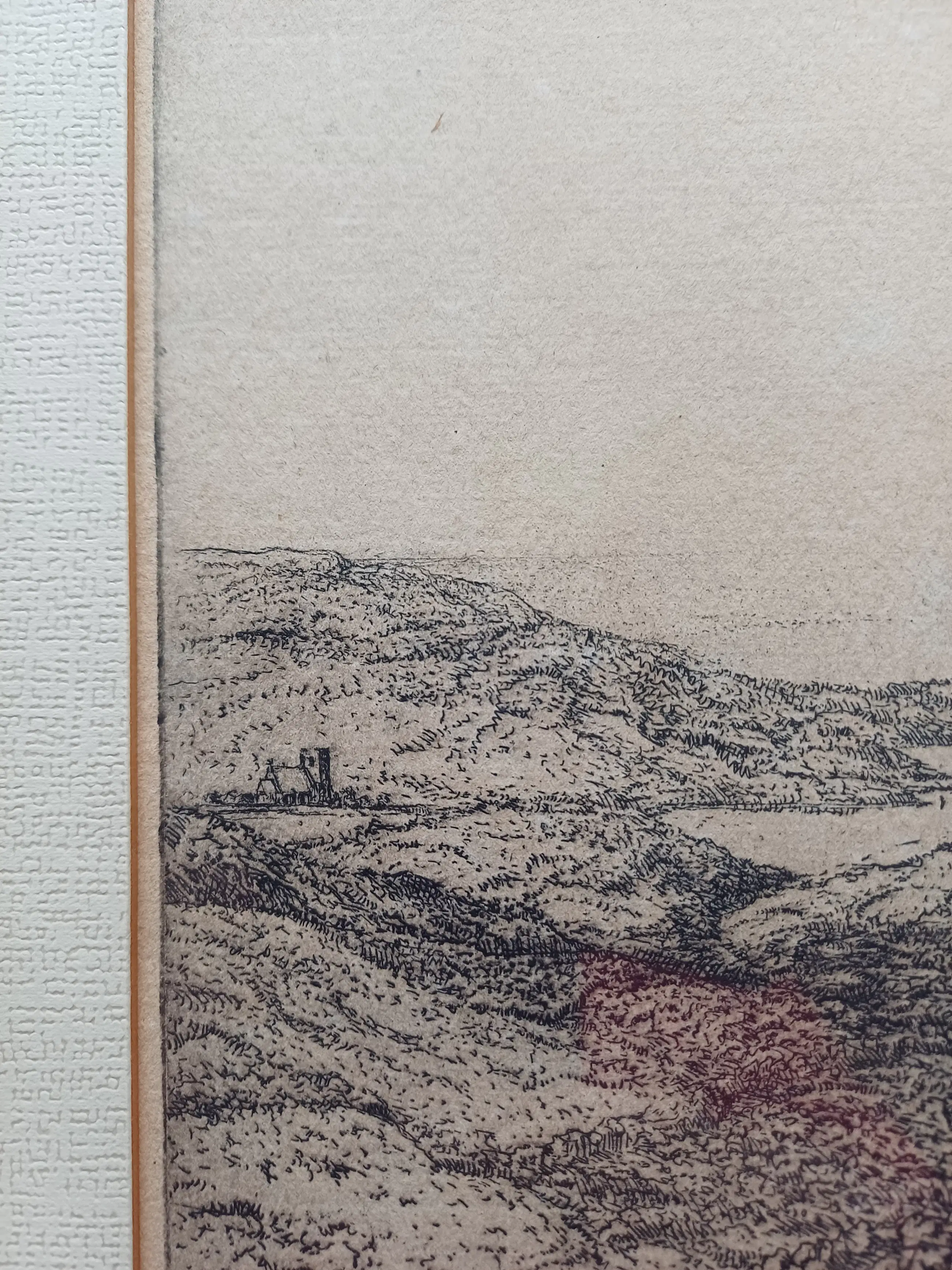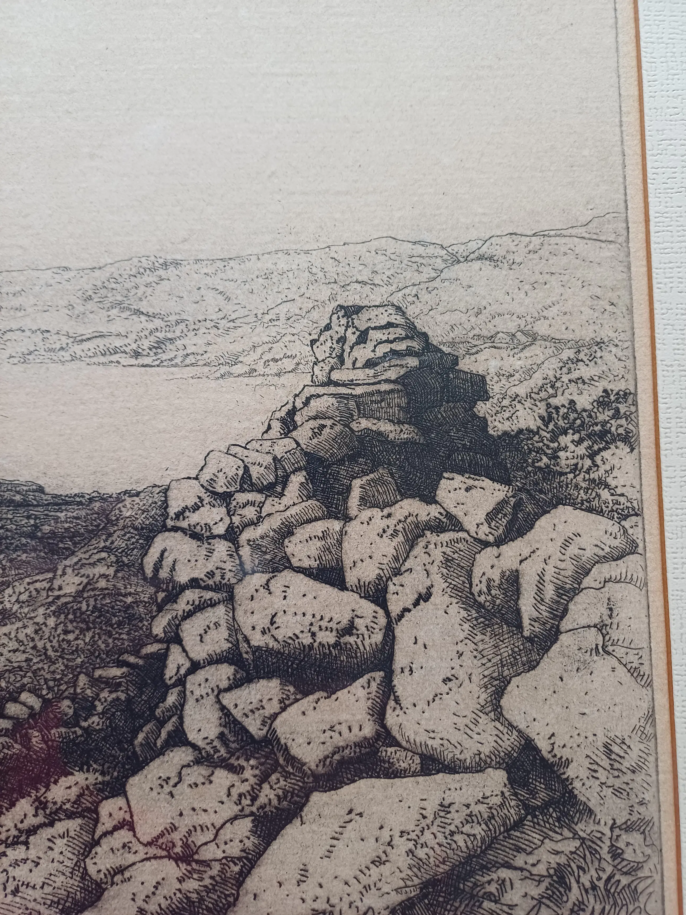 Kust landschap van Jan Coenraad Nachenius. Stenen formatie aan de voorzijde en aan de linkerzijde een huis.