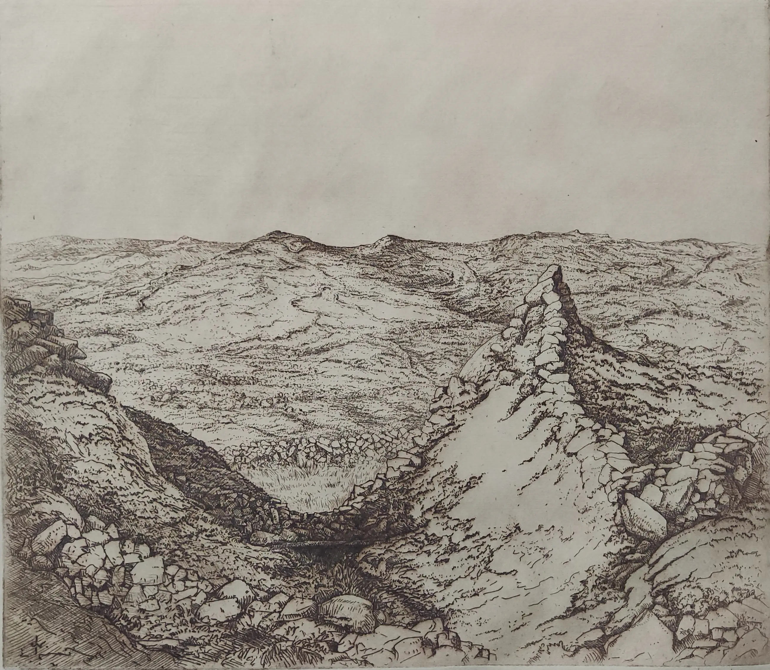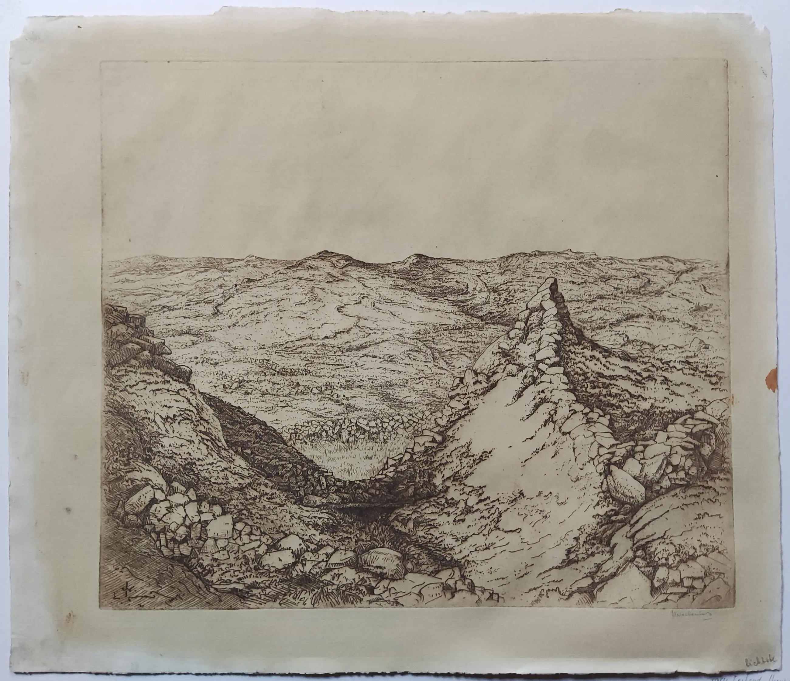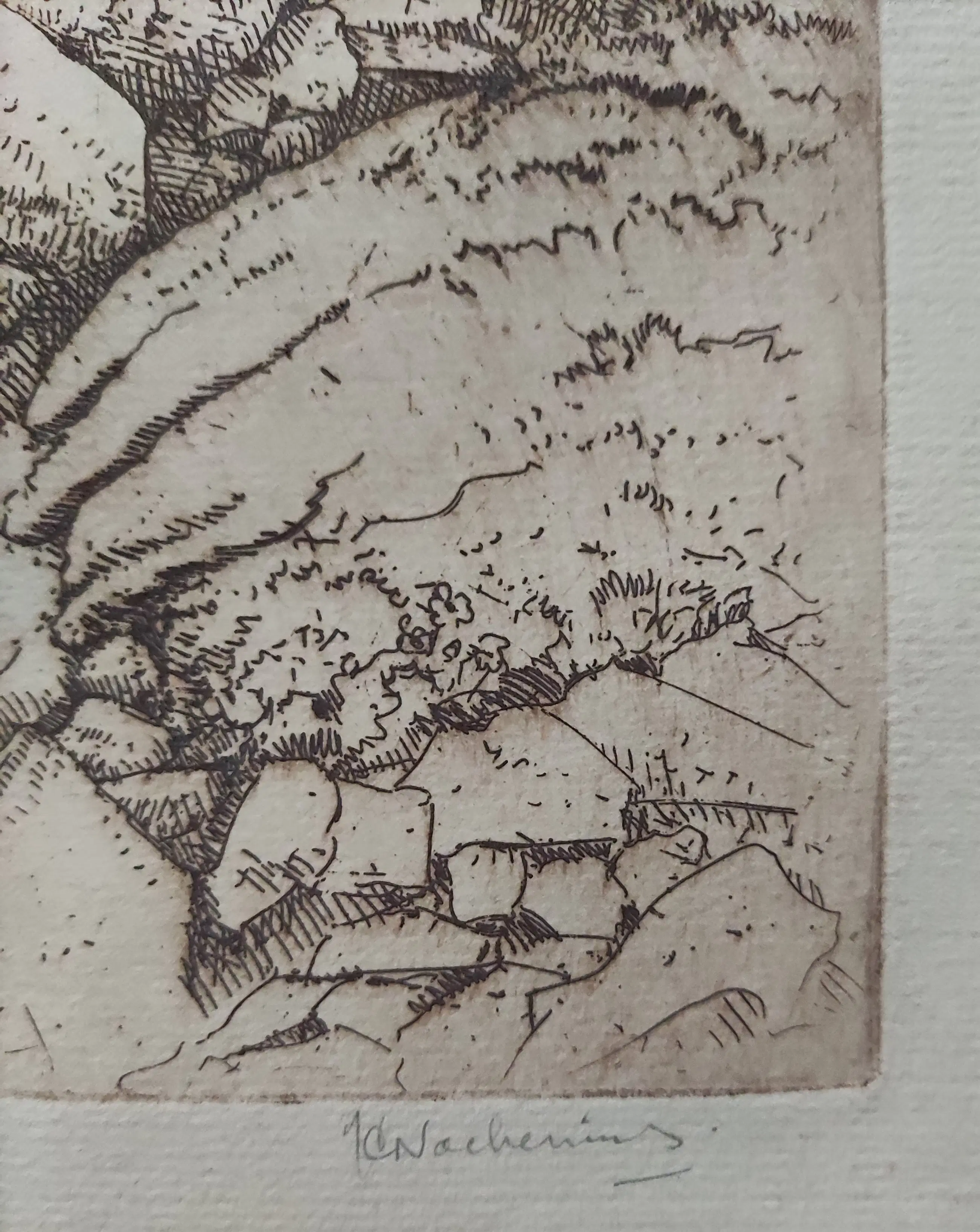 Omschrijving Ets in bruine inkt afgedrukt. Potlood gesigneerd rechtsonder. Monogram in de plaat linksonder. Beeldmaat 36,5x42 cm. Bladmaat 44x51 cm. Losbladig. Jan Coenraad Nachenius werd geboren te Amsterdam op 12 augustus 1890 en overleed te Garderen op 10 maart 1987. Leerling van G.W. Dijsselhof en G.C. Haverkamp. Glaskunstenaar , graficus, schilder en tekenaar. Landschap en stilleven. Lid van de kunstenaarsverenigingen Sint Lucas en De Grafische.