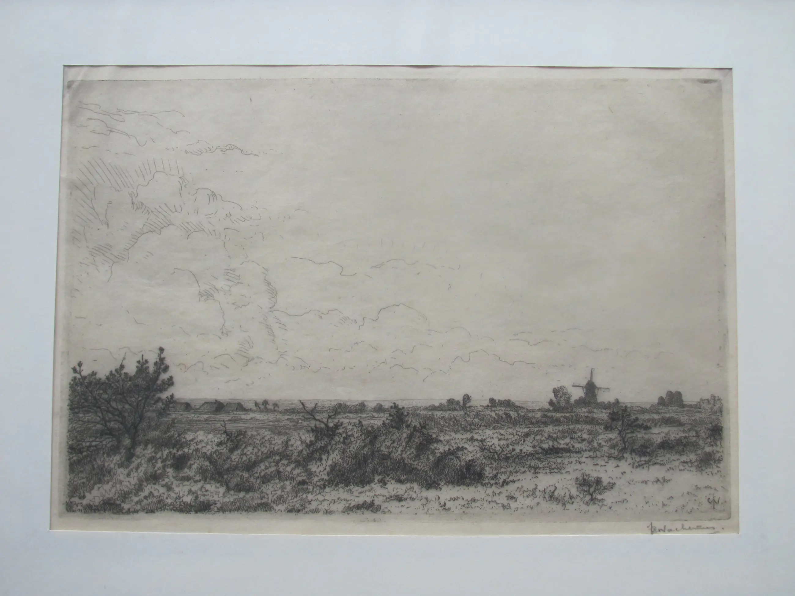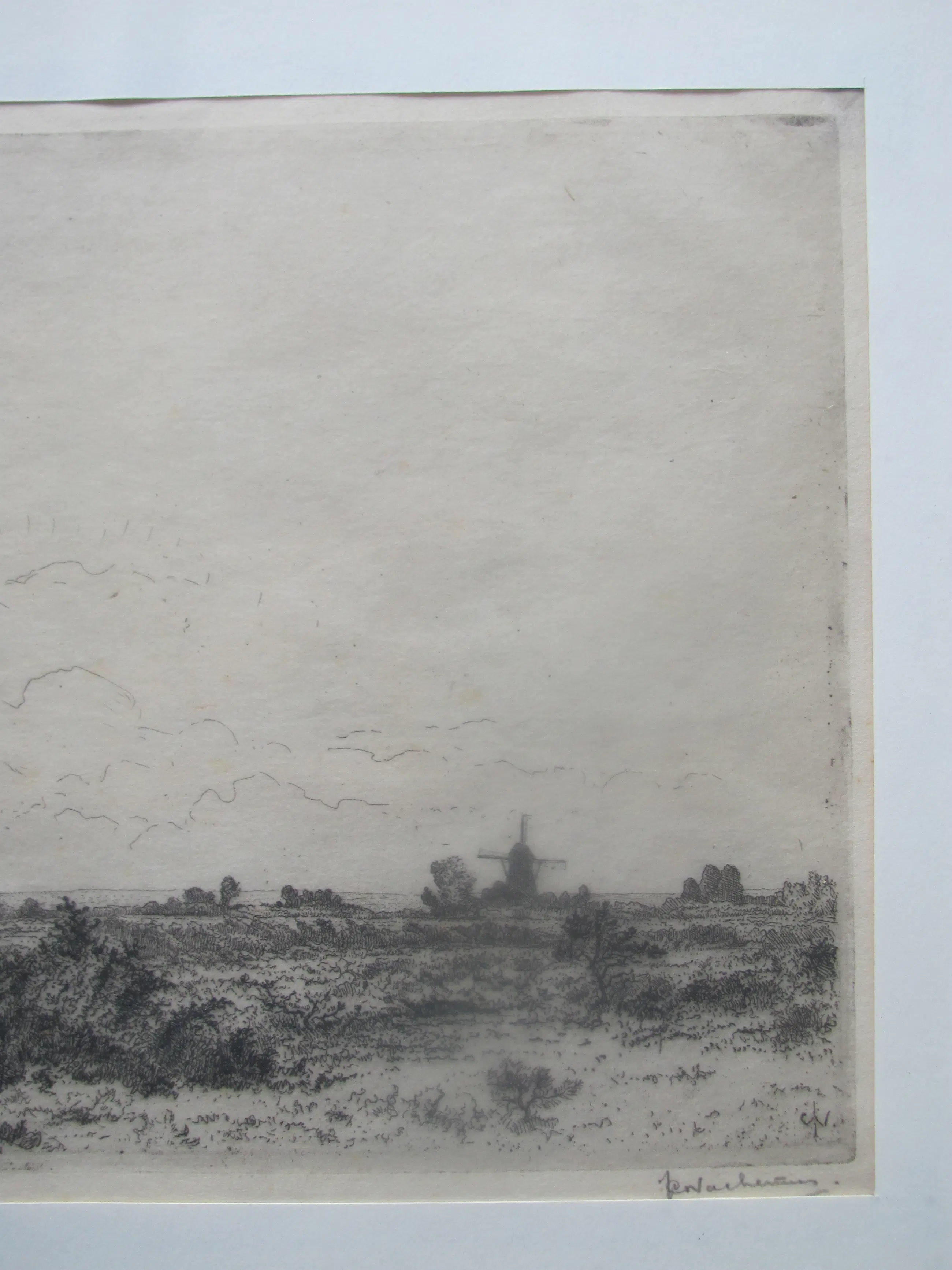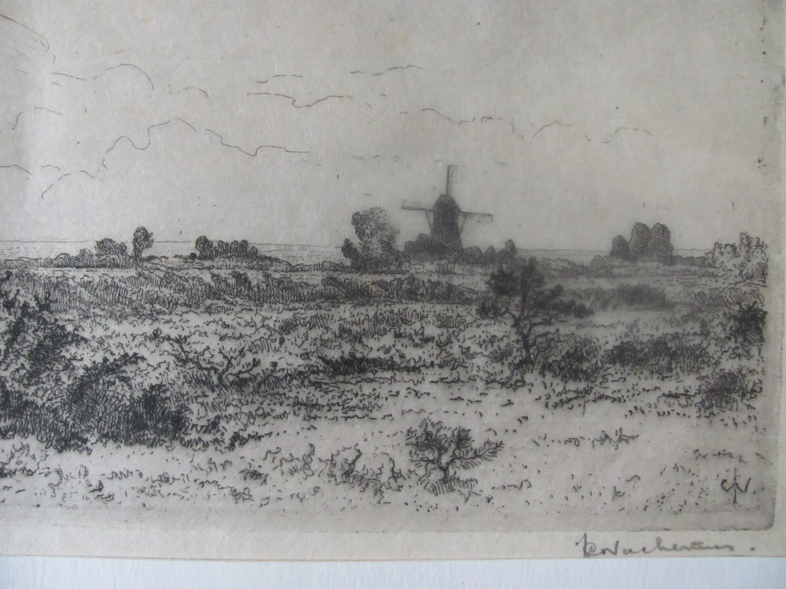Ets op dun rijstpapier van Jan Coenraad Nachenius. Rechtsonder met potlood gesigneerd en ook met monogram in de ets.