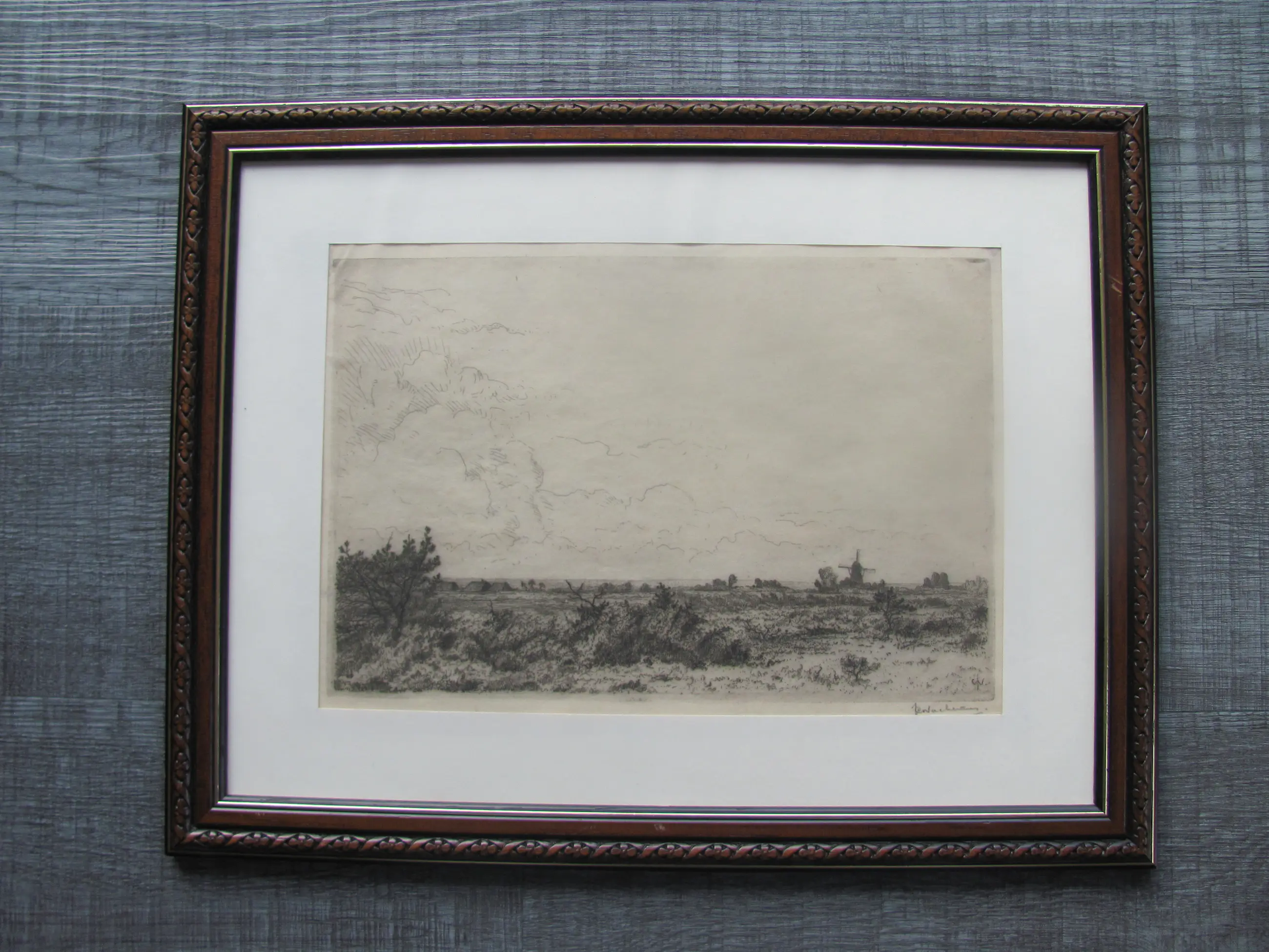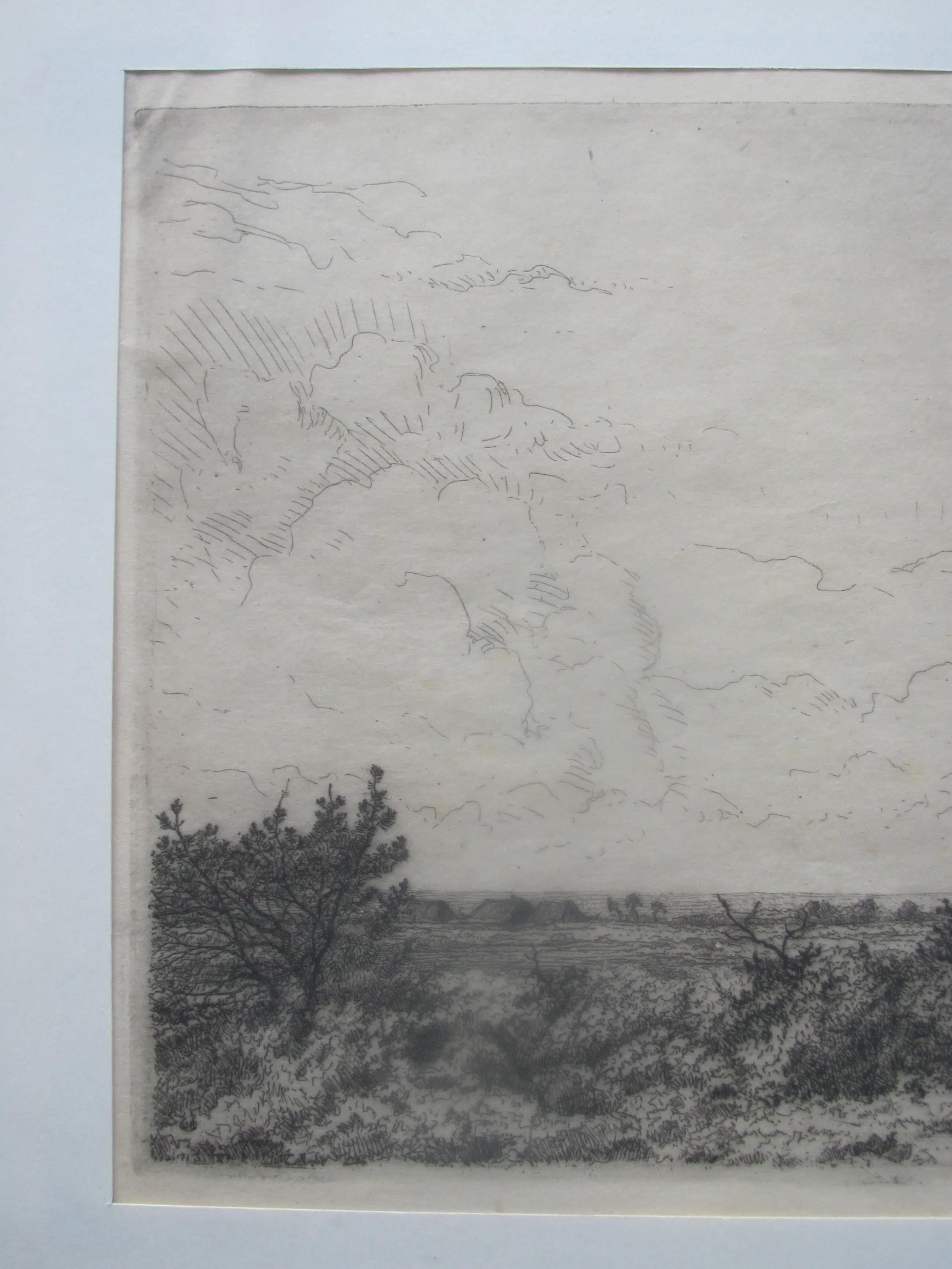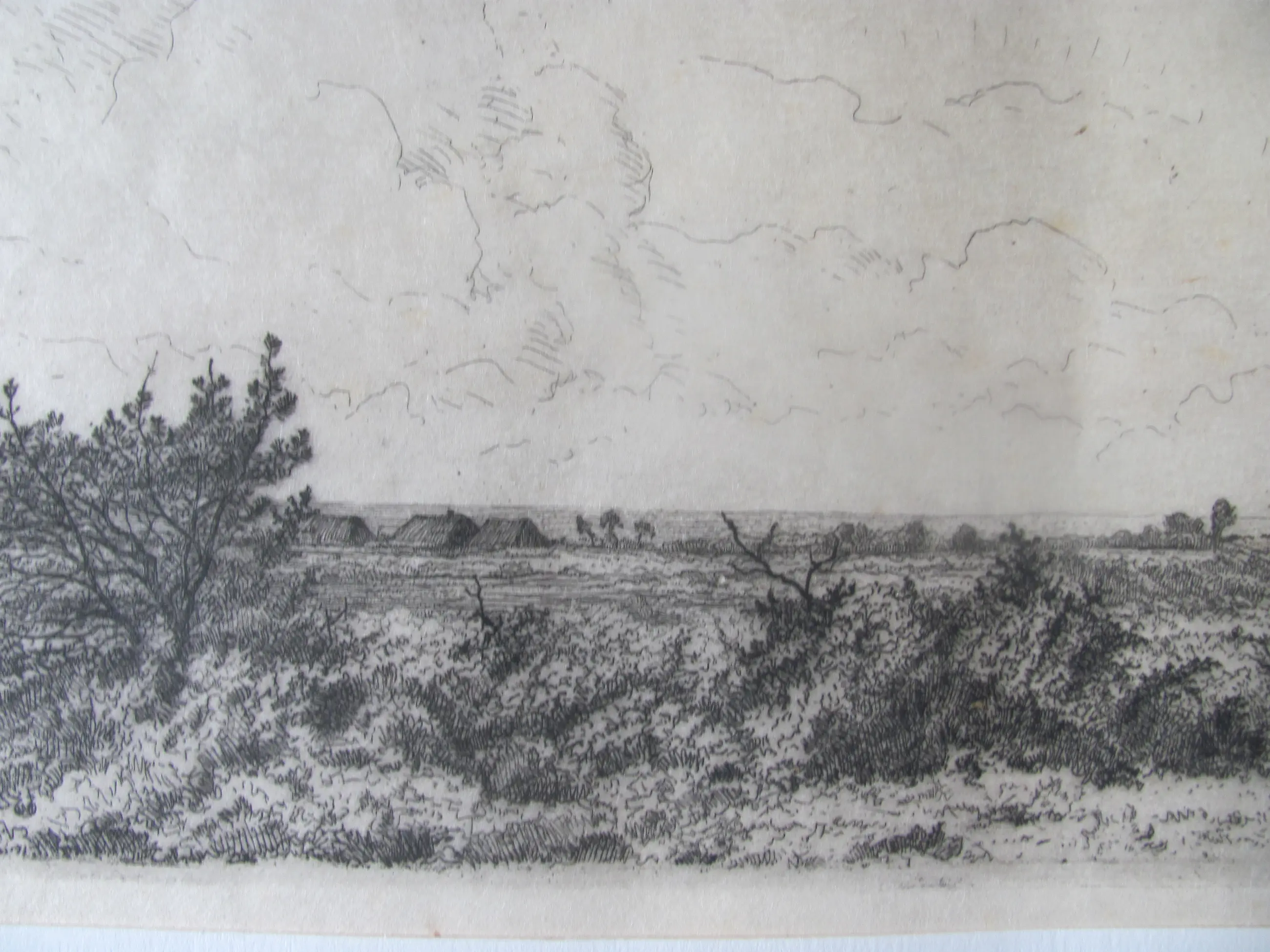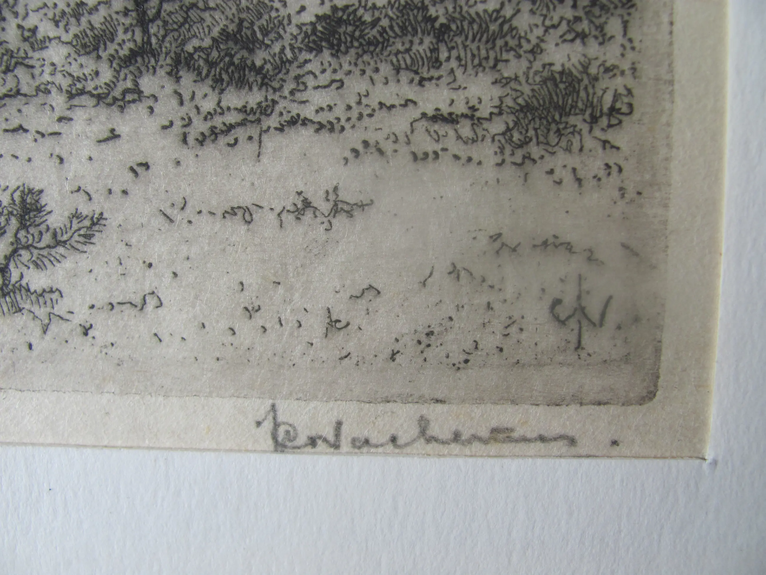 Ets op dun rijstpapier van Jan Coenraad Nachenius. Rechtsonder met potlood gesigneerd en ook met monogram in de ets.