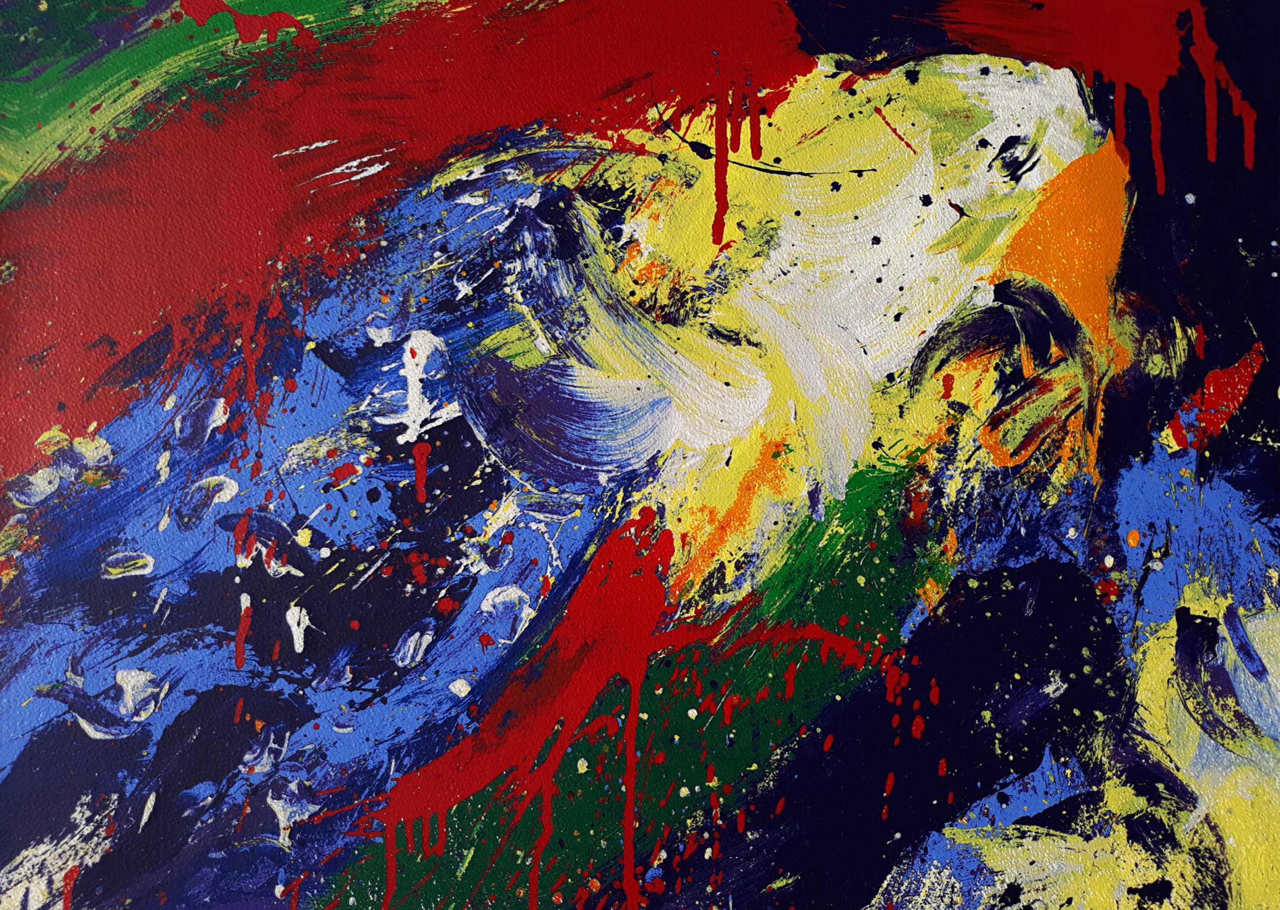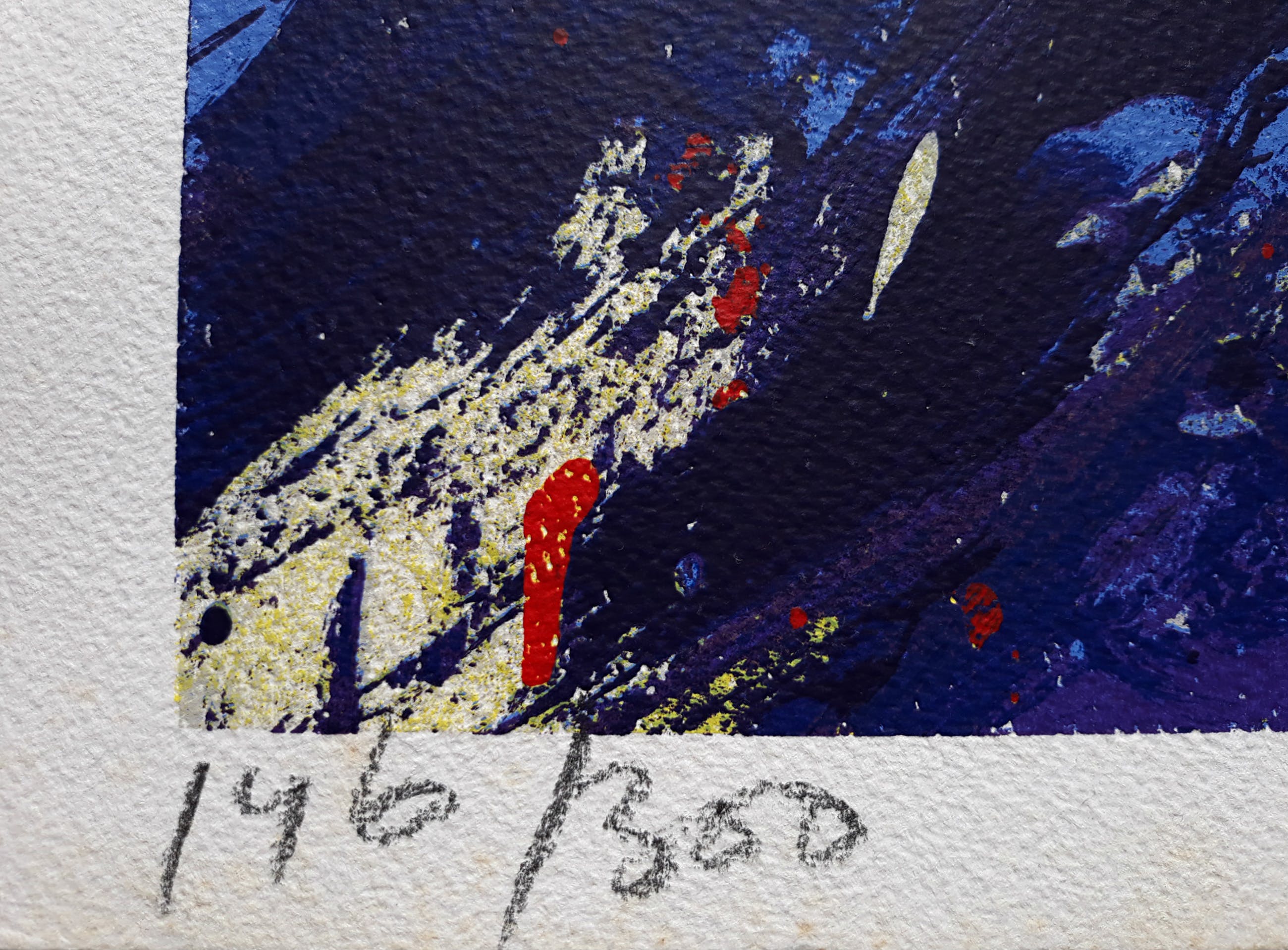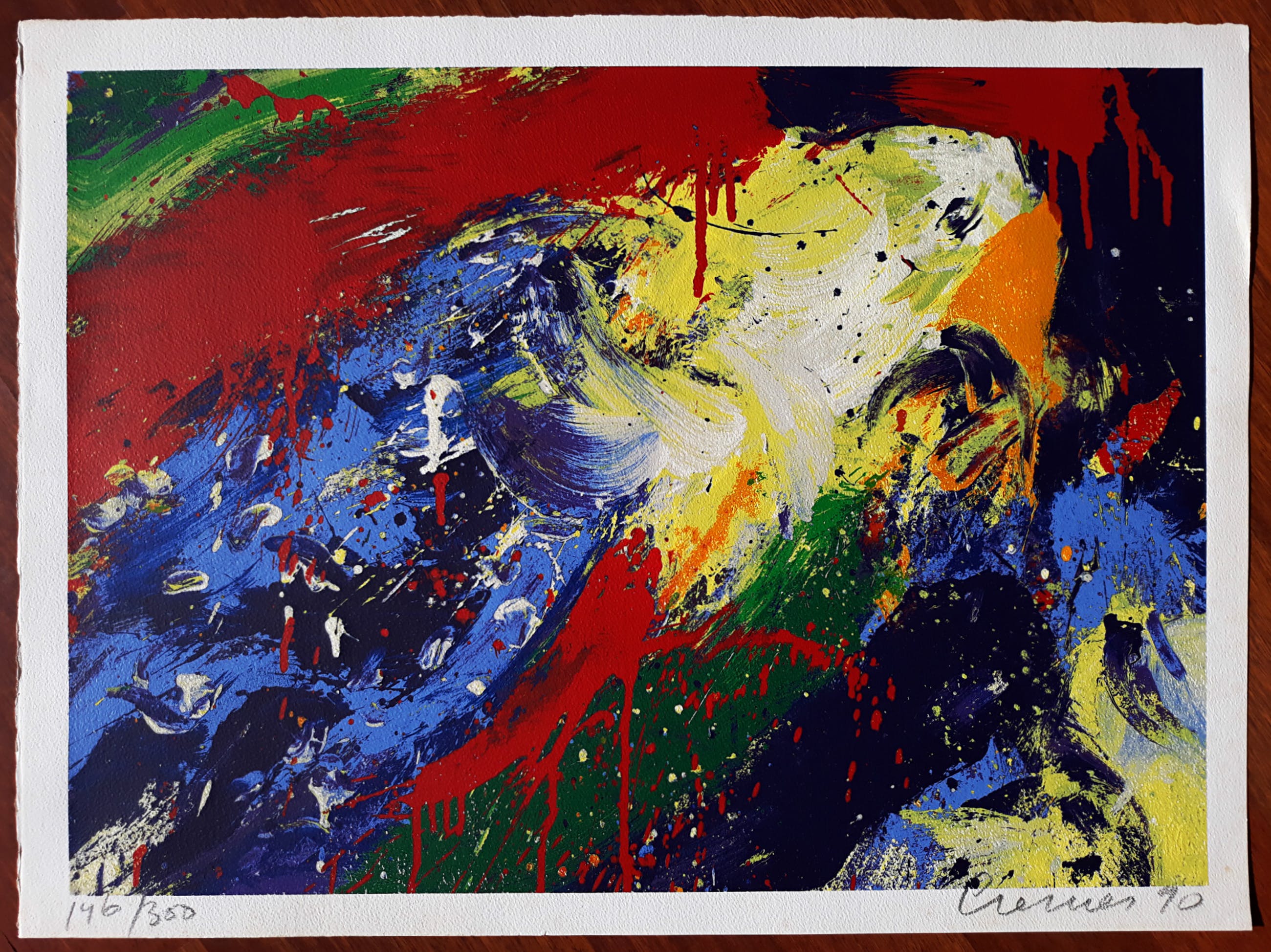 Mooi, kleurrijk werk van Jan Cremer. Zeefdruk op geschept papier (Whatman), met potlood gesigneerd, gedateerd (‘90) en genummerd (146/300). In goede conditie; in de witte marge is op plekken (onderaan en rechts) wel foxing zichtbaar.
