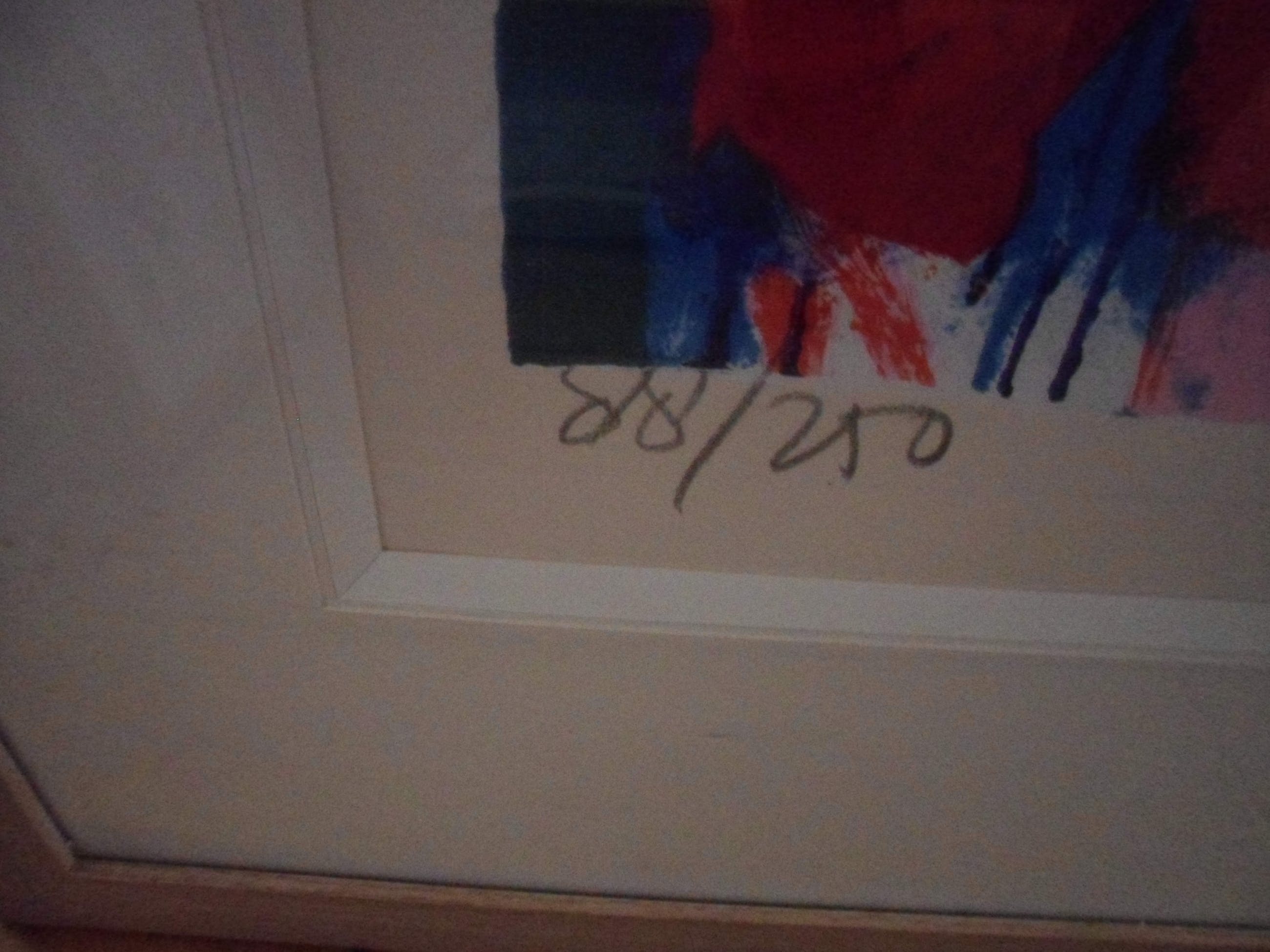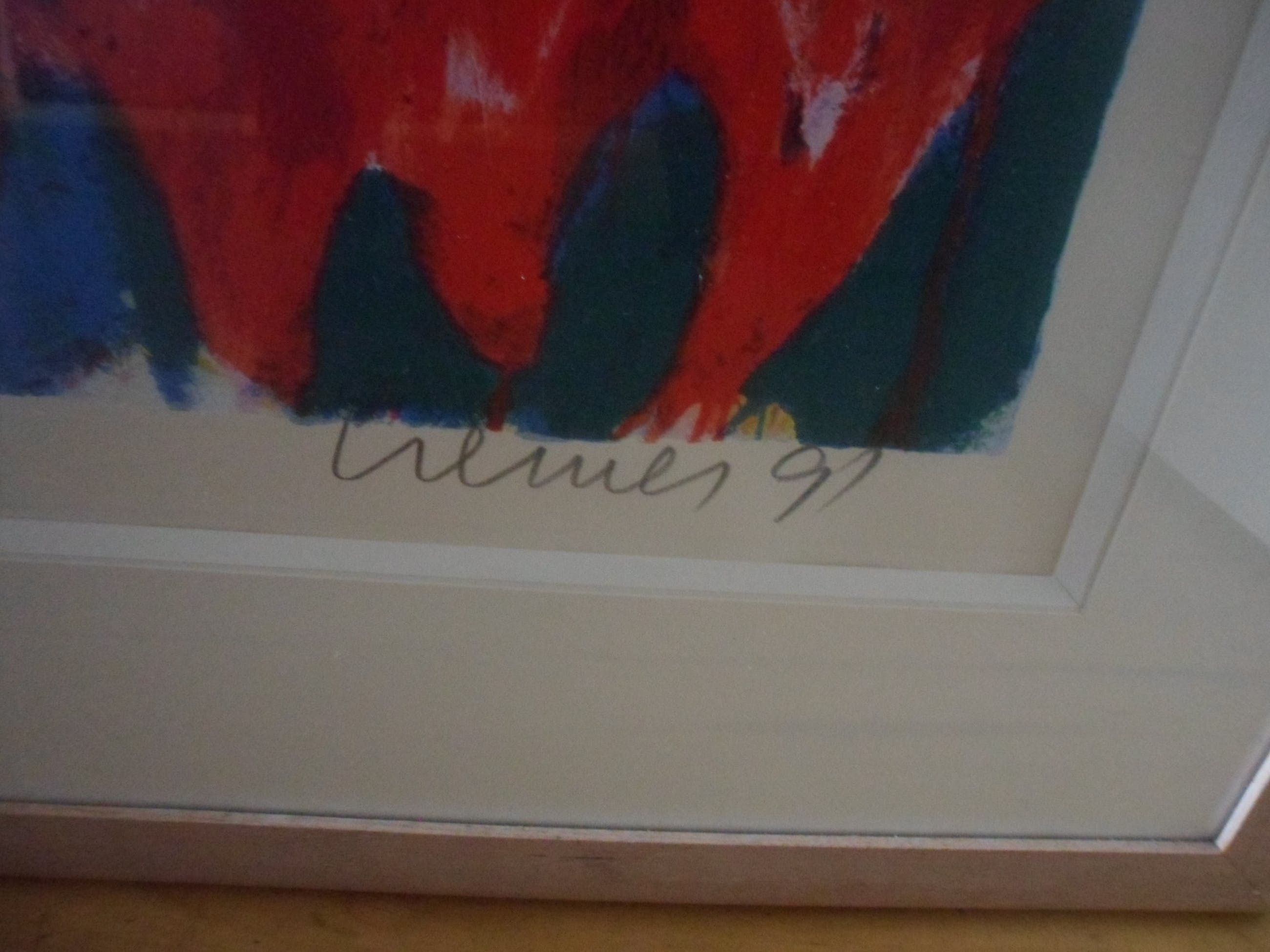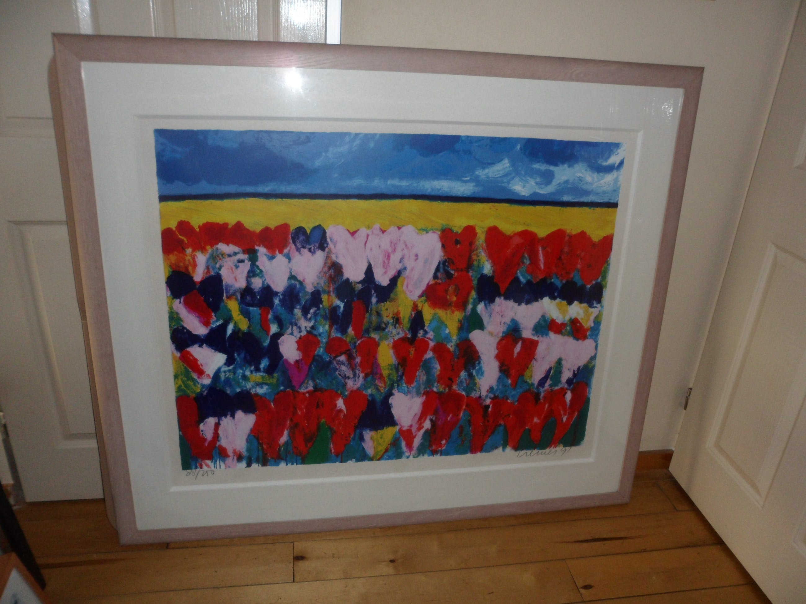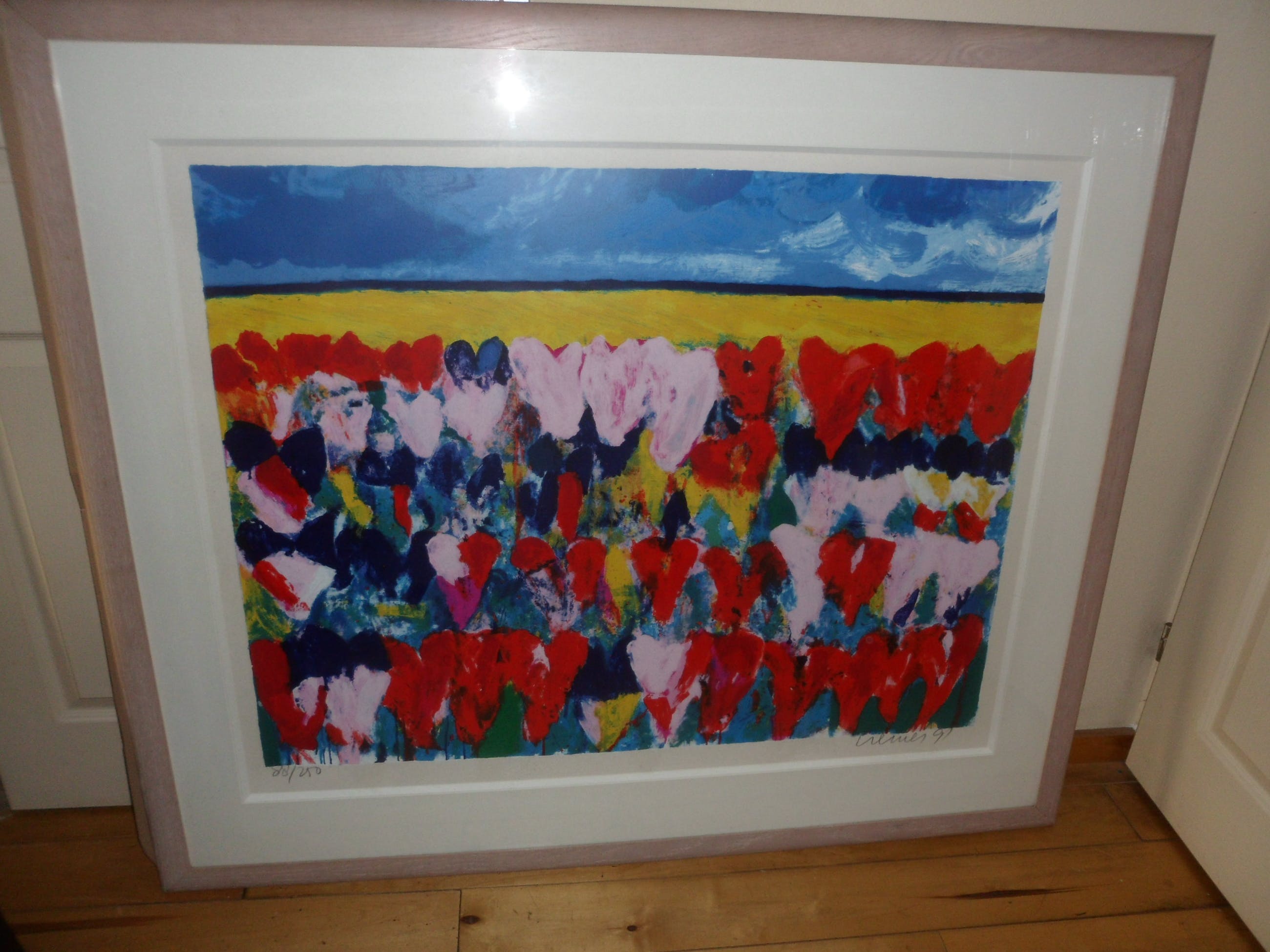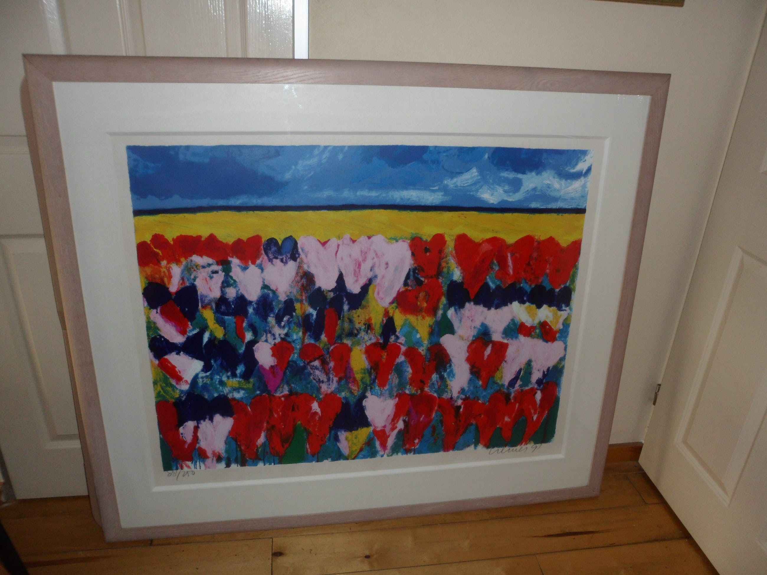 Zeer grote Zeefdruk van Jan Cremer met als formaat 86 x 110 cm in blankhouten lijst van 120 hoog x 138 breed!! Het werk komt uit 1991, is gesigneerd, gedateerd en genummerd 88/250. Titel: "Hollands Glorie"